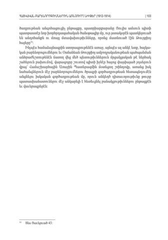 ծադրութեան անգոհացուցիչ ընթացքը պատրիարքարանը Յուլիս ամսուն պիտի , պատրաստէր նոր խորհրդապահական ծանօթագիր մը ուր յստակօրէն պատկերուած , են անդոհանքն ու մռայլ մտավախութիւնները որոնց մատնուած էին Թուրքիոյ , հայերը16: Ինչպէս համաձայնագրին ստորագրութենէն առաջ այնպէս ալ անկէ ետք հայկա , , -կան բարենորոգումներու եւ Օսմանեան Թուրքիոյ ամբողջականութեան պահպանման անհրաժեշտութենէն ճառող վեց մեծ պետութիւններուն մրցակցական թէ ներհակ շահերուն բախումով վարագոյրը շուտով պիտի իջնէր հայոց փայփայած յոյսերուն , վրայ՝ Համաշխարհային Առաջին Պատերազմին մօտեցող շռինդովը առանց իսկ , նահանգներուն մէջ բարենորոգումներու ծրագրի գործադրութեան հետապնդումէն անցնելու իսկական գործադրութեան մը որուն անկեղծ դիտաւորութիւնը թուրք , պատասխանատուներու մէջ անկարելի է հետեւցնել բանակցութիւններու ընթացքէն եւ վաւերագրերէն : 16 Տես Յաւելուած 43:ՀԱՅԿԱԿԱՆ ԲԱՐԵՆՈՐՈԳՈՒՄՆԵՐՈՒՆ ԱՌՆՉՈՒՈՂ ՆԻՒԹԵՐ (1912-1914)| 103