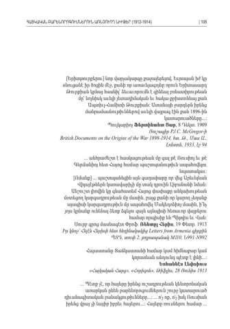 [Երիտթուրքերու նոր վարչակարգը քաջալերելով Եւրոպան իժ կը] , սնուցանէ իր ծոցին մէջ քանի որ առաւելագոյնը որուն Երիտասարդ , Թուրքիան կրնայ հասնիլ՝ ձեւաւորումն է զինեալ բռնատիրութեան մը՝ նոյնիսկ աւելի յետադիմական եւ հակա քրիստոնեայ քան - Ապտիւլ Համիտի Թուրքիան Ատանայի ջարդերն իրենց- : մանրամասնութիւններով աւելի վայրագ էին քան 1896- ինկատարուածները...: Պուլկարիոյ Ֆերտինանտ Ցար , 8 Դեկտ. 1909 Յուշագիր P.J.C. McGregor- իBritish Documents on the Origins of the War 1898-1914, հտ Թ Մաս Ա. ., ., Լոնտոն, 1933, 94 էջ ... անհրաժեշտ է հասկացութեան մը գալ թէ Ռուսիոյ եւ թէ Գերմանիոյ հետ Հայոց համար պաշտպանութիւն ապահովելու նպատակաւ: [Ոմանք] ... պաշտպանեցին այն գաղափարը որ վեց Արեւելեան Վիլայէթներն կառավարիչի մը տակ դրուին Լիբանանի նման : Անշուշտ լիովին կը գնահատեմ Հայոց փափաքը անկախութեան մօտեցող կարգադրութեան մը մասին բայց քանի որ կարող չեղանք . այսպիսի կարգադրութիւն մը ապահովել Մակեդոնիոյ մասին ի՞նչ , յոյս կրնանք ունենալ ձեռք ձգելու զայն այնպիսի հեռաւոր վայրերու համար որպիսիք են Պիթլիս եւ Վան : Սուրբ գրոց մասնագէտ Փրոֆ . Ռենտըլ Հերիս , 19 Փետր. 1913 Իր կնոջ՝ Հելէն Հերիսի հետ հեղինակակից Letters from Armenia գիրքին ՊՏԴ տուփ, 2, թղթապանակ M110, 991-N992 Ն Հայաստանը Տաճկաստանի համար կամ հիմնաքար կամ կորստեան անդունդ պէտք է լինի ...: Եոհաննէս Լեփսիուս «Հայկական Հարց », «Հորիզոն Թիֆլիս», , 28 Յունիս 1913 ... Պէտք չէ որ հայերը իրենց ուշադրութեան կենտրոնական , առարկան ընեն բարենորոգումներուն շուրջ կատարուած դիւանագիտական բանակցութիւնները ...: ... , ո՛չ ոք ո՛չ իսկ Ռուսիան իրենց վրայ չի նայիր իբրեւ հայերու ...: Հայերը ռուսներու համար ... ՀԱՅԿԱԿԱՆ ԲԱՐԵՆՈՐՈԳՈՒՄՆԵՐՈՒՆ ԱՌՆՉՈՒՈՂ ՆԻՒԹԵՐ (1912-1914)| 105