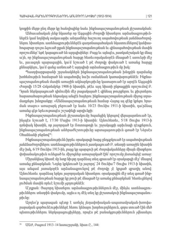 կողքին մերթ ընդ մերթ կը հանդիպինք նաեւ ինքնապաշտպանութեան յիշատակման : Անհաւանական չենք նկատեր որ Ազգային Ժողովի նիստերու արձանագրութիւն -ներէն կամ նոյնիսկ սակաւաթիւ անդամներ հաշուող ապահովութեան յանձնաժողով -ներու նիստերու ատենագրութիւններէն գաղտնապահական նկատումներով կանխա -հոգաբար դուրս ձգուած ըլլան ինքնապաշտպանութեան եւ զինապահովութեան մասին որոշումներ՝ եթէ կայացուած են այդպիսիներ Բայց եւ այնպէս յատկանշական կը մնայ : , ա՛յն որ ինքնապաշտպանութեան հարցը հետեւողականօրէն մնացած է ստուերի մէջ, եւ լաւագոյն պարագային կա՛մ նշուած է թէ ժողովը փակուած է առանց հարցը, , քննարկելու կա՛մ զանց առնուած է այդպիսի արձանագրութիւն մը իսկ, : Պատրիարքարանի շրջանակներն ինքնապաշտպանութեան խնդրին դարմանը խոհեմութիւն համարած են ապահովել նա՛խ օսմանեան կառավարութենէն Ինքնա : -պաշտպանութեան մասին առաջին ակնարկութիւնը կատարուած էր արդէն Ազգային Ժողովի 15/28 Հոկտեմբեր 1908- ի նիստին թէեւ այդ նիստի ընթացքին որոշումով Բ, . Դրան ներկայացուած դիմումին մէջ բացակայած է զինեալ թուրքերու եւ քիւրտերու հարստահարութեան ենթակայ անզէն հայերու ինքնապաշտպանութեան միջոց տրա -մադրելու խնդրանքը Անձնապաշտպանութեան համար Հայոց ալ զէնք կրելու հրա : « -ման տալու առաջարկ բերուած էր նաեւ » 10/23 Յունիս 1911- ի նիստին դա՛րձեալ, առանց գէթ երեւութապէս շօշափելի արդիւնքի : Ինքնապաշտպանութեան յիշատակումը հպանցիկ կերպով վերայայտնուած էր , ինչպէս նշուած է , 17/30 Մայիս 1913- ի նիստին Այնուհետեւ: , 5/18 Յուլիս 1913- իդռնփակ նիստին որ յաջորդած էր Ռոտոսթոյի եւ շրջակայքի արիւնալի դէպքերուն , , ինքնապաշտպանութեան անհրաժեշտութիւնը արտայայտութիւն գտած էր Ներսէս Օհանեանի բերնով 36: Ինքնապաշտպանութիւնն իբրեւ օրակարգի հարց ընդգրկուած էր ապահովութեան յանձնաժողովներու ատենագրութիւններուն յատկացուած Բ տետրի առաջին նիստին . մէջ իսկ , 6/19 Յունիս 1913- , ին բայց կը պարզուի թէ ժողովականները միայն միտքերու փոխանակութիւն ունեցած եւ միջոցներ առաջարկած էին՝ որոշումը յետաձգելէ առաջ : Միջանկեալ նիստէ մը ետք նիւթը դարձեալ տեղ գրաւած էր օրակարգի մէջ՝ մնալով առանց քննարկման Նոյնը կրկնուած էր յաջորդ՝ : 24 Յունիս Յուլիս/7 1913- ի նիստին, այս անգամ յստակօրէն արձանագրուելով թէ ժողովը չէ կրցած զբաղիլ անով : Այնուհետեւ դարձեալ երկու յաջորդական նիստերու օրակարգին մէջ տեղ գտած ինք -նապաշտպանութեան հարցը կը թուի թէ մնացած էր առանց քննարկման՝ հետեւցնելով լուծման մասին որեւէ նշումի չգոյութենէն : Ա՛յդքան Յաջորդ նիստերու արձանագրութիւններուն մէջ մինչեւ ատենագրու: , -թիւններու տետրին փակումը այլեւս ոչ մէկ տեղ կը յիշատակուի ինքնապաշտպանու , -թիւնը: Արդեօ՞ք պարագան պէտք է առնչել յեղափոխական ապստամբական խռովա -- -րարական գործունէութիւններէ հեռու կենալու խորհուրդներուն զորս տուած էին մեծ , պետութիւններու ներկայացուցիչները որպէս թէ բանակցութիւններուն չվնասելու , 36 ԱԱԺ Բացում, 1913–14 նստաշրջանի նիստ Ը, ., 144:ՀԱՅԿԱԿԱՆ ԲԱՐԵՆՈՐՈԳՈՒՄՆԵՐՈՒՆ ԱՌՆՉՈՒՈՂ ՆԻՒԹԵՐ (1912-1914)| 121