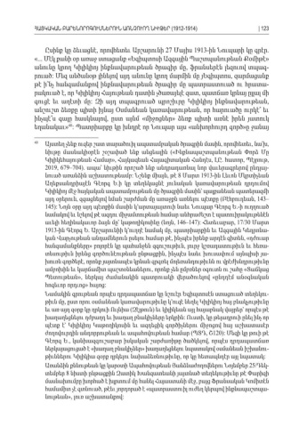 Ըսինք կը ձեւացնէ որովհետեւ Արշարունի , 27 Մայիս 1913- ին Նուպարի կը գրէր . «... Մէկ քանի օր առաջ ստացանք Եգիպտոսի Ազգային Պաշտպանութեան Քօմիթէ « » անունը կրող Կիլիկիոյ ինքնավարութեան ծրագիր մը ֆրանսերէն լեզուով տպագ , -րուած Մեզ անծանօթ լինելով այդ անունը կրող մարմին մը յԵգիպտոս զարմացանք: , թէ ի՞նչ հանգամանքով ինքնավարութեան ծրագիր մը պատրաստուած ու հրատա -րակուած է որ Կիլիկիոյ Հայութեան դատին չծառայելէ զատ պատճառ կրնայ ըլլալ մի , , գուցէ եւ աղէտի մը Զի այդ տպագրուած պրոշիւրը Կիլիկիոյ ինքնավարութեան : , անշուշտ ձեռքը պիտի իյնայ Օսմանեան կառավարութեան որ հարուածը ուրկէ՞ եւ , ինչպէ՞ս գալը հասկնալով ըստ այնմ միջոցներ ձեռք պիտի առնէ իրեն յատուկ , «» եղանակաւ» : 40Պատրիարքը կը խնդրէ որ Նուպար այս անխորհուրդ գործ ը ջանայ « » 40 Այստեղ չենք ուզեր շատ տարածուիլ ապստամբական ծրագրին մասին որովհետեւ նա՛խ , , , նիւթը մասնակիօրէն շօշափած ենք անցեալին («Ինքնապաշտպանութեան Փորձ Մը Կիլիկեհայութեան Համար Հայկազեան Հայագիտական Հանդէս ԼԸ հատոր Պէյրութ », , . , , 2019, 679–704). ապա՝ նիւթին որոշած ենք անդրադառնալ նոր վաւերագրերով ընդլայ -նուած առանձին աշխատութեամբ Նշենք միայն թէ Մարտ : , 8 1913- ին Լեւոն Մկրտիչեան Աղեքսանդրիայէն Գէորգ Ե ի կը տեղեկացնէ յունական կառավարութեան դրդումով . Կիլիկիոյ մէջ հայկական ապստամբութեան մը ծրագրին մասին՝ պալքանեան պատերազմի այդ օրերուն զգացնելով նման շարժման մը առաջքն առնելու պէտքը Բէհբուդեան , (, 143–145): Նոյն օրը այդ պէտքին մասին կ՚արտայայտուի նաեւ Նուպար Գէորգ Ե ի ուղղուած .- նամակով եւ նշելով թէ ազդու միջամտութեան համար անհրաժեշտ է պատուիրակութենէն աւելի հեղինակաւոր ձայն մը՝ կաթողիկոսինը նոյն (, 146–147): Հետեւաբար, 17/30 Մարտ 1913- ին Գէորգ Ե Արշարունիի կ՚ուղղէ նամակ մը պատրիարքին եւ Ազգային Կեդրոնա . , -կան Վարչութեան անդամներուն ըսելու համար թէ ինչպէս իրենք արդէն գիտեն դժուար , , « հանգամանքները բոլորէն կը պահանջեն զգուշութիւն լուրջ կշռադատութիւն եւ հեռա» , -տեսութիւն իրենց գործունէութեան ընթացքին ինչպէս նաեւ խուսափում այնպիսի յա , -խուռն գործերէ որոնք յայտնապէս կրնան գրգռել մոլեռանդութիւնն ու վրէժխնդրութիւնը , ամբոխին եւ կարճամիտ պաշտօնեաներու որոնք չեն ըմբռներ օգուտն ու շահը Տաճկաց , « Պետութեան», ներկայ ժամանակին պատրուակի վերածուելով ընդդէմ անօգնական « հոգեւոր որդւոց հայոց » : Նամակին գրութեան որպէս դրդապատճառ կը նշուէր Եգիպտոսէն ստացուած տեղեկու -թիւն մը ըստ որու օսմանեան կառավարութիւնը կ՚ուզէ նեղել Կիլիկիոյ հայ բնակչութիւնը , եւ առ այդ զօրք կը ղրկուի Ուլնիա Զէյթուն եւ կիլիկեան այլ հայաբնակ վայրեր՝ որպէս թէ () խաղաղեցնելու դժբաղդ եւ խաղաղ բնակիչները երկրին Ուստի կը թելադրուի ընել ինչ որ : , պէտք է՝ Կիլիկիոյ Կաթողիկոսին եւ ազդեցիկ գործիչներու միջոցով հայ աշխատասէր ժողովուրդին անդորրութեան եւ ապահովութեան համար ՊՏԴ Շ (, 120): Մեզի կը թուի թէ Գէորգ Ե կանխազգուշաբար իսկական շարժառիթը ծածկելով որպէս դրդապատճառ ., , ներկայացուցած է խաղաղ բնակիչներ խաղաղեցնելու նպատակով օսմանեան իշխանու « » -թիւններու Կիլիկիա զօրք ղրկելու նախաձեռնութիւնը որ կը հետապնդէր այլ նպատակ , : Առանձին քննութեան կը կարօտի Ապահովութեան Յանձնաժողովներու Նոյեմբեր 25/Դեկ -տեմբեր նիստի ընթացքին Զատիկ Խանզատեանի յայտնած տեղեկութիւնը թէ Փարիզի 8 մասնախումբը խորհած է խլրտում մը հանել Հայաստանի մէջ բայց Ֆրանսական Կոմիտէն , համամիտ չէ գտնուած թէեւ յորդորած է պատրաստուիլ ուժեղ կերպով ինքնապաշտպա , « -նութեան լուռ աշխատանքով», : ՀԱՅԿԱԿԱՆ ԲԱՐԵՆՈՐՈԳՈՒՄՆԵՐՈՒՆ ԱՌՆՉՈՒՈՂ ՆԻՒԹԵՐ (1912-1914)| 123