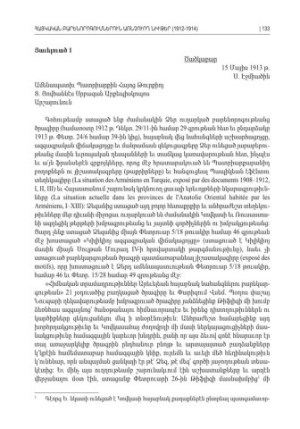 Յաւելուած 1 Ծածկաբար 15 Մայիս 1913 . թՍ Էջմիածին. Ամենապատիւ Պատրիարքին Հայոց Թուրքիոյ Տ Յովհաննէս Սրբազան Արքեպիսկոպոս. Արշարունուն Գոհութեամբ ստացած ենք ժամանակին Ձեր ուղարկած բարենորոգութեանց ծրագիրը համառօտը ( 1912 . թ Դեկտ. 29/11- ին համար 29 գրութեան հետ եւ ընդարձակը 1913 . թ Փետր. 24/6 համար 39- ին կից հայաբնակ վեց նահանգների աշխարհացոյցը), , ազգագրական վիճակացոյցը եւ մանրամասն զեկուցագրերը Ձեր ունեցած յարաբերու -թեանց մասին եւրոպական դեսպանների եւ տաճկաց կառավարութեան հետ ինչպէս , եւ ա՛յն ֆրանսերէն գրքոյկները որոց մէջ հրատարակուած են Պատրիարքարանիդ , բողոքներն ու յիշատակագրերը թաքրիրները եւ հանգուցեալ Պապիկեան էֆէնտու () տեղեկագիրը (La situation des Arméniens en Turquie, exposé par des documents 1908–1912, I, II, III) եւ Հայաստանում շարունակ կրկնուող ցաւալի երեւոյթների նկարագրութիւն -ները (La situation actuelle dans les provinces de l'Anatolie Oriental habitée par les Arméniens, I–XIII): Ձեզանից ստացած այդ բոլոր հետաքրքիր եւ անհրաժեշտ տեղեկու -թիւնները մեր դիւանի միջոցաւ ուղարկուած են ժամանակին Կովկասի եւ Ռուսաստա -նի ազդեցիկ թերթերի խմբագրութեանց եւ յայտնի գործիչներին ու խմբակցութեանց : Ցարդ չենք ստացած Ձեզանից միայն Փետրուար 5/18 թուակիր համար 46 գրութեան մէջ խոստացած Կիլիկիոյ ազգագրական վիճակացոյցը « » (ստացուած է Կիլիկիոյ մասին միայն Սուլթան Մուրադ IV- ի հրովարտակի թարգմանութիւնը ), նաեւ չի ստացուած բարեկարգութեան ծրագրի պատճառաբանեալ յիշատակագիրը (exposé des motifs), որը խոստացուած է Ձերդ ամենապատւութեան Փետրուար 5/18 թուակիր, համար 46 եւ Փետր. 15/28 համար 49 գրութեանց մէջ : «Հիմնական տրամադրութիւններ Արեւելեան հայաբնակ նահանգներու բարեկար -գութեան» 21 յօդուածից բաղկացած ծրագիրը եւ Փարիզում Վսեմ Պօղոս փաշայ . Նուպարի ղեկավարութեամբ խմբագրուած ծրագիրը յանձնեցինք Թիֆլիզի մի խումբ ձեռնհաս ազգայնոց՝ ծանօթանալու հիմնաւորապէս եւ իրենց դիտողութիւններն ու կարծիքները զեկուցանելու մեզ ի տնօրէնութիւն Անհրաժեշտ համարեցինք այդ : խորհրդակցութիւնը եւ Կովկասահայ ժողովրդի մի մասի ներկայացուցիչների մաս -նակցութիւնը համազգային կարեւոր խնդրին քանի որ այս ձեւով գոնէ հնարաւոր էր , տալ առաջարկելիք ծրագրին ընդհանուր բնոյթ եւ արտայայտած բաղձանքները կ՚կրէին համեմատաբար համազգային կնիք ուրեմն եւ աւելի մեծ հեղինակութիւն , կ՚ունենար որն անպայման ցանկալի էր թէ՛ Ձեզ թէ մեզ՝ գործի յաջողութեան տեսա, , -կէտից Եւ մինչ այս ուղղութեամբ շարունակւում էին աշխատանքները եւ արդէն: վերջանալու մօտ էին ստացանք Փետրուարի , 26- ին Թիֆլիզի մասնախմբից մի 1 1 Գէորգ Ե նկատի ունեցած է Կովկասի հայաբնակ քաղաքներէն ընտրեալ պատգամաւոր . -ՀԱՅԿԱԿԱՆ ԲԱՐԵՆՈՐՈԳՈՒՄՆԵՐՈՒՆ ԱՌՆՉՈՒՈՂ ՆԻՒԹԵՐ (1912-1914)| 133