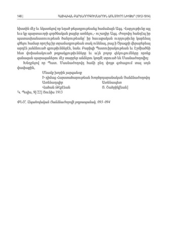 նիստին մէջ եւ նկատելով որ եղած թելադրութեանց համաձայն Ազգ Վարչութիւնը այլ . եւս կը պարտաւորի գործնական քայլեր առնելու ուշադիր Ազգ Ժողովոյ հանդէպ իր ,- . պատասխանատուութեան ծանրութեանը՝ իր հաւաքական ուղղութիւնը կարենալ գծելու համար որոշեց իր տրամադրութեան տակ ունենալ բաց ի Ծրագրի վերաբերեալ , արդէն յանձնուած գրութիւններէն նաեւ Բարիզի Պատուիրակութեան եւ Էջմիածնի , հետ փոխանակուած թղթակցութիւնները եւ ա՛յն բոլոր զեկուցումները որոնք զանազան պարագաներու մէջ տարբեր անձերու կողմէ տրուած են Մասնաժողովիդ : Խնդրելով որ Պատ Մասնաժողովդ հաճի ընդ փոյթ գոհացում տալ սոյն . փափաքին, Մնամք խորին յարգանօք Ի դիմաց Հարստահարութեան Խորհրդարանական Յանձնաժողովոյ ԱտենադպիրԱտենապետ Վահան Թէքէեան Յ Շահրիկ եան. [] Կ Պօլիս. , 9[/22] Յունիս 1913 ՓՆՄ Ապահովական Յանձնաժողովի թղթապանակ, , 093–094 148 |ՀԱՅԿԱԿԱՆ ԲԱՐԵՆՈՐՈԳՈՒՄՆԵՐՈՒՆ ԱՌՆՉՈՒՈՂ ՆԻՒԹԵՐ (1912-1914)
