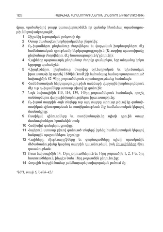 վրայ պահանջելով թուրք կառավարութենէն որ զանոնք հետեւեալ տրամադրու, -թիւններով ամբողջացնէ . Զիջանիլ եւրոպական քօնթռօլի մը : 1Օտար մասնագէտ խորհրդականներ ընդունիլ : 2Ոչ իսլամներու ընդհանուր ժողովներու եւ վարչական խորհուրդներու մէջ- 3համեմատական դրութեամբ ներկայացուցչութիւն Աւստրիոյ պատուիրակը ( ընդհանուր ժողովներու մէջ հաւասարութիւն կ՚ընդունի ): Վալիները պարտաւորել ընդհանուր ժողովը գումարելու երբ անդամոց երկու , 4երրորդը պահանջեն : Վիլայէթներու ընդհանուր ժողովոց օրէնսդրական եւ ելեւմտական 5իրաւասութիւնը որոշել՝ 1880 ին Ռումէլիի նահանգաց համար պատրաստուած նախագիծին 82–93 րդ յօդուածներուն տրամադրութեանց համաձայն : Համեմատական ներկայացուցչութիւն սանճաքի վարչային խորհուրդներուն 6մէջ ուր ոչ իսլամները ստուար թիւով կը գտնուին - : Նոյն նախագիծին 115, 116, 139, 140 րդ յօդուածներուն համաձայն որոշել , 7սանճաքներու վարչային խորհուրդներու իրաւասութիւնը : Ոչ իսլամ տարրին այն տեղերը ուր այդ տարրը ստուար թիւով կը գտնուի- - - 8ոստիկան զինուորութեան եւ ոստիկանութեան մէջ համեմատական կերպով- մասնակցիլը: Ոստիկան զինուորները եւ ոստիկանութիւնը պիտի դրուին օտար 9մասնագէտներու հրամանին տակ : Համիտիյէ գունդերու ցրուիլը : 10Հայերուն ստուար թիւով գտնուած տեղերը՝ իրենց համեմատական կերպով 11հանրային պաշտօններու կոչուիլը : Վալիները, միւթէսարըֆները եւ գայմագամները պիտի պատկանին 12մեծամասնութիւնը կազմող տարրին դաւանութեան իսկ մուավինները միւս . դաւանութեան: Ռուս նախագիծին 14, 15 րդ յօդուածներուն եւ 16 րդ յօդուածին 1, 2, 3 5 եւ րդ13հատուածներուն ինչպէս նաեւ, 18 րդ յօդուածին ընդունուիլը : Հողային հարցին համար յանձնարարել ստիպողական լուծում մը : 14 ՊՏԴ տուփ, 6, 408 –421Ն 162 |ՀԱՅԿԱԿԱՆ ԲԱՐԵՆՈՐՈԳՈՒՄՆԵՐՈՒՆ ԱՌՆՉՈՒՈՂ ՆԻՒԹԵՐ (1912-1914)