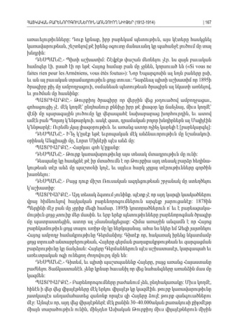 առաւելութիւնները Դուք կրնաք իբր բարեկամ պետութիւն այս կէտերը հասկցնել: , , կառավարութեան շեշտելով թէ իրենց օգուտը մանաւանդ կը պահանջէ լուծում մը տալ, խնդրին: ԴԵՍՊԱՆԸ Պիտի աշխատիմ Շէվքէթ փաշան մեռնելու չէր ես զայն բաւական.- : . համոզեր էի ըսած էի որ եթէ Հայոց համար բան մը չընեն կորսուած են . , («Si vous ne faites rien pour les Arméniens, vous étés foutus»): Նոր Եպարգոսին ալ նոյն բաները ըսի , եւ ան ալ բաւական տրամադրութիւն ցոյց տուաւ Դարձեալ պիտի աշխատիմ որ : 1895 իծրագիրը քիչ մը ամբողջացուի օսմանեան պետութեան ծրագիրն ալ նկատի առնելով , , եւ լուծման մը հասնինք : ՊԱՏՐԻԱՐՔԸ Թուրքիոյ ծրագիրը որ վերջին վեց յօդուածով ամբողջացաւ.- , գոհացուցիչ չէ մէկ կողմէ՝ ընդհանուր քննիչը իբր թէ լիազօր կը ճանչնայ միւս կողմէ՝ . , վէճի մը պարագային լուծումը կը վերապահէ նախարարաց խորհուրդին եւ ատով , ամէն բան Պոլսոյ կ՚ենթարկուի ասկէ զատ դրամական բոլոր խնդիրներն ալ Մալիյէին . , կ՚ենթարկէ Ուրեմն չկայ լիազօրութիւն եւ առանց ատոր ոչինչ կարելի է բարեկարգել: . []: ԴԵՍՊԱՆԸ Ի՞նչ կ՚ըսէք եթէ եւրոպական մէկ անձնաւորութիւն մը նշանակուի.- . օրինակ Անգլիացի մը Լորտ Միլնէրի պէս անձ մը , : ՊԱՏՐԻԱՐՔԸ Հարկաւ գոհ կ՚ըլլանք.- : ԴԵՍՊԱՆԸ Թուրք կառավարութիւնը այս տեսակ մտադրութիւն մը ունի.- : Դեսպանը կը հասկցնէ թէ իր մտածումն է որ Թուրքիա այդ տեսակ բարձր հեղինա -կութեան տէր անձ մը պաշտօնի կոչէ եւ այլեւս հարկ չըլլայ տէրութիւնները գործին , խառնելու: ԴԵՍՊԱՆԸ Բայց դուք միշտ Ռուսական ազդեցութեան շրջանակ մը ստեղծելու.- կ՚աշխատիք: ՊԱՏՐԻԱՐՔԸ Այդ տեսակ ձգտում չունինք պէտք չէ որ այդ կարգի կասկածներու.- . վրայ հիմնուելով հայկական բարենորոգումներուն արգելք յարուցանէք : 1878 ինՊերլինի մէջ բան մը չըրիք մեզի համար . 1895 ի կոտորածներուն ո՛ եւ է բարեացակա -մութիւն ցոյց չտուիք մեր մասին եւ երբ երեք պետութիւնները բարենորոգման ծրագիր . մը պատրաստեցին ատոր ալ չմասնակցեցաք Հիմա առաջին անգամն է որ Հայոց , : բարեկամութիւն ցոյց տալու առիթ մը կը ներկայանայ ահա ես եկեր եմ Ձեզի յայտնելու . Հայոց ամբողջ համակրութիւնը Գերմանիոյ Գիտէք որ հակառակ իրենց նկատմամբ : , ցոյց տրուած անտարբերութեան Հայերը գերման քաղաքակրթութեան եւ զարգացման , բարձրութիւնը կը ճանչնան Հայերը Գերմաններուն պէս աշխատասէր կարգապահ եւ : , առեւտրական ոգի ունեցող ժողովուրդ մըն են : ԴԵՍՊԱՆԸ Գիտեմ եւ պիտի պաշտպանենք Հայերը բայց առանց Հայաստանը.- , , բաժնելու Տաճկաստանէն չենք կրնար հաւանիլ որ վեց նահանգները առանձին մաս մը . կազմեն: ՊԱՏՐԻԱՐՔԸ Բարենորոգումները բաժանում չեն ընդհակառակը Միւս կողմէ.- , : , հինէն ի վեր վեց վիլայէթները մէկ երկու վիլայէթ կը կազմէին թուրք կառավարութիւնը . յատկապէս անդամահատեց զանոնք որպէս զի Հայերը ձուլէ թուրք զանգուածներու մէջ Այնպէս որ այդ վեց վիլայէթներէ մէկ քանին: , 30–40.000ական քառակուսի քիլօմէթր միայն տարածութիւն ունին մինչդեռ Ասիական Թուրքիոյ միւս վիլայէթներուն միջին , ՀԱՅԿԱԿԱՆ ԲԱՐԵՆՈՐՈԳՈՒՄՆԵՐՈՒՆ ԱՌՆՉՈՒՈՂ ՆԻՒԹԵՐ (1912-1914)| 167