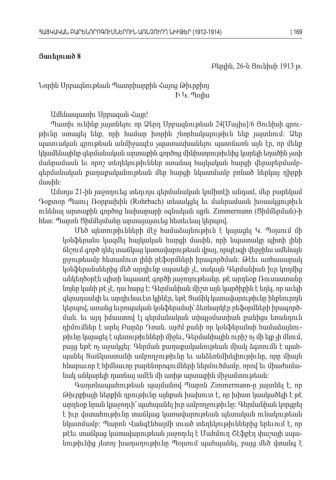 Յաւելուած 8 Բերլին, 26- ն Յունիսի 1913 . թ Նորին Սրբազնութեան Պատրիարքին Հայոց Թիւրքիոյ Ի Կ Պօլիս . Ամենապատիւ Սրբազան Հայր ! Պատիւ ունինք յայտնելու որ Ձերդ Սրբազնութեան 24[Մայիս]/6 Յունիսի գրու -թիւնը ստացել ենք որի համար խորին շնորհակալութիւն ենք յայտնում Ձեր , : պատւական գրութեան անմիջապէս չպատասխանելու պատճառն այն էր որ մենք , կկամենայինք գերմանական արտաքին գործոց մինիստրութիւնից կարելի եղածին չափ մանրամասն եւ որոշ տեղեկութիւններ ստանալ հայկական հարցի վերաբերմամբ - գերմանական քաղաքականութեան մեր հարցի նկատմամբ բռնած ներկայ դիրքի մասին: Ամսոյս 21- ին յաջողուեց տեղւոյս գերմանական կոմիտէի անդամ մեր բարեկամ , Դօքտօր Պաուլ Ռօրբախին (Rohrbach) տեսակցել եւ մանրամասն խօսակցութիւն ունենալ արտաքին գործոց նախարարի օգնական պրն . Zimmermann (Ցիմմերման ի)- հետ Պարոն Ցիմմերմանը արտայայտւեց հետեւեալ կերպով: . Մեծ պետութիւնների մէջ համաձայնութիւն է կայացել Կ Պօլսում մի . կօնֆերանս կազմել հայկական հարցի մասին որի նպատակը պիտի լինի , ճնշում գործ դնել տաճկաց կառավարութեան վրայ որպէսզի վերջինս ամենայն , լրջութեամբ հետամուտ լինի րէֆօրմների իրագործման Թէեւ առհասարակ : կօնֆերանսներից մեծ արդիւնք սպասելի չէ սակայն Գերմանիան իւր կողմից , անկեղծօրէն պիտի նպաստէ գործի յաջողութեանը թէ արդեօք Ռուսաստանը . նոյնը կանի թէ չէ դա հարց է Գերմանիան միշտ այն կարծիքին է եղել որ աւելի , : , գերադասելի եւ արդիւնաւէտ կլինէր եթէ Տաճիկ կառավարութիւնը ինքնուրոյն , կերպով առանց եւրոպական կօնֆերանսի՝ ձեռնարկէր րեֆօրմների իրագործ, -ման եւ այդ իմաստով էլ գերմանական տիպլօմատիան քանիցս եռանդուն. դիմումներ է արել Բարձր Դռան այժմ քանի որ կօնֆերանսի համաձայնու . -թիւնը կայացել է պետութիւնների միջեւ Գերմանիային ուրիշ ոչ մի ելք չի մնում , , բայց եթէ ոչ աջակցել Գերման քաղաքականութեան միակ ձգտումն է պահ : -պանել Տաճկաստանի ամբողջութիւնը եւ անձեռնմխելիութիւնը որը միայն , հնարաւոր է հիմնաւոր բարենորոգումների ներմուծմամբ որով եւ միաժամա , -նակ անկարելի դառնայ ամէն մի առիթ արտաքին միջամտութեան : Գաղտնապահութեան պայմանով Պարոն Zimmermann- ը յայտնել է որ , Թիւրքիայի ներքին դրութիւնը այնքան խախուտ է որ խիստ կասկածելի է թէ , արդեօք նրան կյաջողւի՞ պահպանել իւր ամբողջութիւնը Գերմանիան կորցրել : է իւր վստահութիւնը տաճկաց կառավարութեան պետական ունակութեան նկատմամբ Պարոն Վանգէնհայմի տւած տեղեկութիւններից երեւում է որ: , թէեւ տաճկաց կառավարութեան յաջողւել է Մահմուդ Շէֆքէդ փաշայի սպա -նութիւնից յետոյ խաղաղութիւնը Պօլսում պահպանել բայց մեծ վտանգ է , ՀԱՅԿԱԿԱՆ ԲԱՐԵՆՈՐՈԳՈՒՄՆԵՐՈՒՆ ԱՌՆՉՈՒՈՂ ՆԻՒԹԵՐ (1912-1914)| 169