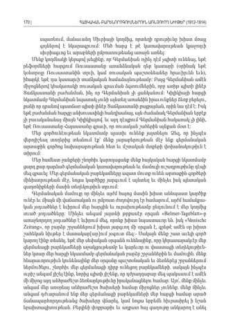 սպառնում մանաւանդ Սիւրիայի կողմից որտեղի դրութիւնը խիստ մռայլ, , գոյներով է նկարագրւում Մեծ հարց է թէ կառավարութեան կյաջողւի : սիւրիացւոց եւ արաբների ըմբոստութեանց առաջն առնել : Մենք կողմնակի կերպով լսեցինք որ Գերմանիան ոչինչ դէմ չպիտի ունենայ եթէ , , րեֆօրմների հարցում Ռուսաստանը առանձնական դեր կատարի օրինակ եթէ ( կօնտրօլը Ռուսաստանին տրւի կամ ռուսական պաշտօնեաներ հրաւիրւեն եւն , ), իհարկէ եթէ դա կատարւի տաճկական համաձայնութեամբ Բայց Գերմանիան ամէն : միջոցներով կհակառակի ռուսական գրաւման ձգտումներին որը առիթ պիտի լինէր , Տաճկաստանի բաժանման ինչ որ Գերմանիան չի ցանկանում Կիլիկիայի հարցի , : նկատմամբ Գերմանիան նպատակ չունի այնտեղ առանձին իրաւունքներ ձեռք բերելու , քանի որ դրանով պատճառ պիտի լինէր Տաճկաստանի քայքայման որին նա դէմ է Իսկ , : եթէ բաժանման հարցը անխուսափելի հանդիսանայ այն ժամանակ Գերմանիան երբէք , չի բաւականանայ միայն Կիլիկիայով եւ այդ դէպքում Գերմանիան հակառակ չի լինի . , եթէ Ռուսաստանը Հայաստանը գրաւի որ ռուսական շահերին այնքան մօտ է , : Մեր գործունէութեան նկատմամբ պատիւ ունենք յայտնելու Ձեզ որ ինչպէս , վերոյիշեալ տողերից տեսնում էք՝ մենք յարաբերութեան մէջ ենք գերմանական արտաքին գործոց նախարարութեան հետ եւ մշտական մտքերի փոխանակութիւն է տիրում: Մեր համեստ ջանքերի շնորհիւ կարողացանք մենք հայկական հարցի նկատմամբ ցարդ քար դարձած գերմանական կառավարութեան եւ մամուլի ուշադրութիւնը դէպի մեզ գրաւել Մեր գերմանական բարեկամները ազատ մուտք ունեն արտաքին գործերի : մինիստրութեան մէջ նոցա կարծիքը յարգւում է այնտեղ եւ մինչեւ իսկ պետական , գաղտնիքների մասին տեղեկութիւն տրւում : Գերմանական մամուլը որ մինչեւ այժմ հայոց մասին խիստ աննպաստ կարծիք ունէր եւ միայն մի վաճառական ու ըմբոստ ժողովուրդ էր համարում այժմ համակրա , -կան յօդւածներ է նւիրում մեր հարցին եւ ուրախութեամբ ընդունում է մեր կողմից տւած յօդւածները Մինչեւ անգամ յայտնի թրքասէր օրգան : «Belmer-Tageblatt»- ըառաջնորդող յօդւածներ է նւիրում մեզ որոնք խիստ նպաստաւոր են իսկ , . «Vassische Zeitung», որ բարձր շրջաններում խիստ յարգւող մի օրգան է գրեթէ ամէն օր խիստ , շահեկան նիւթեր է մատակար ար ում յօգուտ մեզ Սակայն մենք շատ աւելի գործ [] :- կարող էինք տեսնել եթէ մեր սեփական օրգանն ունենայինք որը կհրատարակւէր մեր , , գերմանացի բարեկամների աջակցութեամբ եւ կարեւոր ու փաստացի տեղեկութիւն -ներ կտար մեր հարցի նկատմամբ գերմանական բարձր շրջաններին եւ մամուլին մենք . հնարաւորութիւն կունենայինք մեր օրգանը պաշտօնական եւ ձեռներէց շրջաններում ներմուծելու շնորհիւ մեր գերմանացի դիրք ունեցող բարեկամների սակայն ինչպէս, . ուրիշ անգամ յիշել էինք նորից պիտի յիշենք որ դժբաղդաբար մեզ պակասում է ամէն , , մի միջոց այդ անհրաժեշտ ձեռնարկութիւնը իրականացնելու համար Այո՛ մենք մինչեւ : , անգամ մեր առօրեայ անհրաժեշտ ծախսերի համար միջոցներ չունենք մենք մինչեւ . անգամ դժւարանում ենք մեր գերմանացի բարեկամների մեր հարցի համար արած ճանապարհորդութեանց ծախսերը վճարել կամ նոցա երբեմն հիւրասիրել ի նշան , երախտագիտութեան Բերլինի փոքրաթիւ եւ աղքատ հայ գաղութը անկարող է անել. 170 |ՀԱՅԿԱԿԱՆ ԲԱՐԵՆՈՐՈԳՈՒՄՆԵՐՈՒՆ ԱՌՆՉՈՒՈՂ ՆԻՒԹԵՐ (1912-1914)