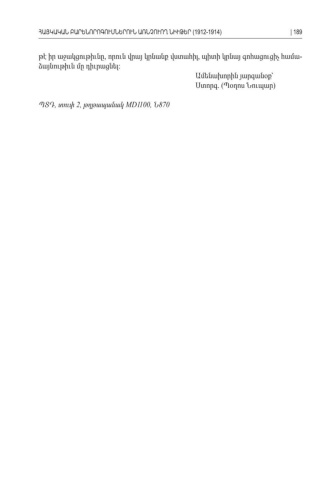 թէ իր աջակցութիւնը որուն վրայ կրնանք վստահիլ պիտի կրնայ գոհացուցիչ համա , , -ձայնութիւն մը դիւրացնել : Ամենախորին յարգանօք՝ Ստորգ Պօղոս Նուպար. ( ) ՊՏԴ տուփ, 2, թղթապանակ MD1100, 870Ն ՀԱՅԿԱԿԱՆ ԲԱՐԵՆՈՐՈԳՈՒՄՆԵՐՈՒՆ ԱՌՆՉՈՒՈՂ ՆԻՒԹԵՐ (1912-1914)| 189
