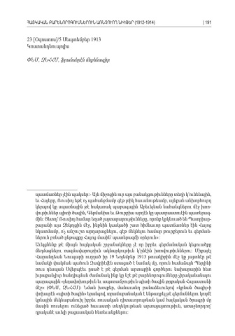 23 [Օգոստոս]/5 Սեպտեմբեր 1913 Կոստանդնուպոլիս ՓՆՄ ԶՆՀՀՄ ֆրանսերէն մեքենագիր, , պատճառներ չէին պակսեր Այն միջոցին ուր այս բանակցութիւնները տեղի կ՚ունենային :- , եւ Հայերը Ռուսիոյ եթէ ոչ պահանջմամբ գէթ լռիկ հաւանութեամբ այնքան անխորհուրդ , , կերպով կը սպառնային թէ հակառակ պարագային Արեւելեան նահանգներու մէջ խռո -վութիւններ պիտի ծագին Գերմանիա եւ Թուրքիա արդէն կը պատրաստուէին պատերազ , -մին Յետոյ՝ Ռուսիոյ համար եղած յայտարարութիւնները որոնք կրկնուած են Պատրիար: , -քարանի այս Զեկոյցին մէջ ինքնին կասկածի շատ հիմնաւոր պատճառներ էին Հայոց , նկատմամբ ո՛չ անշուշտ արդարացնելու գէթ մեկնելու համար թուրքերուն եւ գերման, , -ներուն բռնած ընթացքը Հայոց մասին՝ պատերազմի օրերուն »: Աւելցնենք թէ միայն հայկական շրջանակները չէ որ իբրեւ գերմանական կեցուածքը մեղմացնելու ռազմավարութիւն ակնարկութիւն կ՚ընէին խռովութիւններու Միքայէլ : Վարանդեան Նուպարի ուղղած իր 19 Նոյեմբեր 1913 թուակիրին մէջ կը յայտնէր թէ նամակի փակման պահուն Զավրիէվէն ստացած է նամակ մը որուն համաձայն Պերլինի , ռուս դեսպան Սվերպէեւ ըսած է թէ գերման արտաքին գործերու նախարարին հետ իւրաքանչիւր հանդիպման ժամանակ ինք կը նշէ թէ բարենորոգումները չիրականանալու պարագային յեղափոխութիւն եւ ապստամբութիւն պիտի ծագին թրքական Հայաստանի « մէջ» (ՓՆՄ ԶՆՀՀՄ, ): Նման խօսքեր մանաւանդ բանաձեւուելով կրնան ծագիլ ի , « » փոխարէն պիտի ծագին երանգով տրամաբանական է ենթադրել թէ գերմաններու կողմէ « » , կրնային մեկնաբանուիլ իբրեւ ռուսական դիտաւորութեան կամ հայկական ծրագրի մը մասին ռուսերու ունեցած հաւաստի տեղեկութեան արտայայտութիւն առաջնորդող՝ , դրականէ աւելի բացասական հետեւանքներու :ՀԱՅԿԱԿԱՆ ԲԱՐԵՆՈՐՈԳՈՒՄՆԵՐՈՒՆ ԱՌՆՉՈՒՈՂ ՆԻՒԹԵՐ (1912-1914)| 191