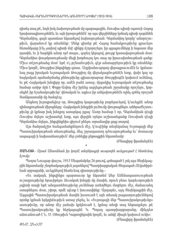 դիտել տալ թէ նոյն իսկ ձախողութեան մը պարագային Ռուսիա պիտի օգտուի Հայոց , , երախտագիտութենէն եւ այն իրողութենէն՝ որ այս վերջինները կռնակ պիտի դարձնեն, Գերմանիոյ զայն պատճառ նկատելով ձախողութեան Գերմանիոյ կողմը՝ անորոշու, : -թիւն վարանում կը տեսնենք Չենք գիտեր թէ Հայոց համակրութիւնը գրաւելու, : հեռանկարը ի՛նչ չափով պիտի մղէ զինքը ճշդորոշելու իր զգացումները ի նպաստ մեր դատին եւ ի հարկին անոր ոյժ տալու զօրեղ կերպով թուրք կառավարութեան մօտ, , , : Գերմանիա փութկոտութեամբ մեզի խորհուրդ կու տայ որ իրաւախոհութեան գանք : Միւս տէրութեանց մօտ՝ եթէ ո՛չ թշնամութիւն գէթ անտարբերութիւն կը տեսնենք , : Միւս կողմէ Թուրքիա ինքզինքը գտաւ Ադրիանուպոլսոյ վերագրաւումէն եւ կրճատ , . -եալ բայց իրական եւրոպական Թուրքիոյ մը վերակազմութենէն ետք վախ կայ որ , հայկական պահանջմանց քննութիւնը գլխաւորաբար Թուրքիայէն կախում ունենայ , եւ թէ Հայկական խնդիրը որ ամէն բանէ առաջ մրցակից եւրոպական տէրութեանց , , համար առիթ մըն է Փոքր Ասիոյ մէջ իրենց ազդեցութեան շրջանակը որոշելու կոր - , -սնցնէ իր նշանակութիւնը՝ վճռական եւ այլեւս իր անկախութենէն ոչինչ զոհել որոշած Տաճկաստանի մը հանդէպ : Անցնող իւրաքանչիւր օր Թուրքիոյ կացութիւնը բարելաւելով կ՚աւելցնէ անոր , , դիմադրութեան միջոցները Հայկական խնդրին լուծումը փութացնելու անհրաժեշտու : -թիւնը չի կրնար իսկ խնդրոյ առարկայ ըլլալ Ասոր համար է որ Գերմանիան դէպի : , Ռուսիա մղելու աշխատելէ ետք այս վերջին օրերս աշխատեցանք Ռուսիան դէպի , Գերմանիա մղելու ինքզինքնիս զիջում ընելու տրամադիր ցոյց տալով , : Այս ծանրակշիռ հանգամանքներուն մէջ կ՚ուզէինք տեղեկանալ Եւրոպայի մեր , Պատուիրակութեան տեսութեանց մեզ շրջապատող դժուարութեանց եւ՝ մօտաւոր , ապագայի ի նախատեսութիւն՝ մեր բռնելիք ընթացքին նկատմամբ : (Բնագիրը ֆրանսերէն ) * ԾԱՆՕԹ.- Արամ Անտոնեան իր կողմէ տեղեկագրի աւարտին աւելցուցած է հետեւեալ նշումը: Պօղոս Նուպար փաշա , 1913 Սեպտեմբեր 26 թուով գոհացած է լոկ այս Տեղեկագ, -րին նկատմամբ շնորհակալութիւն յայտնելով Պատրիարքական Տեղապահ Ճէվահիրճ -եան սրբազանի աւելցնելով հետեւեալ դիտողութիւնը , .- «Եւ սակայն ինքզինքս պարտաւոր կը նկատեմ Ձեր Ամենապատուութեան , ուշադրութիւնը հրաւիրելու ձեւական խնդրի մը մասին որուն բնաւ կարեւորութիւն , չպիտի տայի եթէ անպատեհութիւնը չունենար ստեղծելու մտքերու մէջ մանաւանդ , օտարներու մօտ շփոթ որմէ պէտք է խուսափինք Արդարեւ այդ Տեղեկագրին մէջ , , : , , Ազգային Պատուիրակութեան մասին խօսուած է այն տեսակ բացատրութիւններով որոնք կրնան երկդիմութիւն առաջ բերել եւ Եւրոպայի մեր Պատուիրակութիւնը , « » ասութիւնը որ անոր մէջ յաճախ կրկնուած է կրնայ տեղի տալ ենթադրելու թէ, , Պատուիրակութիւնը կը ներկայացնէ Կ Պոլսոյ պատրիարքարանը մինչդեռ . , անուանուած է Ն Ս Օծութիւն Կաթողիկոսին կողմէ եւ անկէ միայն կախում ունի . . , »: (Բնագիրը ֆրանսերէն ) ՓՆՄ ԶՆՀՀՄ, ՀԱՅԿԱԿԱՆ ԲԱՐԵՆՈՐՈԳՈՒՄՆԵՐՈՒՆ ԱՌՆՉՈՒՈՂ ՆԻՒԹԵՐ (1912-1914)| 205