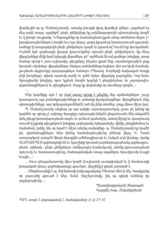 ֆօրմիւլին որ պ Մանտէլշտամը առանց թուղթի վրայ ֆօրմիւլէ ընելու յայտնած էր . - - մեզ ասկէ առաջ այսինքն՝ ընդհ քննիչները կը յանձնարարուին պետութեանց կողմէ . . եւ կ՚ընտրէ սուլթանը Կ՚ենթադրենք որ համաձայնած ըլլան անոր : attribution-ներու [= իրավասութիւններու մասին եւս այս կերպ ցարդ իրատէով հաստատուած պաշտօն] - -եաները կ՚առաջարկուին ընդհ քննիչներու կողմէ եւ իրատէով Դուռէն կը վաւերանան . : Ուրեմն եթէ գործադրի լիազօր իրաւունքներ տրուին ընդհ քննիչներուն կը մնայ . , վիլայէթները մէկի կամ երկուքի վերածելու թէ՞ այժմեան ձեւով պահելու խնդիրը ասոր . համար պէտք է շատ աշխատիլ թիւրքերը ինչպէս գրած ենք տրամադրութիւն ցոյց . , , կուտան փոխելու վիլայէթներու ներկայ սահմանները հայերու կէս առ կէսի մասնակ « -ցութեան սկզբունքը արդարացնելու համար » (Պետակ Խորհրդի նախագահ Խալիլ. բէյի խօսքերը պիտի օգտուիլ ատկէ եւ գոնէ երկու վիլայէթը յաջողցնել Կայ նաեւ ). : Տրապիզոնի խնդիրը որու կցման մասին կարելի է ընդդիմանալ եւ յաջողապէս , - - գերմանացիներուն եւ թիւրքերուն Բայց կը վախնանք որ ռուսները պնդեն : ...: ..... Մեր կարծիքը այն է որ ժամ առաջ պէտք է լմնցնել մեր պահանջներու շուրջ կատարուող այս բանակցութիւնները եւ ջանանք իրականացնելու միջոցներուն մղել պետութիւնները այս երկարաձգումներէն շահ մը չենք տեսներ բայց վնաս միշտ կայ. , : Պ Մանտէլշտամը անցեալ օր այս առթիւ արտայայտուելով ըսաւ թէ իրենք կը. , կարծեն որ պէտք չէ ամբողջ ծրագիրը պետութիւններէն ընդունուած մէկ անգամէն ( ) դնել թիւրք կառավարութեան առջեւ եւ լուծում պահանջել ատով միջոց եւ պատրուակ . տուած կ՚ըլլանք թիւրքերուն խնդիրը չափազանց երկարաձգել վիճիլ ընդդիմանալ եւ , , ժամանակ շահիլ ինչ որ եղած է միշտ անոնց տակտիկը պ Մանտէլշտամը կը կարծէ , - . թէ գերմանացիներու հետ իրենց համաձայնութիւնը լմննալէ վերջ Բ Դռան, , . առաջարկուի առայժմ միայն ծրագրին ամենագլխաւոր եւ էական ա՛յն կէտերը որոնք , ԱՆՄԻՋԱՊԷՍ գործադրելի են եւ երաշխիք կուտան բարենորոգութեանց գործադրու -թեան օրինակ ընդհ քննիչներու անմիջապէս նշանակումը անոնց իրաւասութեան. .- . , որոշումը եւ հաստատութիւնը ժանտարմական օտար սպաներու հրաւիրումը եւայլն , եւայլն....: ... Ռուս դեսպանատունը միւս կողմէ կ՚աշխատի աւստրիական եւ ի մասնաւորի իտալական դեսպ գործակատարը գրաւելու վերջին ը գրեթէ յաջողած է . . [ ] : ... Շնորհաւորելի է պ Քլէմանսոյի խմբագրականը . l'Homme libre- ի մէջ հասկցանք. որ յօդուածը գրուած է Ձեր Վսեմ ներշնչումովը ինչ որ պիտի ունենայ իր . , ազդեցութիւնը...: Պ ատրիարքական Տեղապահ[] Գաբրիէլ Եպս Ճէվահիրճեան . ՊՏԴ տուփ, 3, թղթապանակ 2, նամակատետր Ճ էջ , 37–42 ՀԱՅԿԱԿԱՆ ԲԱՐԵՆՈՐՈԳՈՒՄՆԵՐՈՒՆ ԱՌՆՉՈՒՈՂ ՆԻՒԹԵՐ (1912-1914)| 207