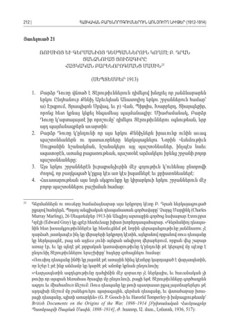 Յաւելուած 21 ՌՈՒՍԻՈՅ ԵՒ ԳԵՐՄԱՆԻՈՅ ԴԵՍՊԱՆՆԵՐՈՒՆ ԿՈՂՄԷ Բ ԴՐԱՆ . ՅԱՆՁՆՈՒԱԾ ՅՈՒՇԱԳԻՐԸ ՀԱՅԿԱԿԱՆ ԲԱՐԵՆՈՐՈԳՄԱՆՑ ՄԱՍԻՆ 25 (ՍԵՊՏԵՄԲԵՐ 1913) 1.Բարձր Դուռը վճռած է Տէրութիւններուն դիմելով խնդրել որ յանձնարարեն երկու Ընդհանուր Քննիչ Արեւելեան Անատոլիոյ երկու շրջաններուն համար՝ ա Էրզրում Տրապիզոն Սըվազ եւ բ Վան Պիթլիս Խարբերդ Տիարպեքիր) , , ) , , , , որոնց հետ կրնայ կնքել հնգամեայ պայմանագիր Միաժամանակ Բարձր : , Դուռը կ՚արտայայտէ իր որոշումը՝ դիմելու Տէրութիւններու օգնութեան երբ , այդ պայմանագրերն աւարտին։ 2.Բարձր Դուռը կ՚ընդունի որ այս երկու Քննիչներն իրաւունք ունին աւագ պաշտօնեաներն ու դատաւորները ներկայացնելու Նորին Վսեմութիւն Սուլթանին նշանակման նշանակելու այլ պաշտօնեաներ ինչպէս նաեւ , , ազատօրէն առանց բացառութեան պաշտօնէ արձակելու իրենց շրջանի բոլոր, , պաշտօնեաները: 3.Այս երկու շրջաններէն իւրաքանչիւրին մէջ գոյութիւն կ՚ունենայ ընտրովի ժողով որ բաղկացած կ՚ըլլայ կէս առ կէս իսլամներէ եւ քրիստոնեաներէ, : 4.Հաւասարութեան այս նոյն սկզբունքը կը կիրարկուի երկու շրջաններուն մէջ բոլոր պաշտօններու բաշխման համար : 25 Գերմաններն ու ռուսերը համաձայնաբար այս երկրորդ կէտը Բ Դրան ներկայացուցած . ըլլալով հանդերձ Պոլսոյ անգլիական դեսպանատան գործավարը՝ Չարլզ Մարլինկ , (Charles Murray Marling), 26 Սեպտեմբեր 1913- ին Անգլիոյ արտաքին գործոց նախարար Էտուըրտ Կրէյի (Edward Gray) կը գրէր հետեւեալը խիստ խորհրդապահաբար Գերմանիոյ դեսպա . « -նին հետ խօսակցութիւններէս կը հետեւցնեմ թէ նորին գերազանցութիւնը յանձնառու չէ դարձած յատկապէս ինչ կը վերաբերի երկրորդ կէտին այնքանով որքանով ռուս դեսպանը, , կը ներկայացնէ բաց ան այլեւս չունի այնքան անզիջող վերաբերում որքան վեց շաբաթ , , առաջ էր եւ կը պնդէ թէ թրքական կառավարութիւնը կ՚ընդունի թէ կերպով մը պէտք է , ընդունիլ Տէրութիւններու երաշխիքը՝ հայերը գոհացնելու համար : «Ռուսիոյ դեսպանը ինծի կը յայտնէ թէ առաջին հինգ կէտերը կարդացած է վարչապետին , որ նշեր է թէ ինք անձամբ կը կարծէ թէ անոնք կրնան ընդունուիլ : «Վարչապետին ազդեցութիւնը դահլիճին մէջ զօրաւոր չէ ներկայիս եւ հաւանական չի , թուիր որ այսքան հեռահաս ծրագիր մը ընդունուի բացի եթէ Տէրութիւնները գործադրեն , ազդու եւ միահամուռ ճնշում Ռուս դեսպանը կը թուի պատրաստ ըլլալ յայտնաբերելու թէ : այդպիսի ճնշում մը բանեցուելու պարագային գերման դեսպանը եւ վստահաբար իտա , , -լացի դեսպանը պիտի առարկեն , » (G. P. Gooch- Harorld Temperley- ի եւի խմբագրութեամբ՝ British Documents on the Origins of the War, 1898–1914 [ Բրիտանական Վաւերագրեր Պատերազմի Ծագման Մասին , 1898–1914], . Ժ հատոր Ա մաս Լոնտոն, . ., , 1936, 517): 212 |ՀԱՅԿԱԿԱՆ ԲԱՐԵՆՈՐՈԳՈՒՄՆԵՐՈՒՆ ԱՌՆՉՈՒՈՂ ՆԻՒԹԵՐ (1912-1914)