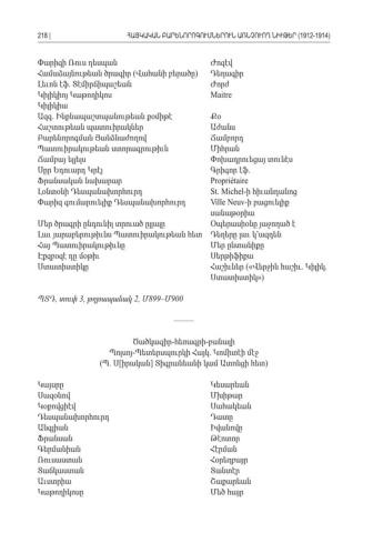 Փարիզի Ռուս դեսպան Ժոզէվ Համաձայնութեան ծրագիր Վահանի բերածը ( ) Դեղագիր Լեւոն էֆ Տէմիրճիպաշեան . Ժորժ Կիլիկիոյ Կաթողիկոս Maitre Կիլիկիա Ազգ Ինքնապաշտպանութեան քօմիթէ. Քօ Հաշտութեան պատուիրակներ Աժանս Բարենորոգման Յանձնաժողով Ճամբորդ Պատուիրակութեան ստորագրութիւն Միհրան Ճամբայ ելլելս Փոխադրուեցայ տունէս Սըր Եդուարդ Կրէյ Գրիգոր էֆ . Ֆրանսական նախարար Propriétaire Լօնտօնի Դեսպանախորհուրդ St. Michel- ի հիւանդանոց Փարիզ գումարուելիք Դեսպանախորհուրդ Ville Neuv- ի բացուելիք սանաթօրիա Մեր ծրագրի ընդունիլ տրուած ըլլալը Օպերասիօնը յաջողած է Լաւ յարաբերութիւնս Պատուիրակութեան հետ Դեղերը լաւ կ՚ազդեն Հայ Պատուիրակութիւնը Մեր ընտանիքը Էքզբօզէ դը մօթիւ Սերթիֆիքա Ստատիստիկը Հաշիւներ Վերջին հաշիւ Կիլիկ (« . . Ստատիստիկ») ՊՏԴ տուփ, 3, թղթապանակ 2, 899– 900ՄՄ ––––– Ծածկագիր հեռագրի բանալի-- Պոլսոյ Պետերսպուրկի Հայկ Կոմիտէի մէջ- . ( . [Պ Ս իրական Տիգրանեանի կամ Ատոնցի հետ] ) Կայսրը Կեսարեան Սազօնով Մխիթար Կօքովցիէվ Սահակեան Դեսպանախորհուրդ Դատը Անգլիան Իվանովը Ֆրանսան Թէոտոր Գերմանիան Հէրման Ռուսաստան Հօրեղբայր Տաճկաստան Տանտէր Աւստրիա Շաքարեան Կաթողիկոսը Մեծ հայր 218 |ՀԱՅԿԱԿԱՆ ԲԱՐԵՆՈՐՈԳՈՒՄՆԵՐՈՒՆ ԱՌՆՉՈՒՈՂ ՆԻՒԹԵՐ (1912-1914)