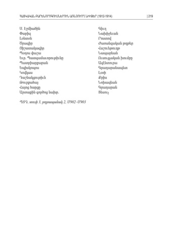 Ս Էջմիածին. Գիւղ Փարիզ Նախիջեւան Լօնտօն Րոստով Ծրագիր Ժառանգական թղթեր Յիշատակագիր Հաշուեթուղթ Պօղոս փաշա Նապարեան Եւր Պատգամաւորութիւնը. Ուսուցչական խումբը Պատրիարքարան Ագէնտուրա Եպիսկոպոս Գրադարանապետ Կովկաս Լօռի Դաշնակցութիւն Քրիս Թուրքահայ Նոխազեան Հայոց հարցը Գրադարան Արտաքին գործոց նախր . Տեսուչ ՊՏԴ տուփ, 3, թղթապանակ 2, 902– 903ՄՄՀԱՅԿԱԿԱՆ ԲԱՐԵՆՈՐՈԳՈՒՄՆԵՐՈՒՆ ԱՌՆՉՈՒՈՂ ՆԻՒԹԵՐ (1912-1914)| 219