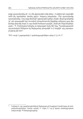 րակը պատասխանեց թէ՝ ո՛չ մէկ զիջողութիւն չենք ըներ « »: «Նոյնիսկ եթէ բոլորովին ամէն ինչ կորսնցնելու վտանգ ըլլա՜յ »- հարցուց թարգմանը :- Մեր պատուիրակը պատասխանեց Հայ ազգը միաձայն է զիջողութիւն չընելու մասին միայն կը խնդրենք. « . որ՝ այն պարագային երբ ռուսական դեսպանատունը ինքզինքը անկարող զգայ վեց կէտերը ընդունիլ տալու եւ այդ մասին համոզում գոյացնէ շնորհ ընէ մեզի իմացնելու , զայն»:- . Պ Մանտէլշթամ խնդրեց որ երեքշաբթի ժամը ին Ազգ Պատրիարքարանէ 9 . պաշտօնական Délégation մը ներկայանայ դեսպանին՝ եւ ի հարկին՝ այդ յայտարա -րութիւնը ընէ հոն 31: ՊՏԴ տուփ, 3, թղթապանակ 2, արձանագրութիւններու տետր Ճ էջ , 16–17 31 Նախորդ եւ այս պարբերութիւններով ներկայացուած հարցերուն մասին կարգ մը ման -րամասնութիւններու համար տեսնել 31 Հոկտ./13 Նոյ ի նիստի ատենագրութեան.- առնչուած թիւ 79 ծանօթագրութիւնը: 226 |ՀԱՅԿԱԿԱՆ ԲԱՐԵՆՈՐՈԳՈՒՄՆԵՐՈՒՆ ԱՌՆՉՈՒՈՂ ՆԻՒԹԵՐ (1912-1914)