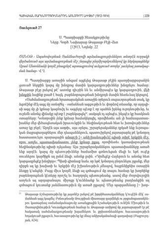 Յաւելուած 27 Ս Պատրիարքի Տեսակցութիւնը. Ներք Գործ Նախարար Թալաաթ Բէյի Հետ. . [1]913, Նոյեմբ. 22 ԾԱՆՕԹ Ապահովութեան Յանձնաժողովի արձանագրութիւններու տետրէն ուղղակի.- վերծանուած այս արձանագրութեան մէջ շեղագիր ընդմիջարկումներով կը ներկայացնենք Արամ Անտոնեանի կողմէ բնագրերէ արտագրումով աւելցուած տողեր՝ յաւելեալ յստակաց -ման համար Վ Ղ - . . Ս Պատրիարքը առաջին անգամ այցելեց Թալաաթ բէյին պատրիարքարանին. չլսուած ներքին կարգ մը խնդրոց մասին կարգադրութիւններ խնդրելու համար : Թալաաթ բէյը ըսելով թէ՝ ատոնք դիւրին են եւ անմիջապէս կը կարգադրուին մեծ , խնդրին նայինք ըսած է հայկ բարենորոգութեան խնդրոյն մասին հետեւեալ կերպով . . «Սահմանադրութեան հրատարակման առաջին օրերուն տպաւորութեան տակ կը , ձգտէինք մէկ ազգ մը ստեղծել օսմանեան ազգութիւն եւ փորձով տեսանք որ այդպի – , -սի ազգ մը չի կրնար կազմուիլ եւ ազգերը պէտք է որ պահեն իրենց ուրոյնութիւնը եւ , ուրեմն անոնց վիճակը պէտք է բարեկարգել սակայն ոչ այնպէս ինչպէս կը հասկնան 32. , օտարները Կօնտրօլին չենք կրնար համակերպիլ որովհետեւ ան չի համապատաս: , -խաներ մեր վեհապետական իրաւունքին եւ հեղինակութեան հետ եւ խռովութիւններ առաջ կը բերէ Արդէն այս առթիւ այս օրերս շրջաբերականներ ղրկած ենք եւրոպա : , , -կան մայրաքաղաքներու մեր դեսպաններուն պատուիրելով յայտարարել թէ կօնտրօլ , հաստատուելու պարագային անարշի [= անիշխանութիւն պիտի տիրէ երկրին մէջ] , որու առջեւ պատասխանատու չենք կրնար ըլլալ որովհետեւ կառավարութեան , հեղինակութիւնը պիտի ոչնչանայ Այս շրջաբերականներու պատասխանները առած : ենք արդէն կարգ մը պետութիւններ համամիտ գտնուեցան մեզի եւ եթէ ուզէք . ռուսներու կարծիքն ալ ըսեմ ձեզի անոնք ըսին Դիմեցէք Հայերուն եւ անոնց հետ . . « կարգադրեցէք խնդիրը Պիտի գիտնաք նաեւ որ եթէ կօնտրօլ ընդունելու ըլլանք մեր »: , դիրքն ալ կը խախտի եւ երկրին մէջ իշխանութիւն չմնալով հայրենիքնիս օտարին , ձեռքը կ՚անցնի Բայց միւս կողմէ ձեզի ալ գոհացում մը տալու համար կը խորհինք : բարենորոգման կէտերը որոշել եւ հաղորդել պետութեանց ասով մեր ժողովուրդին . առջեւն ալ արդարանալու միջոցը կ՚ունենանք եւ պետութեանց բաղձանքին ալ գոհացում կուտանք յանձնառութիւն մը առած ըլլալով Մեր պարլամենտը : [= խոր -32 Թալաաթ ճշմարտութիւնը կը յայտնէր ըսելով թէ իթթիհատականները կ՚ուզէին մէկ՝ օս -մանեան ազգ կազմել Բռնութեամբ Թուրքիան միատարր դարձնելն ու թրքահպատակնե : -րու կատարեալ օսմանականացումը առանցքային նշանակութիւն ունէին Միութիւն եւ Յառաջդիմութիւն Կուսակցութեան համար եւ Թալաաթ առիթով մը յայտարարած էր թէ հակառակ սահմանադրութեամբ իսլամներու եւ քրիստոնեաներու հաւասարութիւն հռչակուած ըլլալուն հաւասարութիւնը կը մնայ անիրականանալի գաղափար Բայբուրդ , ( -յան, 624): ՀԱՅԿԱԿԱՆ ԲԱՐԵՆՈՐՈԳՈՒՄՆԵՐՈՒՆ ԱՌՆՉՈՒՈՂ ՆԻՒԹԵՐ (1912-1914)| 229
