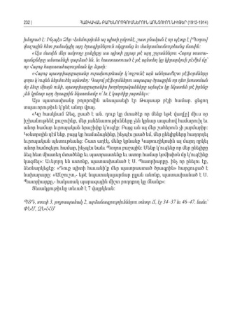 խնդրած է Ինչպէս Ձեր Վսեմութիւնն ալ պիտի ըմբռնէ շատ բնական է որ պէտք է Պօղոս : , [] փաշային հետ բանակցիլ այդ ծրագիրներուն սկզբանց եւ մանրամասնութեանց մասին : «Այս մասին մեր ամբողջ ըսելիքը սա պիտի ըլլար թէ այդ շրջաններու Հայոց տառա -պանքները անտանելի դարձած են եւ հաստատուած է թէ այնտեղ կը կիրարկուի րէժիմ մը՝ , որ Հայոց հարստահարութեան կը ձգտի : «Հայոց պատրիարքարանը ուրախութեամբ կ՚ողջունէ այն անհրաժեշտ րէֆօրմները զորս կ՚ուզեն ներմուծել այնտեղ Գալով րէֆօրմներու ապագայ ծրագրին որ դեռ խոստման : մը ձեւը միայն ունի պատրիարքարանիս խորհրդականները այնպէս կը նկատեն թէ իրենք , չեն կրնար այդ ծրագրին նկատմամբ ո՛ եւ է կարծիք յայտնել »: Այս պատասխանը բոլորովին անսպասելի էր Թալաաթ բէյի համար ցնցող . տպաւորութիւն կ՚ընէ անոր վրայ . «Կը հասկնամ Ձեզ ըսած է ան դուք կը մտածէք որ մենք եթէ վաղ ը միւս օր , . [ ] իշխանութենէ քաշուինք մեր յանձնառութիւնները չեն կրնար ապահով համարուիլ եւ , անոր համար եւրոպական երաշխիք կ՚ուզէք Բայց ան ալ մեր շահերուն չի յարմարիր : : Կօնտրօլին դէմ ենք բայց կը համաձայնինք ինչպէս ըսած եմ մեր ընելիքները հաղորդել . , , եւրոպական պետութեանց Շատ աղէկ մենք կրնանք Կաթուղիկոսին ալ մարդ ղրկել : , անոր համոզելու համար ինչպէս նաեւ Պօղոս բաշային Մենք կ՚ուզենք որ մեր ընելիքը , : ձեզ հետ միատեղ մտածենք եւ պատրաստենք եւ ատոր համար կօմիսիօն մը կ՚ուզէինք կազմել»: Աւելորդ են ատոնք պատասխանած է Ս Պատրիարքը ինչ որ ընելու էք , . . , ձեռնարկեցէք: «Դուք պիտի հաւանի՞ք մեր պատրաստած ծրագրին հարցուցած է » նախարարը Անշուշտ եթէ նպատակայարմար ըլլան անոնք պատասխանած է Ս: «,- , . Պատրիարքը հակառակ պարագային միշտ բողոքող կը մնանք,- »: Տեսակցութիւնը տեւած է վայրկեան 7 : ՊՏԴ տուփ, 3, թղթապանակ 2, արձանագրութիւններու տետր Ճ էջ , 34–37 46–47. եւնաեւ՝ ՓՆՄ ԶՆՀՀՄ, 232 |ՀԱՅԿԱԿԱՆ ԲԱՐԵՆՈՐՈԳՈՒՄՆԵՐՈՒՆ ԱՌՆՉՈՒՈՂ ՆԻՒԹԵՐ (1912-1914)