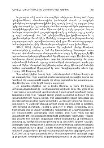 Բացասական աւելի տխուր հետեւանքներու տեղի չտալու համար Օսմ Հայոց . երեսփոխաններուն մեծամասնութիւնը խոհեմութիւն սեպած էր Հայկական պահանջները իր ամբողջ ծաւալով բեմին վրայ չպարզել վասնզի նոր ջարդերու վախը , երբէք անհետացած չէր Այլ կառավարութեան մօտ առանց աղմուկի եւ ցոյցի աշխատիլ : հայոց վիճակը բարելաւելու համար Աշխատութիւն մը որ երբէք չդադրեցաւ Փոքրա : : -մասնութիւնն այս աստիճան զգուշութիւնը չափազանց կը համարէր բայց կը նկատէր , որ արդէն սակաւաթիւ Հայ Օսմ երեսփոխանները իբր իթթիհատական եւ ոչ . իթթիհատական բաժնուած էին եւ հետեւելիք ուղղութեան մէջ ալ նոր բաժանում մը , թուրքաց աչքին առջեւ բոլորովին տկարանալ պիտի ըլլար Այս տեսարանը չպարզելու : համար փոքրամասնութիւնը մեծամասնութեան կարծիքին առջեւ խոնարհեցաւ : 1910- 1911- էնի վերջերը գաւառներու մէջ հայկական կեանքը հետզհետէ անհանդուրժելի կը դառնար եւ Օսմ Հայ երեսփոխանները Սատրազամ Սայիտ . Փաշային խիստ համեստ պարունակութեամբ ծանուցագիր մը ներկայացուցեր էին այլեւս անյապաղելի եղող բարեկարգական միջոցները պարունակող Այս դիմումը շատ : հանդիսաւոր կերպով կատարուեցաւ բայց Հայ ծերակուտականները մեր բոլոր , թախանձանքին հակառակ այլեւայլ պատճառներով չմասնակցեցան ինչպէս չորս , , տարուան մէջ երբէք հայկական խնդիրներով զբաղելու պէտքը չէին զգացած Նոյնպիսի : համեստ պահանջներով ներկայացած էր նաեւ Պատրիարքարանը յանուն Ազգ . Ժողովոյ 1912 Փետրուար 14- : ինԻնչպէս վերը յիշեցինք մաս մը Հայեր Սահմանադրական ռէժիմին թէ հայոց եւ թէ , առ հասարակ Օսմ բոլոր ազգերուն մասին սնանկութեան մը յանգիլը վաղուց նա . -խատեսած էին եւ այդ ատենէն զգացեր էին պէտքը բարուոքելու մեր յարաբերութիւն -ները Ռուսիոյ հետ իբրեւ վերջին յենակէտ Հայութեան , : Այդ յարաբերութիւնները յար եւ նմանը Թուրքաց եւ Հայոց մէջ եղածին , , փոխադարձ կասկածանքի եւ Ռուս կառավարութեան կողմէ Հայոց դէմ իբրեւ թէ առ , ի զգուշութիւն կամ զանազան պատճառանքով ի գործ դրուած հալածանքի քաղա , -քականութիւն մըն է ին Կովկասի Հայերը դուրսէն օգնութեան մը կարօտ էին այդ [ ]: յարաբերութիւնները շտկելու համար Մեր ազգայիններէն ոմանք օգնութեան այդ : գործը իրենց կարողութեան չափով կատարեցին Այս փորձերը սիրայօժար ընդունուե : -ցան այսպէս՝ Պ Չարիքովի միջոցով յաջողած եղանք նոր ուղղութիւն մը մտցնելու, . , [նոր թուական մը բանալու Ռուսիոյ եւ Հայոց մէջ ոչ միայն Ռուսահայոց այլ եւ] , , Տաճկահայոց վրայ ալ տարածելով Ռուսիոյ համակրութիւնը եւ պաշտպանութիւնը : Այս աշխատութիւնը կատարեցինք երկու հիմերու վրայ Նախ ջրելով այն ձրի : կասկածանքը զոր Ռուս կառավարութիւնը ունէր կարծելով թէ Հայերը ուրիշ Կովկաս , -եան ցեղերու հետ միացած կովկասեան անջատ իշխանութիւն մը հաստատելու , գաղափար մը այսինքն անջատողական միտք մը կը սնուցանեն Երկրորդ՝ ապացու , : -ցանելով թէ Հայոց պահպանումը եւ բարգաւաճումը թէ Կովկասի եւ թէ սահմանագլխի Օսմ գաւառներու մէջ ոչ միայն Ռուսերու շահերուն չի սպառնար այլ եւ իսկապէս. , համաձայն է այդ շահերուն վասն զի Հայ տարրը ըլլայ երկու կամ երեք միլիոն ցրուած , , 12,000,000- է աւելի իսլամ զանգուածի մը մէջ հաւասարակշռութեան թանկագին տարր , մը կը կազմէր եւ յառաջդիմական քաղաքակրթական ազդակ մը՝ զոր ստեղծել պէտք էր ՀԱՅԿԱԿԱՆ ԲԱՐԵՆՈՐՈԳՈՒՄՆԵՐՈՒՆ ԱՌՆՉՈՒՈՂ ՆԻՒԹԵՐ (1912-1914)| 243