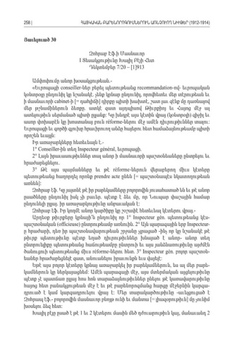 Յաւելուած 30 Զոհրաբ Էֆ ի Մասնաւոր . I Տեսակցութիւնը Խալիլ Բէյի Հետ Դեկտեմբեր 7/20 – [1]913 Ամփոփումը անոր խօսակցութեան .- «Եւրոպացի conseiller-ներ բերել պետութեանց recommandation- - ով եւրոպական կօնտրօլը ընդունիլ կը նշանակէ չենք կրնար ընդունիլ որովհետեւ մեր տէրութեան եւ . , ի մասնաւորի cabinet- [= իդահլիճի դիրքը պիտի խախտէ շատ լաւ զէնք մը դառնալով] , մեր թշնամիներուն ձեռքը ատկէ զատ այդպիսով Թիւրքիոյ եւ Հայոց մէջ ալ . ատելութիւն սերմանած պիտի ըլլանք Կը խնդրէ այս կէտին վրայ կօնտրօլի զիջիլ եւ : () ասոր փոխարէն կը խոստանայ բուն réforme-ներու մէջ ամէն դիւրութիւններ տալու : Եւրոպացի եւ գործի գլուխը հրաւիրուող անձը հայերու հետ համաձայնութեամբ պիտի որոշեն եւայլն : Իր առաջարկները հետեւեալն է .- 1° Conseiller- ին տեղ Inspecteur général, եւրոպացի. 2° Լայն իրաւասութիւններ տալ անոր ի մասնաւորի պաշտօնեաները ընտրելու եւ հրաժարեցնելու. 3° Թէ այս պայմանները եւ թէ réforme-ներուն վերաբերող միւս կէտերը պետութեանց հաղորդել որոնք prendre acte ընեն [= պաշտօնապէս նկատողութեան առնեն]: Զոհրաբ էֆ Կը յայտնէ թէ իր բարեկամները բոլորովին յուսահատած են եւ թէ անոր . ըսածները ընդունիլ իսկ չի բաւեր պէտք է ձեւ մը որ Նուպար փաշային համար . , ընդունելի ըլլայ իր առաջարկութիւնը անբաւական է . : Զոհրաբ էֆ Իր կողմէ անոր կարծիքը կը շօշափէ հետեւեալ կէտերու վրայ . .- Արդեօք թիւրքերը կրնայի՞ն ընդունիլ որ 1° Inspecteur gén. պետութեանց կէս -պաշտօնական (officieuse) ընտրութեամբ առնուին . 2° Այն պարագային երբ Inspecteur-ը հրաժարի դեռ իր պաշտօնավարութեան շրջանը չլրացած ինչ որ կը նշանակէ թէ , - թիւրք պետութիւնը պէտք եղած դիւրութիւններ խնայած է անոր անոր տեղ - ընտրուելիքը պետութեանց հաճութեամբը ընտրուի եւ այս յանձնառութիւնը այժմէն ծանուցուի պետութեանց միւս réforme-ներու հետ . 3° Inspecteur gén. բոլոր պաշտօն -եաներ հրաժարեցնելէ զատ անուանելու իրաւունքն եւս վայելէ , : Եթէ այս բոլոր կէտերը կրնայ առաջարկել իր բարեկամներուն ես ալ մեր բարե , -կամներուն կը ներկայացնեմ Ամէն պարագայի մէջ այս մտերմական այցելութիւնը : , պէտք չէ պատճառ ըլլայ հոս հոն տարաձայնութիւններ ընելու թէ կառավարութիւնը հայոց հետ բանակցութեան մէջ է եւ թէ բարենորոգմանց հարցը մէջերնին կարգա -դրուած է կամ կարգադրուելու վրայ է Մեր տարակարծութիւնը աւելցուցած է : - Զոհրապ էֆ բոլորովին մասնաւոր բնոյթ ունի եւ մանտա .- [= լիազօրութիւն մը չունիմ] խօսելու ձեզ հետ : Խալիլ բէյը ըսած է թէ եւ կէտերու մասին մեծ դժուարութիւն կայ մանաւանդ 1 2 , 2 258 |ՀԱՅԿԱԿԱՆ ԲԱՐԵՆՈՐՈԳՈՒՄՆԵՐՈՒՆ ԱՌՆՉՈՒՈՂ ՆԻՒԹԵՐ (1912-1914)