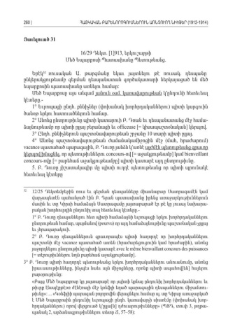 Յաւելուած 31 16/29 Դեկտ. [1]913, երկուշաբթի Մեծ Եպարքոսի Պատասխանը Պետութեանց . Երէկ ռուսական Ա թարգմանը եկաւ յայտնելու թէ ռուսակ դեսպանը52 . . ընկերակցութեամբ գերման դեսպանատան գործակատարի ներկայացած են մեծ եպարքոսին պատասխանը առնելու համար : Մեծ Եպարքոսը այս անգամ յանուն օսմ կառավարութեան կ՚ընդունի հետեւեալ . կէտերը.- 1° Եւրոպացի ընդհ քննիչներ փոխանակ խորհրդականներու պիտի կարգուին . ( ) ծանօթ երկու հատուածներուն համար . 2° Անոնց ընտրութիւնը պիտի կատարուի Բ Դռան եւ դեսպանատանց մէջ համա . -ձայնութեամբ որ պիտի ըլլայ բերանացի եւ officeuse [= կիսապաշտօնական կերպով] . 3° Ընդհ քննիչներուն պաշտօնավարութեան շրջանը. 10 տարի պիտի ըլլայ . 4° Անոնց պաշտօնավարութեան ժամանակամիջոցին մէջ մահ հրաժարում (, ) vacance պատահած պարագային Բ Դուռը յանձն կ՚առնէ այժմէն պետութեանց գրաւոր , . կերպով իմացնել որ պետութիւններու , concours- [= ովաջակցութեամբ կամ ] bienveillant concours-ովը [= բարեհաճ աջակցութեամբը պիտի կատարէ այդ ընտրութիւնը ] . 5. . Բ Դուռը յիշատակագիր մը պիտի ուղղէ պետութեանց որ պիտի պրունակէ հետեւեալ կէտերը 52 12/25 Դեկտեմբերին ռուս եւ գերման դեսպանները միասնաբար Սատրազամէն կամ վարչապետէն պահանջած էին Բ Դրան պատասխանը իրենց առաջարկութիւններուն . մասին եւ տը Կիրսի համաձայն Սատրազամը յայտարարած էր թէ կը յուսայ նախարա -րական խորհուրդին ընդունիլ տալ հետեւեալ կէտերը .- 1° . Բ Դուռը դեսպաններու հետ պիտի համաձայնի եւրոպացի երկու խորհրդականներու ընտրութեան համար պայմանով , (pourvu) որ այդ համաձայնութիւնը պաշտօնական չըլլայ եւ չհրապարակուի . 2° . Բ Դուռը դեսպաններուն գրաւորապէս պիտի հաղորդէ որ խորհրդականներու պաշտօնի մէջ vacance պատահած ատեն հրաժարեցուցուին կամ հրաժարին անոնց ( ), յաջորդներու ընտրութիւնը պիտի կատարէ avec le même bienvaillant concours des puissances [= տէրութիւններու նոյն բարեհաճ աջակցութեամբ ]. 3° . Բ Դուռը պիտի հաղորդէ պետութեանց երկու խորհրդականներու անուանումը անոնց , իրաւասութիւնները ինչպէս նաեւ այն միջոցները որոնք պիտի ապահով են հայերու, , [ ] բարօրութիւնը: «Բայց Մեծ Եպարքոսը կը յայտարարէ որ չպիտի կրնայ ընդունիլ խորհրդականներու եւ թիւրք էնսպէքթէօռ ժէնէռալի մէջ կօնֆլի եղած պարագային դեսպաններու միջամտու -թիւնը»: ... «Կօնֆլիի պարագան բոլորովին վերացնելու համար պ տը Կիրսը առաջարկած . է Մեծ Եպարքոսին ընդունիլ եւրոպացի ընդհ կառավարչի սիստէմը փոխանակ խոր . ( -հրդականներու որով վերցուած կ՚ըլլա ն դժուարութիւնները) [ ] » (ՊՏԴ տուփ, 3, թղթա -պանակ 2, արձանագրութիւններու տետր Ճ , 57–58):260 |ՀԱՅԿԱԿԱՆ ԲԱՐԵՆՈՐՈԳՈՒՄՆԵՐՈՒՆ ԱՌՆՉՈՒՈՂ ՆԻՒԹԵՐ (1912-1914)