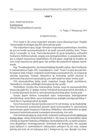 ԿՑՈՐԴ ԱԶԳ ՊԱՏՐԻԱՐՔԱՐԱՆ. Խորհրդաբար (Միայն Առաջնորդներուն յատուկ ) Կ Պոլիս. , 17 Փետրուար 1914 ՇՐՋԱԲԵՐԱԿԱՆ Մօտ տարի եւ կէս առաջ հայկական դժբախտ դատը վերաբացուեցաւ Բերլինի Վեհաժողովին մասնակցող վեց մեծ պետութեանց կողմէ : Մեր աղերսներուն վրայ Ազգիս Վեհափառ Հայրապետը բարեհաճեցաւ ստանձնել , իր թշուառ հօտին պաշտպանութիւնը եւ իր կողմէ պաշտօն յանձնեց Վսեմ Պօղոս . փաշա Նուպարին որ Հայկ Պատուիրակութեան մը գլուխ կանգնելով ամենամեծ , . , եռանդով եւ ձեռնհասութեամբ յաղթեց շատ մը խոչընդոտներու եւ քաղաքական ներ , , -կայ ոչ այնքան նպաստաւոր պայմաններու մէջ իսկ կրցաւ արդիւնքի մը հասցնել որ , շատ աւելի նպաստաւոր պիտի ըլլար եթէ չբռնկէր միջ բալկանեան երկրորդ պատե , - -րազմը: Ազգ Պատրիարքարանս իր հանգամանքները ներածին չափով միշտ համերաշխ. ,- ,- եւ համախորհուրդ Ազգիս Վեհ Կաթողիկոսի եւ Վսեմ Պօղոս Նուպար փաշայի հետ . . , իր կարեւոր դերը ունեցաւ Հայկական դատի ներկայ յաջողութեան մէջ որ աւելորդ կը , գտնանք բացատրել Սակայն անհրաժեշտ կը համարենք այժմէն բնորոշել եւ : գնահատել ձեռք բերուած յաջողութիւնը ըստ այնմ արդիւնաւորելու համար զայն , : Մեծ պետութիւնները իրենց կողմէ Հայկական հարցի վերջին շրջաններուն , Գերմանիոյ եւ Ռուսիոյ յանձնեցին հետապնդումը մեր դատին : Գերմանիան Ռուսիոյ հետ համաձայնելու համար կարգ մը սրբագրութիւններ, , մտցուց ծրագրին մէջ Ա փրկելու համար Օսմանեան կառավարութեան բրէստիժը եւ , . , Բ առանց նիւթական ճնշման եւ դժուարութեանց ընդունելի ընելու համար զայն. : Այսպէս կրցան միանալ եւրոպական երկու հակառակորդ խմբակցութեան տեսակէտները որոնք մինչեւ այսօր համախորհուրդ վարեցին բանակցութիւնները Բ, . Դրան հետ եւ եզրակացութեան մը բերին : Այսօր հաստատուն կերպով երաշխաւորուած են այն կէտերը որ կը ներփակենք , : Անոր հաստատման կայսերական իրատէն պիտի հրատարակուի եւ պետութեանց պաշտօնապէս պիտի հաղորդուի Ընդհանուր Քննիչներու անուանման հետ որ պիտի կատարուի համաձայնութեամբ եւրոպական պետութեանց մօտ օրէն , : Սոյն համաձայնագիրը կը պարունակէ Հայկական բարեկարգութեանց հիմնական կէտերը միայն անոնց մանրամասնութիւնները եւ մեր կարգ մը բաղձանքները պիտի . ջանանք որ մտցուին Ընդհանուր Քննիչներու հրահանգներուն մէջ որ պիտի պատրաս , -տուի վերջիններու մասնակցութեամբ Հիմնական սոյն կէտերը թէեւ մեր ազգային : բոլոր իղձերուն եւ պահանջներուն ամբողջական գոհացում մը չեն տար սակայն , կրնանք ըսել նաեւ թէ ան նախաքայլ մըն է հանգրուան մը որու միջոցին Հայ ժողո , , -276 |ՀԱՅԿԱԿԱՆ ԲԱՐԵՆՈՐՈԳՈՒՄՆԵՐՈՒՆ ԱՌՆՉՈՒՈՂ ՆԻՒԹԵՐ (1912-1914)