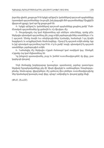 լեզուներ գիտեն լրացուցա՞ծ են երկրի օրէնքով եւ կանոններով որոշուած պայմանները , (դատական պաշտօնեաները Հուգուգէն իսկ վարչային մեծ պաշտօնեաները Միւլքիյէէն , վկայուած ըլլալը կամ որո՞նք լրացուցած են ), : 4.- Երկրի օրէնքով եւ կանոններով որոշուած պայմանները լրացնող քանի՞ Մահ -մէտական պաշտօնեաներ կը գտնուին եւ ո՞ր ճիւղերու մէջ 5.- Ցուցակագրել Հայ կամ Քրիստոնեայ այն անձերու անունները որոնք թէեւ , ներկայիս պետական պաշտօնեայ չեն բայց ունին յարմարութիւններ ստանձնելու ո՛ եւ , է պաշտօն Անոնց մասին եւս տեղեկութիւններ նշանակել համաձայն : , 3- րդ կէտին հարցերուն եւ աւելցնելով նաեւ հետեւեալները Այսօր ի՞նչ պաշտօն ունին անոնք երբ, .- . եւ իցէ պետական պաշտօնեայ եղա՞ծ են ո՞ւր եւ քանի՞ տարի պետական ի՞նչ պաշտօն . . ստանձնելու յարմարութիւն ունին : 6.- Նահանգիդ մէջ ներկայիս ո՞րքան ժանտարմ կամ ոստիկան կայ Անոնցմէ : ո՞րքանը Հայ կամ Քրիստոնեայ են : Կը խնդրուի պատասխանել լուրջ եւ խոհեմ ուսումնասիրութենէ մը վերջ ըստ , , կարելւոյն փութով : * Սոյն ձեռնարկը խորհրդաբար կատարելու պատճառով յարմար դատուեցաւ , ներփակ Շրջաբերականները յղել մի՛ միայն վիլայէթի եւ սանճագներու Առաջնորդու -թեանց հետեւաբար վիլայէթներու մէջ գտնուող միւս թեմերու ուսումնասիրութիւնը. , Ձեր հրահանգով կատարել տալէ վերջ պէտք է ամփոփէք եւ փութով ղրկէք մեզի , : (ՓՆՄ ԶՆՀՀՄ, ) ՀԱՅԿԱԿԱՆ ԲԱՐԵՆՈՐՈԳՈՒՄՆԵՐՈՒՆ ԱՌՆՉՈՒՈՂ ՆԻՒԹԵՐ (1912-1914)| 279
