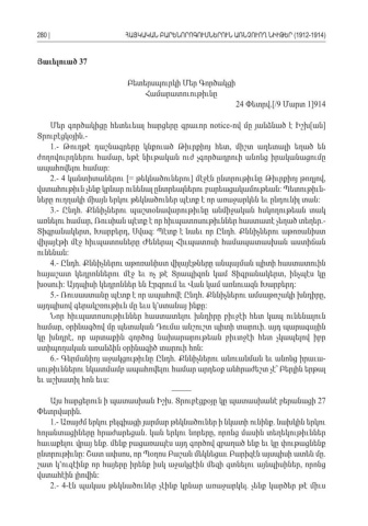 Յաւելուած 37 Բետերսպուրկի Մեր Գործակցի Համարատուութիւնը 24 Փետրվ.[/9 Մարտ 1]914 Մեր գործակիցը հետեւեալ հարցերը գրաւոր notice- ով մը յանձնած է Իշխ ան [] Տրուբէցկօյին.- 1.- Թուղթէ դաշնագրերը կնքուած Թիւրքիոյ հետ միշտ աղետալի եղած են , ժողովուրդներու համար եթէ նիւթական ուժ չգործադրուի անոնց իրականացումը , ապահովելու համար : 2.- 4 կանտիտաներու [= թեկնածուներու մէջէն ընտրութիւնը Թիւրքիոյ թողլով] , վստահութիւն չենք կրնար ունենալ ընտրեալներու բարեացակամութեան Պետութիւն : -ները ուղղակի միայն երկու թեկնածուներ պէտք է որ առաջարկեն եւ ընդունիլ տան : 3.- Ընդհ Քննիչներու պաշտօնավարութիւնը անմիջական հսկողութեան տակ. առնելու համար Ռուսիան պէտք է որ հիւպատոսութիւններ հաստատէ չեղած տեղեր , .- Տիգրանակերտ Խարբերդ Սվազ Պէտք է նաեւ որ Ընդհ Քննիչներու աթոռանիստ, , : . վիլայէթի մէջ հիւպատոսները Ժեներալ Հիւպատոսի համապատասխան աստիճան ունենան: 4.- Ընդհ Քննիչներու աթոռանիստ վիլայէթները անպայման պիտի հաստատուին. հայաշատ կեդրոններու մէջ եւ ոչ թէ Տրապիզոն կամ Տիգրանակերտ ինչպէս կը , խօսուի Այդպիսի կեդրոններ են Էրզրում եւ Վան կամ առնուազն Խարբերդ: : 5.- Ռուսաստանը պէտք է որ ապահովէ Ընդհ Քննիչներու ամսաթոշակի խնդիրը . , այդպիսով գերակշռութիւն մը եւս կ՚ստանայ ինքը : Նոր հիւպատոսութիւններ հաստատելու խնդիրը բիւջէի հետ կապ ունենալուն համար օրինագծով մը պետական Դումա անշուշտ պիտի տարուի այդ պարագային, . կը խնդրէ որ արտաքին գործոց նախարարութեան բիւտջէի հետ չկապելով իբր , ստիպողական առանձին օրինագիծ տարուի հոն : 6.- Գերմանիոյ աջակցութիւնը Ընդհ Քննիչներու անուանման եւ անոնց իրաւա . -սութիւններու նկատմամբ ապահովելու համար արդեօք անհրաժեշտ չէ՞ Բերլին երթալ եւ աշխատիլ հոն եւս : ––––– Այս հարցերուն ի պատասխան Իշխ Տրուբէցքօյը կը պատասխանէ բերանացի . 27 Փետրվարին. 1.- Առայժմ երկու բելգիացի յարմար թեկնածուներ ի նկատի ունինք նախկին երկու . հոլանտացիները հրաժարեցան կան երկու նորերը որոնց մասին տեղեկութիւններ . , հաւաքելու վրայ ենք մենք բացառապէս այդ գործով զբաղած ենք եւ կը փութացնենք . ընտրութիւնը Շատ ափսոս որ Պօղոս Բաշան մեկնեցաւ Բարիզէն այսպիսի ատեն մը: , . շատ կ՚ուզէինք որ հայերը իրենք իսկ աջակցէին մեզի գտնելու այնպիսիներ որոնց , վստահէին լիովին : 2.- 4- էն պակաս թեկնածուներ չէինք կրնար առաջարկել չենք կարծեր թէ միւս . 280 |ՀԱՅԿԱԿԱՆ ԲԱՐԵՆՈՐՈԳՈՒՄՆԵՐՈՒՆ ԱՌՆՉՈՒՈՂ ՆԻՒԹԵՐ (1912-1914)