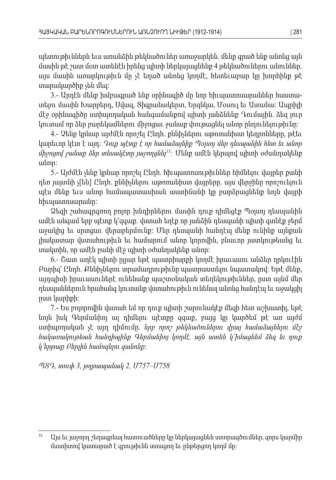 պետութիւններն եւս առանձին թեկնածուներ առաջարկեն մենք գրած ենք անոնց այն . մասին թէ շատ մօտ ատենէն իրենց պիտի ներկայացնենք թեկնածուներու անուններ 4 . այս մասին առարկութիւն մը չէ եղած անոնց կողմէ հետեւաբար կը խորհինք թէ , տարակարծիք չեն մեզ : 3.- Արդէն մենք խմբագրած ենք օրինագիծ մը նոր հիւպատոսարաններ հաստա -տելու մասին Խարբերդ Սվազ Տիգրանակերտ Երզնկա Մօսուլ եւ Ատանա Ապրիլի , , , , : մէջ օրինագիծը ստիպողական հանգամանքով պիտի յանձնենք Դումային ձեզ լուր . կուտամ որ ձեր բարեկամներու միջոցաւ ջանաք փութացնել անոր ընդունելութիւնը : 4.- Չենք կրնար այժմէն որոշել Ընդհ քննիչներու աթոռանիստ կեդրոնները թէեւ . , կարեւոր կէտ է այդ : Դուք պէտք է որ համաձայնիք Պօլսոյ մեր դեսպանին հետ եւ անոր միջոցով ջանաք ձեր տեսակէտը յաջողցնել 55: Մենք ամէն կերպով պիտի օժանդակենք անոր: 5.- Այժմէն չենք կրնար որոշել Ընդհ հիւպատոսութիւններ հիմնելու վայրեր քանի . դեռ յայտնի չ են Ընդհ քննիչներու աթոռանիստ վայրերը այս վերջինը որոշուելուն [ ] . . պէս մենք եւս անոր համապատասխան աստիճանի կը բարձրացնենք նոյն վայրի հիւպատոսարանը: Ձեզի շահագրգռող բոլոր խնդիրներու մասին դուք դիմեցէք Պօլսոյ դեսպանին ամէն անգամ երբ պէտք կ՚զգաք վստահ եղէք որ յանձին դեսպանի պիտի գտնէք ջերմ . աջակից եւ սրտցաւ վերաբերմունք Մեր դեսպանի հանդէպ մենք ունինք այնքան : լիակատար վստահութիւն եւ համարում անոր կորովին բնաւոր յատկութեանց եւ , տակտին որ ամէն բանի մէջ պիտի օժանդակենք անոր, : 6.- Շատ աղէկ պիտի ըլլար եթէ պատրիարքի կողմէ իրաւասու անձեր ղրկուէին Բարիզ՝ Ընդհ Քննիչներու տրամադրութիւնը պատրաստելու նպատակով Եթէ մենք . : , այդպիսի իրաւասուներէ ունենանք պաշտօնական տեղեկութիւններ ըստ այնմ մեր , դեսպաններուն հրահանգ կուտանք վստահութիւն ունենալ անոնց հանդէպ եւ աջակցիլ ըստ կարիքի : 7.- Ես բոլորովին վստահ եմ որ դուք պիտի շարունակէք մեզի հետ աշխատիլ եթէ , նոյն իսկ Գերմանիոյ ալ դիմելու պէտքը զգաք բայց կը կարծեմ թէ առ այժմ , ստիպողական չէ այդ դիմումը . երբ որոշ թեկնածուներու վրայ համաձայնելու մէջ հակառակութեան հանդիպինք Գերմանիոյ կողմէ այն ատեն կ՚իմացնեմ ձեզ եւ դուք , կ՚երթաք Բերլին համոզելու զանոնք : ՊՏԴ տուփ, 3, թղթապանակ 2, 757– 758ՄՄ 55 Այս եւ յաջորդ շեղագրեալ հատուածները կը ներկայացնեն ստորագծումներ զորս կարմիր , մատիտով կատարած է գրութիւնն ստացող եւ ընթերցող կողմ մը :ՀԱՅԿԱԿԱՆ ԲԱՐԵՆՈՐՈԳՈՒՄՆԵՐՈՒՆ ԱՌՆՉՈՒՈՂ ՆԻՒԹԵՐ (1912-1914)| 281