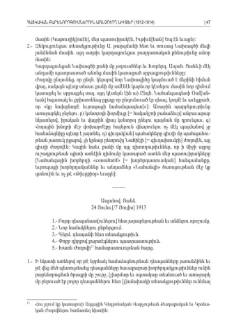 մասին Կաթուղիկ ոսէն մեր պատուիրակէն Իւթիւճ եան Եպ էն եւայլն ([], , [] . ): 2.-Զեկուցուեցաւ տեսակցութիւնը Ա թարգմանի հետ եւ ռուսաց Նախագծի մեզի . յանձնման մասին այդ առթիւ կարդացուեցաւ բաղդատական քննութիւնը անոր . մասին: Կարդացուեցան Նախագծի քանի մը յօդուածներ եւ Խորհրդ Ապահ Յանձ ի մէկ . . . անդամի պատրաստած անոնց մասին կատարած սրբագրութիւնները : Ժողովը ընդունեց որ ընդհ կերպով նոր Նախագիծը կազմուած է մերինի հիման , . վրայ սակայն պէտք տեսաւ քանի մը ամէնէն կարեւոր կէտերու մասին նոր դիմում, կատարել եւ սրբագրել տալ այդ կէտերն էին ա Ընդհ Նահանգապետի Օսմ ան . ) . [ -եան հպատակ եւ քրիստոնեայ ըլլալը որ ընդունուած էր դեսպ կողմէ եւ աւելցրած] . , որ « կը նախընտրէ եւրոպացի նահանգապետ [»]: Առաջին պարբերութիւնը առաջարկել ջնջելու բ կօնտրօլի ֆօրմիւլը . ) [= հակակշռի բանաձեւը անբաւարար ] նկատելով իրական եւ վայրին վրայ կօնտրօլ ընելու պայման մը դրուեցաւ գ, . ) Հողային խնդրի մէջ փոխարժէքը հայերուն վճարուելու ոչ մէկ պայմանով չը համաձայնիլը պէտք է յայտնել դ գիւղակ ան պահակները գիւղի մը պահպանու . ) [] -թեան յատուկ ըլլալով չի կրնար ընտրուիլ Նահիէյի , [= գիւղախումբի ժողովէն այլ] , գիւղի ժողովէն Կային նաեւ քանի մը այլ դիտողութիւններ որ ի միջի այլոց : , ուշադրութեան պիտի առնէին դիմումը կատարած ատեն մեր պատուիրակները [Նահանգային խորհրդի «consultatif» [= խորհրդատուական հանգամանքը] , եւրոպացի խորհրդականներ եւ անդամներ Նահանգի ծառայութեան մէջ կը «» գտնուին եւ ոչ թէ Թիւրքիոյ եւայլն «» ]: ––––– Ապահով Յանձ. . 24 Յունս.[/7 Յուլիս] 1913 1.- Բոլոր դեսպանատ ուներու հետ յարաբերութեան եւ անձերու որոշումը [] . 2.- Նոր նամակներու ընթերցում . 3.- Գերմ դեսպանի հետ տեսակցութիւն. . 4.- Փոքր դիրքով քարտէզներու պատրաստութիւն . 5.- Խառն Ժողովի համարատուութեան հարց 17 . 1.- Ի նկատի առնելով որ թէ երրեակ համաձայնութեան դեսպանները յառանձինն եւ թէ վեց մեծ պետութեանց դեսպանները հաւաքաբար խորհրդակցութիւններ ունին բարենորոգման ծրագրի մը շուրջ յ արմար եւ օգտակար տեսնուած եւ առաջարկ , [ ] մը բերուած էր բոլոր դեսպաններու հետ յ աճախակի տեսակցութիւններ ունենալ [ ] 17 Հոս յղում կը կատարուի Ազգային Կեդրոնական Վարչութեան Քաղաքական եւ Կրօնա -կան Ժողովներու համատեղ նիստին :ՀԱՅԿԱԿԱՆ ԲԱՐԵՆՈՐՈԳՈՒՄՆԵՐՈՒՆ ԱՌՆՉՈՒՈՂ ՆԻՒԹԵՐ (1912-1914)| 47