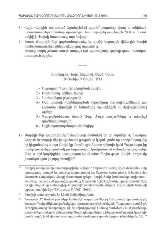 4.- Հայկ Հարցին նուիրուած ֆրանս երէն գրքին քարտէզը սխալ եւ անխնամ. [] 20 պատրաստուելուն համար որոշուեցաւ հոս տպագրել տալ նորէն , 2000 . 5 օրօսմ. ոսկի ի Ժողովը հաստատեց այս ծախքը[ ]: : 5.- Խառն Ժողովին մեր գործառնութեանց եւ գործի նորագոյն վիճակին մասին համարատուութիւն ընելու պէտք ցոյց տրուած էր : Ժողովը հարկ չտեսաւ ատոր սակայն եթէ պահանջուի կարելի գտաւ համարա . , -տուութիւն մը ընել : ––––– Խորհրդ եւ Վարչ Ապահով Յանձ Նիստ. . . . 24 Յունիս[/7 Յուլիս] 1913 1.- Եւրոպայի Պատուիրակութեան մասին . 2.- Բոլոր դեսպ դիմելու հարցը . . 3.- Նամակներու ընթերցումը . 4.- Օսմ կառավ Բարենորոգման վերաբերող վեց յօդ ուածներու յա. . [] -ւելուածը Վիլայէթի [= նահանգի նոր օրէնքին եւ Վիլ այէթներու] [] օրէնքը. 5.- Գաղթականներու մասին Ազգ Ժող ի որոշումները եւ անո նց . . [ ] գործնականացումը. 6.- Ինքնապաշտպանութեան խնդիրը . 1.- Բարիզի մեր պատուիրակը մասնաւոր նամակով մը կը յայտնէր թէ՝ Նուպար 21 Փաշան Եւրոպայի մէջ իր պաշտօնը լրացած կը կարծէ քանի որ գործը Պօլսոյ մէջ , կը կեդրոնանայ եւ այս մասին կը մտածէ գրել Կաթուղիկոսին կա՛մ Պօլիս գալու իր առաքելութիւնը շարունակելու նպատակով կամ լուծուած ճանաչել իր պաշտօնը , : Թեր եւ դէմ կարծիքներ արտայայտուեցան անոր Պօլիս գալու մասին որոշումը . յետաձգուեցաւ յաջորդ ժողովին 22: 20 Խնդրոյ առարկայ հրատարակութիւնը Գրիգոր Զօհրապի Մարսէլ Լէար ծածկանուամբ հրապարակ դրուած եւ քարտէզ պարունակող La Question arménienne à la lumière des documents (Հայկական Հարցը Փաստաթուղթերու Լոյսին Տակ ֆրանսալեզու աշխատու ) -թիւնն էր Կը թուի թէ քարտէզը գործն էր Անթուան Ճէնտէրէճեանի որուն անուան մէկէ : , աւելի անգամ կը հանդիպինք Ապահովութեան Յանձնաժողովի հաշուական Տոմարի ելքերու բաժնին մէջ ՊՏԴ տուփ (, 8, 627- 660):ՄՄ21 Փարիզի պատուիրակն էր Լեւոն Տէմիրճիպաշեան :22 Նուպարի 27 Յունիս թուակիր նամակէն՝ ուղղուած Գէորգ Ե ի յստակ կը դառնայ թէ . , Նուպար Պոլիս մեկնելով բանակցելու դիտաւորութիւն չէ ունեցած Պարզապէս ըսած է թէ : Թուրքիոյ Հայոց Պատրիարքութիւնը միակ կոչեալն է անոնց հետեւելու եւ թէ բարեկար « » -գութիւններու խնդրին քննարկումը Պոլսոյ դեսպաններուն թելադրուած ըլլալով կաթողի , -կոսին կողմէ իրեն վստահուած պաշտօնը գոհացում գտած կ՚ըլլայ « » (Հովսեփյան, 36): 7 ՀԱՅԿԱԿԱՆ ԲԱՐԵՆՈՐՈԳՈՒՄՆԵՐՈՒՆ ԱՌՆՉՈՒՈՂ ՆԻՒԹԵՐ (1912-1914)| 49