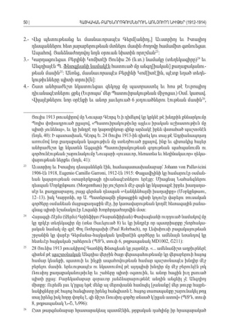 2.- Վեց պետութեանց եւ մասնաւորապէս Գերմ անիոյ [,] Աւստրիոյ եւ Իտալիոյ դեսպաններու հետ յարաբերութեան մտնելու մասին ժողովը համամիտ գտնուեցաւ Ապահով Յանձնաժողովոյ նոյն օրուան նիստին որոշման. 23: 3.- Կարդացուեցաւ Բերլինի Կոմիտէի Յունիս 26 ( . .) ն տ նամակը տեղեկագիրը () 24եւԱնգղիայէն Պ Ֆնտգլեանի նամակէն հատուած մը անգղ իական քաղաքականու . [] -թեան մասին 25: Անոնց մասնաւորապէս Բերլինի Կոմ իտէ ին պէտք եղած տեղե, [] , -կութիւնները պիտի տրուի ն [ ]: 4.- Շատ անհրաժեշտ նկատուեցաւ զեկոյց մը պատրաստել եւ հոս թէ Եւրոպիոյ դիւանագէտներու ցրել Եւրոպա՝ մեր Պատուիրակութեան միջոցաւ Օսմ կառավ ( ) . . Վիլայէթներու նոր օրէնքի եւ անոր յաւելուած յօդուածներու էութեան մասին 6 26, Յուլիս 1913 թուակիրով մը Նուպար Գէորգ Ե ի դիմելով կը կրկնէ թէ խնդրին քննարկումը . Պոլիս փոխադրուած ըլլալով Պատուիրակութիւնը այլեւս իրական աշխատութիւն մը , « պիտի չունենայ եւ կը խնդրէ որ կաթողիկոսը զինք արձակէ իրեն վստահած պաշտօնէն », (նոյն, 40): Ի պատասխան Գէորգ Ե, . 24 Յուլիս 1913- ին դիտել կու տայ թէ Ադրիանապոլսոյ առումով նոր քաղաքական կացութիւն մը ստեղծուած ըլլալով ինք եւ գիտակից հայեր , անհրաժեշտ կը նկատեն Ազգային Պատուիրակութեան գոյութեան պահպանումն ու գործունէութեան շարունակումը Նուպարի լուսաւոր հեռատես եւ հեղինակաւոր ղեկա «, » -վարութեան ներքեւ նոյն (, 41): 23 Աւստրիոյ եւ Իտալիոյ դեսպաններն էին համապատասխանաբար՝ , Johann von Pallavicini 1906- 1918, Eugenio Camillo Garroni, 1912- 1915: էնէնՓալլավիչինի կը համարուէր օսման -եան կայսրութեան օտարերկրացի դիւանագէտներու երէցը Միացեալ Նահանգներու : դեսպան Մորկընթաու (Morgenthau) իր յուշերուն մէջ զայն կը նկարագրէ իբրեւ խաղաղա -սէր եւ քաղցրաբարոյ բայց գերման դեսպան Վանկենհայմի խաղալիքը Մօրկընթաու , « » (, 12–13). իսկ Կարրոնի որ Ա Պատերազմի ընթացքին պիտի կոչուէր վարելու ռուսական , . գործերը օսմանեան մայրաքաղաքին մէջ իր կառավարութեան կողմէ հետագային բանա , -գնաց պիտի նշանակուէր Լոզանի Խորհրդաժողովին մօտ : 24 Հայազգի Ճէյմս Ջեյմս Գրինֆիլտ Գարանֆիլեան Փափազեանի ուղղուած նամակով մը () () կը ղրկէր տեղեկագիր մը տես Յաւելուած ( 8) եւ կը խնդրէր որ պատրիարքը շնորհակա -լական նամակ մը գրէ Փոլ Ռոհրպախի (Paul Rohrbach), որ Լեփսիուսի բացակայութեան շրջանին կը վարէր Գերմանա հայկական կոմիտէին գործերը եւ ամենայն եռանդով կը - հետեւէր հայկական շահերուն ՊՏԴ տուփ (, 6, թղթապանակ MD1002, 211):Շ25 28 Յունիս 1913 թուակիրով Գառնիկ Ֆնտգլեան կը յայտնէր . «... ամենաճիշտ աղբիւրներէ գիտեմ թէ պաշտօնական Անգղիա վերջին ծայր վերապահութեամբ կը վերաբերուի հայոց համար կեանքի պատուի եւ ինչքի ապահովութեան համար պաշտօնապէս խնդիր մէջ , բերելու մասին երեւութապէս ու նկատումով թէ այդպիսի խնդիր մը մէջ բերուելէն լոկ . Ռուսիոյ քաղաքականութիւնը եւ շահերը պիտի օգտուին եւ անոր հացին իւղ քսուած , պիտի ըլլայ Բարեկամաբար զօրաւոր յանձնարարութենէ անդին անցնիլ չէ Անգղիոյ : միտքը Ուրեմն լաւ կ՚ըլլայ եթէ մենք ալ մերովսանն համոզել ջանանք մեր թուրք հայրե: [] -նակիցները թէ հայոց հանգիստը իրենց հանգիստն է հայոց տառապանքը շարունակել թոյլ . տալ իրենց իսկ հորը փորել է զի ճիշտ Ռուսիոյ գործը տեսած կ՚ըլլան ատով ՊՏԴ տուփ , » (, 8, թղթապանակ Ն Շ Ն - , 996):26 Ըստ թարգմանաբար հրատարակեալ պատճէնին թրքական դահլիճը իր հրապարակած , 50 |ՀԱՅԿԱԿԱՆ ԲԱՐԵՆՈՐՈԳՈՒՄՆԵՐՈՒՆ ԱՌՆՉՈՒՈՂ ՆԻՒԹԵՐ (1912-1914)