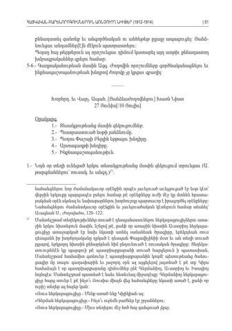 քննադատել զանոնք եւ անգործնական ու անհեթեթ ըլլալը ապացուցել Յանձ : -նուեցաւ անդամներ է ն մէկուն պատրաստելու [ ] : Պօլսոյ հայ թերթերուն ալ որոշուեցաւ դիմում կատարել այդ առթիւ քննադատող խմբագրականներ գրելու համար : 5-6.- Գաղթականութեան մասին Ազգ Ժողովին որոշումները գործնականացնելու եւ . ինքնապաշտպանութեան խնդրով ժողովը չը կրցաւ զբաղիլ : ––––– Խորհրդ եւ Վարչ Ապահ Յանձնաժողովներու Խառն Նիստ. . . [] 27 Յունիս[/10 Յուլիս] Օրակարգ. 1.- Տեսակցութեանց մասին զեկուցումներ . 2.- Պատրաստուած նօթի յանձնումը . 3.- Պօղոս Փաշայի Բերլին երթալու խնդիրը . 4.- Արտագաղթի խնդիրը . 5.- Ինքնապաշտպանութիւն. 1.- Նոյն օր տեղի ունեցած երկու տեսակցութեանց մասին զեկուցում տրուեցաւ Ա ( . թարգմաններու՝ ռուսակ եւ անգղ . .) : 27նահանգներու նոր ժամանակաւոր օրէնքին որպէս յաւելուած աւելցուցած էր եօթ կէտ՝ վերջին երկուքը պարզապէս ըսելու համար թէ օրէնքները ուժի մէջ կը մտնեն հրատա -րակման օրէն սկսեալ եւ նախարարներու խորհուրդը պարտաւոր է իրագործել օրէնքները : Նահանգներու ժամանակաւոր օրէնքին եւ յաւելուածական կէտերուն համար տեսնել՝ Աւագեան Ս ., Ժողովածու, 120–122:27 Մանտելշթամ տեղեկութիւններ տուած է դեսպանատուներու ներկայացուցիչներու առա -ջին երկու նիստերուն մասին նշելով թէ քանի որ առաջին նիստին Աւստրիոյ ներկայա , , -ցուցիչը առաջարկած էր նախ նկատի առնել օսմանեան ծրագիրը երեկոյեան ռուս , դեսպանն իր խորհրդականը ղրկած է դեսպան Փալլավիչինիի մօտ եւ ան տեղի տուած ըլլալով երկրորդ նիստին քննարկման հիմ ընդունուած է ռուսական ծրագիրը Տեղեկա, : -տուութենէն կը պարզուի թէ պատրիարքարանի տուած հարցերուն ի պատասխան , Մանտելշթամ համամիտ գտնուեր է պատրիարքարանին կողմէ պետութեանց ծանու -ցագիր մը տալու գաղափարին եւ յաջորդ օրն ալ այցելելով յայտնած է թէ տը Կիրս համաձայն է որ պատրիարքարանը դիմումներ ընէ Գերմանիոյ Աւստրիոյ եւ Իտալիոյ , նոյնպէս Մանտելշթամ պատմած է նաեւ հետեւեալ միջադէպը Գերմանիոյ ներկայացու: : -ցիչը հարց տուեր է թէ ինչո՞ւ Ռուսիա միայն վեց նահանգները նկատի առած է քանի որ , ուրիշ տեղեր ալ հայեր կան : «Ռուս ներկայացուցիչը Մենք առած ենք Կիլիկիան ալ .- : «Գերման ներկայացուցիչը Ինչո՞ւ ուրեմն բաժներ էք շրջաններու .- : «Ռուս ներկայացուցիչը Միւս տեղերու մէջ հոծ հայ զանգուած չկայ .- : ՀԱՅԿԱԿԱՆ ԲԱՐԵՆՈՐՈԳՈՒՄՆԵՐՈՒՆ ԱՌՆՉՈՒՈՂ ՆԻՒԹԵՐ (1912-1914)| 51