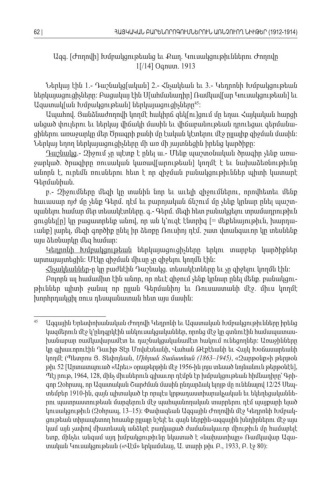 Ազգ Ժողովի Խմբակցութեանց եւ Քաղ Կուսակցութիւններու Ժողովը. [] . 1[/14] Օգոստ. 1913 Ներկայ էին 1.- Դաշնակց ական[] 2.- Հնչակեան եւ 3.- Կեդրոնի Խմբակցութեան ներկայացուցիչները Բացակայ էին Ս ահմանադիր Ռամկավ ար Կուսակցութեան եւ: [] [ ] Ազատակ ան Խմբակցութեան ներկայացուցիչները[ ] 45: Ապահով Յանձնաժողովի կողմէ հակիրճ զեկ ու ցում մը եղաւ Հայկական հարցի. [ ] անցած փուլերու եւ ներկայ վիճակի մասին եւ վիճաբանութեան դրուեցաւ գերմանա -ցիներու առաջարկը մեր Ծրագրի քանի մը էական կէտերու մէջ ըլլալիք զիջման մասին : Ներկայ եղող ներկայացուցիչները մի առ մի յայտնեցին իրենց կարծիքը : Դաշնակց Զիջում չը պէտք է ընել ա Մենք պաշտօնական ծրագիր չենք առա.- .- -ջարկած ծրագիրը ռուսական կառավ արութեան կողմէ է եւ նախաձեռնութիւնը. [] անորն է ուրեմն ռուսներու հետ է որ զիջման բանակցութիւններ պիտի կատարէ , Գերմանիան. բ Զիջումները մեզի կը տանին նոր եւ աւելի զիջումներու որովհետեւ մենք.- , հաւասար ոյժ մը չենք Գերմ դէմ եւ բարոյական ճնշում մը չենք կրնար ընել պաշտ . -պանելու համար մեր տեսակէտները գ Գերմ մեզի հետ բանակցելու տրամադրութիւն . .- . ցուցնել ը կը բացատրենք անով որ ան կ՚ուզէ էնտրիգ[ ] , [= մեքենայութիւն խարդա, -ւանք լարել մեզի գործիք ընել իր ձեռքը Ռուսիոյ դէմ շատ վտանգաւոր կը տեսնենք] , . այս ձեռնարկը մեզ համար : Կեդրոնի Խմբակցութեան ներկայացուցիչները երկու տարբեր կարծիքներ արտայայտեցին Մէկը զիջման միւսը չը զիջելու կողմն էին: : Հնչակեաններ ը կը բաժնէին Դաշնակց տեսակէտները եւ չը զիջելու կողմն էին- . : Բոլորն ալ համամիտ էին անոր որ ոեւէ զիջում չենք կրնար ընել մենք բանակցու , . -թիւններ պիտի ջանալ որ ըլլան Գերմանիոյ եւ Ռուսաստանի մէջ միւս կողմէ . խորհրդակցիլ ռուս դեսպանատան հետ այս մասին : 45 Ազգային Երեսփոխանական Ժողովի Կեդրոնի եւ Ազատական Խմբակցութիւնները իրենց կազմերուն մէջ կ՚ընդգրկէին անկուսակցականներ որոնց մէջ կը գտնուէին համապատաս , -խանաբար ռամկավարամէտ եւ դաշնակցականամէտ հակում ունեցողներ Առաջինները : կը գլխաւորուէին Դաւիթ Տէր Մովսէսեանի Վահան Թէքէեանի եւ Հայկ Խօճասարեանի , կողմէ Պետրոս Յ Տեփոյեան ( . , Միհրան Տամատեան (1863–1945), «Զարթօնք ի թերթօն» թիւ 52 [Արտատպուած Արեւ օրաթերթին մէջ «» 1956- ին լոյս տեսած նոյնանուն թերթօնէն ], Պէյ րութ , 1964, 128, մինչ միւսներուն գլխաւոր դէմքն էր խմբակցութեան հիմնադիրը՝ Գրի -գոր Զօհրապ որ Ազատական Շարժման մասին ընդարձակ ելոյթ մը ունենալով , 12/25 Սեպ -տեմբեր 1910- , ին զայն պիտակած էր որպէս կրթադաստիարակչական եւ եկեղեցականնե -րու պատրաստութեան մարզերուն մէջ պահպանողական տարրերու դէմ պայքարի ելած կուսակցութիւն Զօհրապ ( , 13–15): Փափազեան Ազգային Ժողովին մէջ Կեդրոնի Խմբակ -ցութեան տիրապետող հոսանք ըլլալը նշելէ եւ զայն ներքին ազգային խնդիրներու մէջ այս - կամ այն չափով միատեսակ անձերէ բաղկացած ժամանակաւոր միութիւն մը համարելէ ետք մինչեւ անգամ այդ խմբակցութիւնը նկատած է նախատիպը Ռամկավար Ազա, «» -տական Կուսակցութեան Վէմ երկամսեայ Ա տարի թիւ Բ («» , . ., 1933, . 80):Բ էջ62 |ՀԱՅԿԱԿԱՆ ԲԱՐԵՆՈՐՈԳՈՒՄՆԵՐՈՒՆ ԱՌՆՉՈՒՈՂ ՆԻՒԹԵՐ (1912-1914)