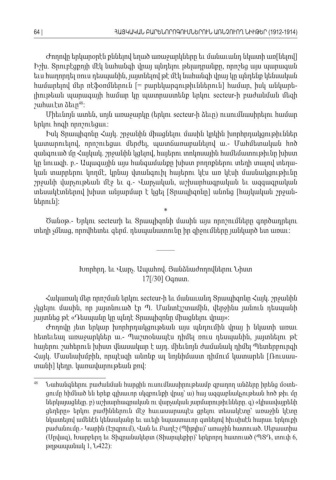 Ժողովը երկարօրէն քննելով եղած առաջարկները եւ մանաւանդ նկատի առ նելով [] Իշխ Տրուբէցքոյի մէկ նահանգի վրայ պնդելու թելադրանքը որոշեց այս պարագան. , եւս հաղորդել ռուս դեսպանին յայտնելով թէ մէկ նահանգի վրայ կը պնդենք կենսական , համարելով մեր ռէֆօռմներուն [= բարեկարգութիւններուն համար իսկ անկարե] , -լիութեան պարագայի համար կը պատրաստենք երկու secteur- ի բաժանման մեզի շահաւէտ ձեւը 48: Միեւնոյն ատեն սոյն առաջարկը երկու , ( secteur- ի ձեւը ուսումնասիրելու համար) երկու հոգի որոշուեցաւ : Իսկ Տրապիզոնը Հայկ շրջանին միացնելու մասին կրկին խորհրդակցութիւններ . կատարուելով որոշուեցաւ մերժել պատճառաբանելով ա, , .- Մահմետական հոծ զանգուած մը Հայկակ շրջանին կցելով հայերու տոկոսային համեմատութիւնը խիստ . , կը նուազի բ Ապագային այս հանգամանքը խիստ բողոքներու տեղի տալով տեղա . .- -կան տարրերու կողմէ կրնայ վտանգուիլ հայերու կէս առ կէսի մասնակցութիւնը , շրջանի վարչութեան մէջ եւ գ Վարչական աշխարհագրական եւ ազգագրական .- , տեսակէտներով խիստ անյարմար է կցել Տրապիզոնը անոնց հայկական շրջան [] [ -ներուն]: * Ծանօթ Երկու.- secteur ի եւ Տրապիզոնի մասին այս որոշումները գործադրելու տեղի չմնաց որովհետեւ գերմ դեսպանատունը իր զիջումները յանկարծ ետ առաւ , . : ––––– Խորհրդ եւ Վարչ Ապահով Յանձնաժողովներու Նիստ. . . 17[/30] Օգոստ. Հակառակ մեր որոշման երկու secteur- ի եւ մանաւանդ Տրապիզոնը Հայկ շրջանին . չկցելու մասին որ յայտնուած էր Պ Մանտէլշտամին վերջինս յանուն դեսպանի , . , յայտնեց թէ Դեսպանը կը պնդէ Տրապիզոնը միացնելու վրայ « »: Ժողովը յետ երկար խորհրդակցութեան այս պնդումին վրայ ի նկատի առաւ հետեւեալ առաջարկներ ա Պաշտօնապէս դիմել ռուս դեսպանին յայտնելու թէ .- , հայերու շահերուն խիստ վնասակար է այդ միեւնոյն ժամանակ դիմել Պետերբուրգի . Հայկ Մասնախմբին որպէսզի անոնք ալ նոյնիմաստ դիմում կատարեն Ռուսաս. , [ -տանի կեդր կառավարութեան քով] . : 48 Նահանգներու բաժանման հարցին ուսումնասիրութեամբ զբաղող անձերը իրենց մօտե -ցումը հիմնած են երեք գլխաւոր սկզբունքի վրայ՝ ա հայ ազգաբնակչութեան հոծ թիւ մը ) ներկայացնելը բ աշխարհագրական ու վարչական յարմարութիւնները գ կիսավայրենի. ) . ) « ցեղերը երկու բաժիններուն մէջ հաւասարապէս ցրելու տեսակէտը՝ առաջին կէտը» նկատելով ամենէն կենսականը եւ աւելի նպաստաւոր գտնելով հիւսիսէն հարաւ երկուքի բաժանումը Կարին Էրզրում Վան եւ Բաղէշ Պիթլիս ՝ առաջին հատուած Սեբաստիա.- (), () . (Սըվազ Խարբերդ եւ Տիգրանակերտ Տիարպեքիր ՝ երկրորդ հատուած ՊՏԴ տուփ), () (, 6, թղթապանակ 1, 422):Ն64 |ՀԱՅԿԱԿԱՆ ԲԱՐԵՆՈՐՈԳՈՒՄՆԵՐՈՒՆ ԱՌՆՉՈՒՈՂ ՆԻՒԹԵՐ (1912-1914)