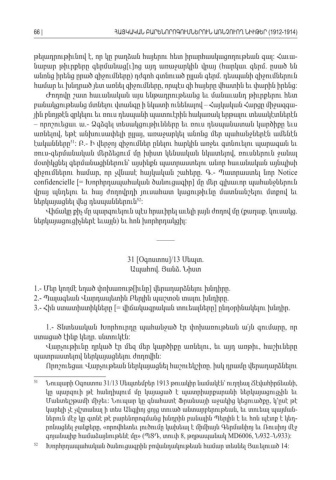թելադրութիւնով է որ կը բաղձան հայերու հետ իրարհասկացողութեան գալ Հաւա , : -նաբար թիւրքերը գերմանաց ւ ոց այդ առաջարկին վրայ հարկաւ գերմ ըսած են [ ] ( . անոնց իրենց ըրած զիջումները դժգոհ գտնուած ըլլան գերմ դեսպանի զիջումներուն ) . համար եւ խնդրած յետ առնել զիջումները որպէս զի հայերը վհատին եւ փարին իրենց , : Ժողովը շատ հաւանական այս ենթադրութեանց եւ մանաւանդ թիւրքերու հետ բանակցութեանց մտնելու վտանգը ի նկատի ունենալով Հայկական Հարցը միջազգա – -յին բնոյթէն զրկելու եւ ռուս դեսպանի պատուէրին հակառակ երթալու տեսակէտներէն – որոշուեցաւ ա Ձգձգել տեսակցութիւնները եւ ռուս դեսպանատան կարծիքը եւս .- առնելով եթէ անխուսափելի ըլլայ առաջարկել անոնց մեր պահանջներէն ամենէն, , էականները51: .- Բ Ի վերջոյ զիջումներ ընելու հարկին առջեւ գտնուելու պարագան եւ ռուս գերմանական մերձեցում մը խիստ կենսական նկատելով ռուսներուն ջանալ- , մօտիկցնել գերմանացիներուն՝ այսինքն պատրաստելու անոր հաւանական այնպիսի զիջումներու համար որ չվնասէ հայկական շահերը Գ Պատրաստել նոր , . .- Notice confidencielle [= Խորհրդապահական ծանուցագիր մը մեր գլխաւոր պահանջներուն ] վրայ պնդելու եւ հայ ժողովրդի յուսահատ կացութիւնը մատնանշելու մտքով եւ ներկայացնել վեց դեսպաններուն 52: Վիճակը քիչ մը պարզուելուն պէս հրաւիրել աւելի լայն ժողով մը քաղաք կուսակց (. . ներկայացուցիչներէ եւայլն եւ հոն խորհրդակցիլ ) : ––––– 31 [Օգոստոս]/13 Սեպտ. Ապահով Յանձ Նիստ. . 1.- Մեր կողմէ եղած փոխառութ իւնը վերադարձնելու խնդիրը [] . 2.- Պալագեան Վարդապետին Բերլին պաշտօն տալու խնդիրը . 3.- Հին ստատիստիկները [= վիճակագրական տուեալները ընդօրինակելու խնդիր ] . 1.- Տնտեսական Խորհուրդը պահանջած էր փոխառութեան ա՛յն գումարը որ , ստացած էինք կեդր սնտուկէն . : Վարչութիւնը ղրկած էր մեզ մեր կարծիքը առնելու եւ այդ առթիւ հաշիւները , , պատրաստելով ներկայացնելու ժողովին : Որոշուեցաւ Վարչութեան ներկայացնել հաշուեկշիռը իսկ դրամը վերադարձնելու . 51 Նուպարի Օգոստոս 31/13 Սեպտեմբեր 1913 թուակիր նամակէն՝ ուղղեալ Ճէվահիրճեանի , կը պարզուի թէ հանդիպում մը կայացած է պատրիարքարանի ներկայացուցչին եւ Մանտելշթամի միջեւ Նուպար կը գնահատէ Ֆրանսայի աջակից կեցուածքը կ՚ըսէ թէ : , կարելի չէ չվշտանալ ի տես Անգլիոյ ցոյց տուած անտարբերութեան եւ տուեալ պայման , -ներուն մէջ կը գտնէ թէ բարենորոգմանց խնդրին բանալին Պերլին է եւ հոն պէտք է կեդ -րոնացնել ջանքերը որովհետեւ լուծումը կախեալ է միմիայն Գերմանիոյ եւ Ռուսիոյ մէջ , « գոյանալիք համաձայնութենէ մը ՊՏԴ տուփ » (, 8, թղթապանակ MD6006, 932– 933):ՆՆ52 Խորհրդապահական ծանուցագրին բովանդակութեան համար տեսնել Յաւելուած 14:66 |ՀԱՅԿԱԿԱՆ ԲԱՐԵՆՈՐՈԳՈՒՄՆԵՐՈՒՆ ԱՌՆՉՈՒՈՂ ՆԻՒԹԵՐ (1912-1914)