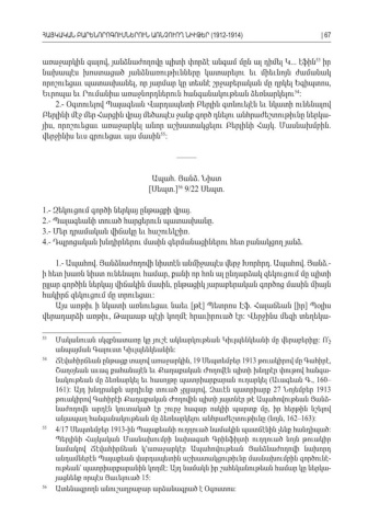 առաջարկին գալով յանձնաժողովը պիտի փորձէ անգամ մըն ալ դիմել Կ էֆին իր , ... 53 նախապէս խոստացած յանձնառութիւնները կատարելու եւ միեւնոյն ժամանակ որոշուեցաւ պատասխանել որ յարմար կը տեսնէ շրջաբերական մը ղրկել Եգիպտոս , , Եւրոպա եւ Րումանիա առաջնորդներուն հանգանակութեան ձեռնարկելու 54: 2.- Օգտուելով Պալագեան Վարդապետի Բերլին գտնուելէն եւ նկատի ունենալով Բերլինի մէջ մեր Հարցին վրայ մեծապէս ջանք գործ դնելու անհրաժեշտութիւնը ներկա -յիս որոշուեցաւ առաջարկել անոր աշխատակցելու Բերլինի Հայկ Մասնախմբին, . . վերջինիս եւս գրուեցաւ այս մասին 55: ––––– Ապահ Յանձ Նիստ. . [Սեպտ.] 9/22 56Սեպտ. 1.- Զեկուցում գործի ներկայ ընթացքի վրայ . 2.- Պալագեանի տուած հարցերուն պատասխանը . 3.- Մեր դրամական վիճակը եւ հաշուեկշիռ . 4.- Դպրոցական խնդիրներու մասին գերմանացիներու հետ բանակցող յանձ . 1.- Ապահով Յանձնաժողովի նիստէն անմիջապէս վերջ Խորհրդ Ապահով Յանձ. . . .-ի հետ խառն նիստ ունենալու համար քանի որ հոն ալ ընդարձակ զեկուցում մը պիտի , ըլլար գործին ներկայ վիճակին մասին ընթացիկ յարաբերական գործոց մասին միայն , հակիրճ զեկուցում մը տրուեցաւ : Այս առթիւ ի նկատի առնուեցաւ նաեւ թէ Պետրոս Էֆ Հալաճեան իր Պօլիս [ ] . [ ] վերադարձի առթիւ Թալաաթ պէյի կողմէ հրաւիրուած էր Վերջինս մեզի տեղեկա , : -53 Մականուան սկզբնատառը կը յուշէ ակնարկութեան Կիւլպենկեանի մը վերաբերիլը Ո՛չ : անպայման Գալուստ Կիւլպենկեանին :54 Ճէվահիրճեան ընթացք տալով առաջարկին , 19 Սեպտեմբեր 1913 թուակիրով մը Գահիրէ , Շաղօյեան աւագ քահանայէն եւ Քաղաքական Ժողովէն պիտի խնդրէր փութով հանգա -նակութեան մը ձեռնարկել եւ հասոյթը պատրիարքարան ուղարկել Աւագեան Գ ( ., 160–161): Այդ խնդրանքն արդիւնք տուած չըլլալով Զաւէն պատրիարք , 27 Նոյեմբեր 1913 թուակիրով Գահիրէի Քաղաքական Ժողովին պիտի յայտնէր թէ Ապահովութեան Յանձ -նաժողովն արդէն կուտակած էր շուրջ հազար ոսկիի պարտք մը իր հերթին նշելով , անյապաղ հանգանակութեան մը ձեռնարկելու անհրաժեշտութիւնը նոյն (, 162–163):55 4/17 Սեպտեմբեր 1913- ին Պալաքեանի ուղղուած նամակին պատճէնին չենք հանդիպած : Պերլինի Հայկական Մասնախումբի նախագահ Գրինֆիլտի ուղղուած նոյն թուակիր նամակով Ճէվահիրճեան կ՚առաջարկէր Ապահովութեան Յանձնաժողովի նախորդ անդամներէն Պալաքեան վարդապետին աշխատակցութիւնը մասնախումբին գործունէ -ութեան՝ պատրիարքարանին կողմէ Այդ նամակն իր շահեկանութեան համար կը ներկա : -յացնենք որպէս Յաւելուած 15:56 Ատենագրողն անուշադրաբար արձանագրած է Օգոստոս :ՀԱՅԿԱԿԱՆ ԲԱՐԵՆՈՐՈԳՈՒՄՆԵՐՈՒՆ ԱՌՆՉՈՒՈՂ ՆԻՒԹԵՐ (1912-1914)| 67