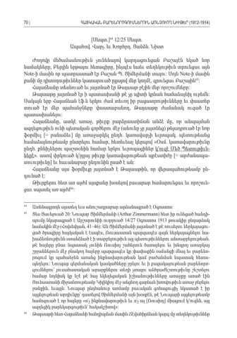 [Սեպտ.] 12/25 64Սեպտ. Ապահով Վարչ եւ Խորհրդ Յանձն Նիստ. . . . Ժողովը մեծամասնութիւն չունենալով կարդացուեցան Բաշայէն եկած նոր նամակները Բերլին երթալու հեռագիրը ինչպէս նաեւ տեղեկութիւն տրուեցաւ այն, , Note- ի մասին որ պատրաստած էր Բաշան Պ Ցիմերմանի տալու Սոյն . : Note- ի մասին քանի մը դիտողութիւններ կատարուած ըլլալով մեր կողմէ գրուեցաւ Բաշային , 65: Հալաճեանը տեսնուած եւ յայտնած էր Թալաաթ բէյին մեր որոշումները : Թալաաթը յայտնած էր ի պատասխանի թէ չը պիտի կրնան համաձայնիլ ուրեմն : Սակայն երբ Հալաճեան էֆ ն երկու ժամ տեւող իր բացատրութիւնները եւ փաստեր . տուած էր մեր պահանջները փաստաբանող Թալաաթը ժամանակ ուզած էր , պատասխանելու: Հալաճեանը ատկէ առաջ թիւրք բարձրաստիճան անձէ մը որ անպայման, , , ազդեցութիւն ունի պետական գործերու մէջ անունը չը յայտնեց թելադրուած էր նոր ( ) ֆօրմիւլ [= բանաձեւ մը առաջարկել ընդհ կառավարչի եւրոպակ պետութեանց] . . համաձայնութեամբ ընտրելու համար հետեւեալ կերպով Օսմ կառավարութիւնը , «. ընդհ քննիչներու պաշտօնին համար երկու եւրոպացիներ կ՚ուզէ Մեծ Պետութիւն. -ներէ ասով փրկուած կ՚ըլլայ թիւրք կառավարութեան պրէստիժը». [= արժանապա -տուութիւնը եւ հաւանաբար ընդունին ըսած է ան] : Հալաճեանը այս ֆօրմիւլը յայտնած է Թալաաթին որ վերապահութեամբ ըն , -դունած է : Թիւրքերու հետ առ այժմ այսքանը խօսելով բաւարար համարուեցաւ եւ որոշուե -ցաւ սպասել առ այժմ 66: 64 Ատենագրողն այստեղ եւս անուշադրաբար արձանագրած է Օգոստոս : 65 Տես Յաւելուած 20: Նուպար Ցիմմերմանի (Arthur Zimmermann) հետ իր ունեցած հանդի -պումը նկարագրած է Արշարունիի ուղղուած 14/27 Օգոստոս 1913 թուակիր ընդարձակ նամակին մէջ Հովսեփյան (, 41–46): Ան Ցիմմերմանի յայտնած է թէ ռուսերու ներկայացու -ցած ծրագիրը հայկական է էապէս Ռուսաստան պարզապէս զայն ներկայացնելու նա , -խաձեռնութիւնն ստանձնած է ի տարբերութիւն այլ պետութիւններու անտարբերութեան . թէ հայերը բնաւ նպատակ չունին Ռուսիոյ շահերուն ծառայելու եւ խնդրոյ առարկայ շրջաններուն մէջ բնակող հայերը պարզապէս կը փափաքին օսմանցի մնալ եւ բարենո -րոգում կը պահանջեն առանց ինքնավարութեան կամ բաժանման նպատակ հետա -պնդելու Նուպար գերմանական կասկածները ջրելու եւ ի բացակայութեան բարենորո: -գումներու՝ յուսահատական արարքներու տեղի չտալու անհրաժեշտութիւնը շեշտելու համար նոյնիսկ կը նշէ թէ հայ եկեղեցական իշխանութիւնները առաջքը առած էին Յունաստանի միջամտութեամբ Կիլիկիոյ մէջ անցնող գարնան խռովութիւն առաջ բերելու ջանքին եւայլն Նուպար ընդհանուր առմամբ բաւական գոհացուցիչ նկատած է իր, : այցելութեան արդիւնքը՝ դատելով Ցիմմերմանի այն խօսքէն թէ Նուպարի այցելութեամբ , համոզուած է որ հայերը ո՛չ ինքնավարութիւն եւ ո՛չ ալ Ռուսիոյ միացում կ՚ուզեն այլ « [] , ազդեցիկ բարեկարգութիւն՝ հակակշիռով »:66 Թալաաթի հետ Հալաճեանի հանդիպման մասին Ճէվահիրճեան կարգ մը տեղեկութիւններ 70 |ՀԱՅԿԱԿԱՆ ԲԱՐԵՆՈՐՈԳՈՒՄՆԵՐՈՒՆ ԱՌՆՉՈՒՈՂ ՆԻՒԹԵՐ (1912-1914)