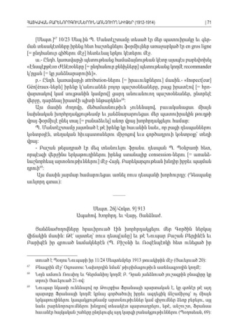 [Սեպտ.] 10/23 67Սեպ ին Պ Մանտէլշտամը տեսած էր մեր պատուիրակը եւ գեր. . -ման տեսակէտները իրենց հետ հաշտեցնելու ֆօրմիւլներ առաջարկած էր en gros ligne [= ընդհանուր գիծերու մէջ հետեւեալ երկու կէտերու մէջ ] . ա Ընդհ կառավարչի պետութեանց համաձայնութեան կէտը այսպէս բարեփոխել.- . «Էնսպէքթէօռ Ժէնէռօները [= ընդհանուր քննիչները պետութեանց կողմէ ] recommander կ՚ըլլան [= կը յանձնարարուին]». բ Ընդհ կառավարչի.- . attribution-ներու [= իրաւունքներու մասին] .- «Inspect[eur] Gén[éraux-ներն իրենք կ՚անուանեն բոլոր պաշտօնեաները բայց իրատէով] , [= հրո -վարտակով կամ սուլթանին կամքով ցարդ անուանուող պաշտօնեաներ ընտրելէ ] , վերջը դարձեալ իրատէի պիտի ենթարկեն, » : 68Այս մասին ժողովը մեծամասնութիւն չունենալով բաւականացաւ միայն , , նախնական խորհրդակցութեամբ եւ յանձնարարուեցաւ մեր պատուիրակին թուղթի վրայ ֆօրմիւլէ ընել տալ [= բանաձեւել անոր վրայ խորհրդակցելու համար] : Պ Մանտէլշտամը յայտնած է թէ իրենք կը հաւանին նաեւ որ բացի դեսպաններու. , կօնտրօլէն տեղական հիւպատոսներու միջոցով եւս գործադրուի կօնտրօլը՝ տեղի, վրայ: - Բաշան թելադրած էր մեզ տեսնուելու ֆրանս դեսպան Պ Պօնբառի հետ . . , որպէսզի վերջինս երկաթուղիներու իրենց ստանալիք consession-ներու [= առանձ -նաշնորհեալ արտօնութիւններու մէջ Հայկ Բարեկարգութեան խնդիր իբրեւ պայման ] . դրուի69: Այս մասին յարմար համարուեցաւ առնել ռուս դեսպանի խորհուրդը Դեսպանը : ( աւելորդ գտաւ ): ––––– Սեպտ. 26[/Հոկտ. 9] 913 Ապահով Խորհրդ եւ Վարչ Յանձնաժ. . . . Յանձնաժողովները հրաւիրուած էին խորհրդակցելու մեր Գործին ներկայ վիճակին մասին Թէ՛ այստեղ՝ ռուս դեսպ անը եւ թէ Նուպար Բաշան Բերլինէն եւ : [] Բարիզէն իր գրուած նամակներէն Պ Բիշօնի եւ Ռօզէնպէռկի հետ ունեցած իր ( . տուած է Պօղոս Նուպարի իր 11/24 Սեպտեմբեր 1913 թուակիրին մէջ Յաւելուած ( 20): 67 Բնագրին մէջ՝ Օգոստոս Նախորդին նման՝ թիւրիմացութիւն ատենագրողին կողմէ : :68 Նոյն ամսուն Ռուսիոյ եւ Գերմանիոյ կողմէ Բ Դրան յանձնուած յուշագրին բնագիրը կը . տրուի Յաւելուած 21- :ով69 Նուպար նկատի ունենալով որ Թուրքիա Ֆրանսայի պարտական է կը գտնէր թէ այդ , պարտքը Ֆրանսայի կողմէ կրնայ գործածուիլ իբրեւ ազդեցիկ ճնշամիջոց՝ ոչ միայն երկաթուղիներու կապակցութեամբ արտօնութիւններ կամ զիջումներ ձեռք բերելու այլ , նաեւ բարենորոգումներու խնդրով տեսակէտ պարտադրելու եթէ անշուշտ Ֆրանսա , , , հաւանէր հայկական շահերը ընդելուզել այդ կարգի բանակցութիւններու Պօղոսեան (, 69): ՀԱՅԿԱԿԱՆ ԲԱՐԵՆՈՐՈԳՈՒՄՆԵՐՈՒՆ ԱՌՆՉՈՒՈՂ ՆԻՒԹԵՐ (1912-1914)| 71