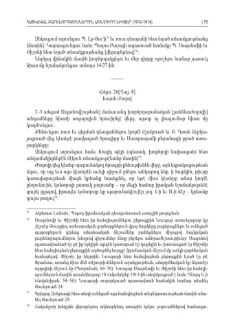 Զեկուցում տրուեցաւ Պ Լը Տու՚ի եւ ռուս դեսպանի հետ եղած տեսակցութեանց . -75 [մասին Կարդացուեցաւ նաեւ Պօղոս Բաշայի սպասուած նամակը Պ Սազօնօֆի եւ]: . Բիշօնի հետ եղած տեսակցութեանց վերաբերեալ [] : 76Ներկայ վիճակին մասին խորհրդակցելու եւ մեր դիրքը որոշելու համար յատուկ նիստ մը նշանակուեցաւ ամսոյս 14/27- : ին ––––– Հոկտ. 26[/Նոյ. 8] Խառն Ժողով 2–3 անգամ Ապահով ութեան մանաւանդ խորհրդարանական յանձնաժողովի [] [] անդամները նիստի ապարդիւն հրաւիրելէ վերջ այսօր ոչ լիագումար նիստ մը , կազմուեցաւ: Քննուեցաւ ռուս եւ գերման դեսպաններու կողմէ մշակուած եւ Բ Դռան ներկա . -յացուած վեց կէտերէ բաղկացած ծրագիրը եւ Սատրազամի բերանացի ըրած առա -ջարկները: Զեկուցում տրուեցաւ նաեւ Խալիլ պէյի պետակ խորհրդի նախագահ հետ (. ) անդամակիցներէն մէկուն տեսակցութ եանը մասին [ ] : 77Ժողովը վեց կէտեր պարունակող ծրագրի քննութիւնէն վերջ այն եզրակացութեան , եկաւ որ այլ եւս այս կէտերէն աւելի զիջում ընելու անկարող ենք ի հարկին թիւրք, . , կառավարութեան միայն կրնանք հասկցնել որ եթէ միւս կէտերը անոր կողմէ , ընդունուին կօնտրօլի յատուկ յօդուածը, – որ մեզի համար իրական նշանակութենէ զուրկ ըլլալով իրապէս կօնտրօլը կը պարունակ ու էր յօդ , [ ] . I- II- ի եւի մէջ – կրնանք դուրս թողուլ 78: 75 Alphonse Ledoulx, Պոլսոյ ֆրանսական դեսպանատան առաջին թարգման :76 Սազոնովի եւ Փիշոնի հետ իր հանդիպումներու ընթացքին Նուպար առաւելաբար կը շեշտէր Թուրքիոյ առեւտրական գործարքներուն վրայ հարկերը բարձրացնելու եւ ունեցած պարտքերուն դիմաց տնտեսական ճնշումներ բանեցնելու միջոցով հայկական բարենորոգումներու խնդրով զիջումներ ձեռք բերելու անհրաժեշտութիւնը Սազոնով : պատասխանած էր թէ իր երկիրն արդէն կատարած էր կարելին եւ խոստացած էր Փիշոնի հետ հանդիպման ընթացքին արծարծել հարցը՝ ֆրանսական ճնշում մը աւելի գործնական համարելով Փիշոն իր հերթին Նուպարի հետ հանդիպման ընթացքին նշած էր թէ: , , Ֆրանսա առանց միւս մեծ տէրութիւններուն աջակցութեան անգործնական կը նկատէր, , այդպիսի ճնշում մը Պօղոսեան (, 69–70): Նուպար Սազոնովի եւ Փիշոնի հետ իր հանդի -պումներուն մասին առանձնաբար 18 Հոկտեմբեր 1913- ին տեղեկագրած է նաեւ Գէորգ Ե ի . (Հովսեփյան, 54–56): Նուպարի ուղարկուած պատասխան նամակին համար տեսնել Յաւելուած 24:77 Գրիգոր Զօհրապի հետ տեղի ունեցած այս հանդիպման տեղեկատուութեան մասին տես -նել Յաւելուած 25: 78 Հակակշռի խնդրին վերաբերող ակնարկեալ առաջին երկու յօդուածներով համապա -ՀԱՅԿԱԿԱՆ ԲԱՐԵՆՈՐՈԳՈՒՄՆԵՐՈՒՆ ԱՌՆՉՈՒՈՂ ՆԻՒԹԵՐ (1912-1914)| 75