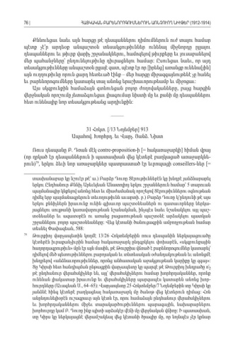 Քննուեցաւ նաեւ այն հարցը թէ դեսպաններու դիմումներուն ուժ տալու համար պէտք չէ՞ր արդեօք անպաշտօն տեսակցութիւններ ունենալ միջնորդը ըլլալու դեսպաններու եւ թիւրք վարիչ շրջանակներու համոզելով թիւրքերը եւ լուսաբանելով , մեր պահանջները՝ ընդունելութիւնը դիւրացնելու համար Ըսուեցաւ նաեւ որ այդ : , տեսակցութիւնները անպաշտօն ըլլալէ զատ պէտք էր որ իրենց առանցք ունենա յին , [] [] այն ուղղութիւնը որուն ցարդ հետեւած էինք մեր հարցը միջազգայնութենէ չը հանել – եւ բարենորոգումները կատարել տալ անոնց երաշխաւորութեամբ եւ միջոցաւ : Այս սկզբունքին համաձայն գտնուեցան բոլոր ժողովականները բայց հարցին , վերջնական որոշումը յետաձգուեցաւ լիագումար նիստի մը եւ քանի մը դեսպաններու հետ ունենալիք նոր տեսակցութեանց արդիւնքին : ––––– 31 Հոկտ. [/13 Նոյեմբեր] 913 Ապահով Խորհրդ եւ Վարչ Յանձ Նիստ. . . . Ռուս դեսպանը Բ Դռան մէկ . contre-proposition- [= իհակառաջարկի հիման վրայ] ( որ ղրկած էր դեսպաններուն ի պատասխան վեց կէտերէ բաղկացած առաջարկնե -րուն) , 79երկու ձեւի նոր առաջարկներ պատրաստած էր եւրոպացի conseillers-ներ [= տասխանաբար կը նշուէր թէ՝ ա Բարձր Դուռը Տէրութիւններէն կը խնդրէ յանձնարարել .) երկու Ընդհանուր Քննիչ Արեւելեան Անատոլիոյ երկու շրջաններուն համար՝ տարուան 5 պայմանագիր կնքելով անոնց հետ եւ միաժամանակ որոշելով Տէրութիւններու օգնութեան դիմել երբ պայմանագրերուն տեւողութիւնն աւարտի բ Բարձր Դուռը կ՚ընդունի թէ այս . .) երկու քննիչներն իրաւունք ունին գլխաւոր պաշտօնեաներն ու դատաւորները ներկա -յացնելու սուլթանի կառավարութեան նշանակման ինչպէս նաեւ նշանակելու այլ պաշ , -տօնեաներ եւ ազատօրէն ու առանց բացառութեան պաշտօնէ արձակելու պատկան շրջաններու բոլոր պաշտօնեաները Վեց կէտանի ծանուցագրին ամբողջութեան համար : տեսնել Փափազեան , 588:79 Թուրքիոյ վարչապետին կողմէ 13/26 Հոկտեմբերին ռուս դեսպանին ներկայացուածը կէտերէն իւրաքանչիւրին համար հակառաջարկ ընդգրկելու փոխարէն սկզբունքային , « հաղորդագրութիւն մըն էր այն մասին թէ Թուրքիա վճռած է բարենորոգումներ կատարել՝» , դիմելով մեծ պետութիւններու բարոյական եւ տնտեսական օժանդակութեան եւ անոնցմէ խնդրելով անձնաւորութիւններ որոնց անհատական աջակցութեան կարիքը կը զգայ «, »: Տը Կիրսի հետ հանդիպման ընթացքին վարչապետը կը պարզէ թէ Թուրքիոյ խնդրածը ո՛չ թէ ընդհանուր վերահսկիչներ են այլ՝ վերահսկիչներու համար խորհրդականներ որոնք , , ունենան լիակատար իրաւունք եւ վերահսկիչները պարզապէս կատարեն անոնց խոր -հուրդները Աւագեան Ս ( ., 64–65): Վարչապետը 25 Հոկտեմբեր Նոյեմբերին տը Կիրսի կը/7 յանձնէ հինգ կէտերէ բաղկացեալ հակառաջարկ մը ծանօթ վեց կէտերուն դիմաց Հոն : անընդունելիօրէն ուշագրաւը այն կէտն էր որու համաձայն ընդհանուր վերահսկիչներու , եւ խորհրդականներու միջեւ տարակարծութիւններու պարագային նախարարներու , խորհուրդը կամ Բ Դուռը ինք պիտի արձակէր վէճի մը վերջնական վճիռը Ի պատասխան . : , տը Կիրս կը ներկայացնէ վերամշակեալ վեց կէտանի ծրագիր մը որ նոյնպէս չէր կրնար , 76 |ՀԱՅԿԱԿԱՆ ԲԱՐԵՆՈՐՈԳՈՒՄՆԵՐՈՒՆ ԱՌՆՉՈՒՈՂ ՆԻՒԹԵՐ (1912-1914)