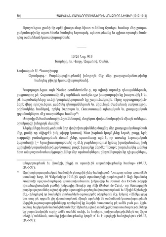 Որոշուեցաւ քանի մը օրէն լիագումար նիստ ունենալ ճշտելու համար մեր քաղա -քականութիւնը այսուհետեւ հանդէպ եւրոպակ պետութեանց եւ գլխաւորապէս հան . -դէպ օսմանեան կառավարութեան : ––––– 13/26 Նոյ. 913 Խորհրդ եւ Վարչ Ապահով Յանձ. . . . Նախագահ Ս Պատրիարք . Օրակարգ.- Բարեկարգ ութեան խնդրոյն մէջ մեր քաղաքականութիւնը[] հանդէպ թիւրք կառավ արութեան []. Կարդացուեցաւ այն Notice confidentielle- , ը որ պիտի տրուէր դեսպաններուն , բացատրող թէ Հայաստանի մէջ այժմեան առերեւոյթ խաղաղութիւնը խաբուսիկ է եւ թէ հալածանքները աւելի կազմակերպուած կը շարունակուին Որոշ սրբագրութիւն : -ներէ վերջ որոշուեցաւ յանձնել դեսպաններուն եւ միեւնոյն ժամանակ սակաւաթիւ օրինակներ հանելով ղրկել Եւրոպա եւ Ռուսաստան պետական եւ քաղաքական , շրջանակներու մէջ տարածելու համար 86: Ժողովը մեծամասնութիւն չունենալով մտքերու փոխանակութիւն միայն ունեցաւ , օրակարգի խնդրոյն մասին : Ներկաները հարկ չտեսան նոր փոփոխութիւններ մտցնել մեր քաղաքականութեան մէջ քանի որ սկիզբէն իսկ թիւրք կառավ հետ խզման կողմ չենք եղած բայց եթէ, . , , ուղղակի բանակցութեան մտած չենք պատճառը այն է որ առանց եւրոպական , , կարանտիի [= Երաշխաւորութեան ոչ մէկ բարենորոգում կրնայ իրականանալ իսկ] . այդպիսի կարանտին թիւրք կառավ բացէ ի բաց կը մերժէ Պէտք է շարունակել անոնց . : հետ անպաշտօն տեսակցութիւններ մեր պահանջներու ընդունելութիւնը դիւրացնելու , անդորրութեան եւ կեանքի ինչքի ու պատիւին ապահովութեանը համար , » (ՓՆՄ, ԶՆՀՀՄ):86 Այս խորհրդապահական նամակին բնագրին չենք հանդիպած Նուպար անոր պատճէնն : ստանալէ ետք , 10 Դեկտեմբեր 1913- ին զայն տրամադրելի դարձուցած է Ազի Ֆրանսէզ Կոմիտէի պաշտօնաթերթի պատասխանատու խմբագիր եւ Journal des Débats թերթի դիւանագիտական բաժնի խմբագիր Ռոպէր տը Քէի (Robert de Caix),- որ հետագային բարձր պաշտօններ պիտի վարէր արտաքին գործոց նախարարութեան եւ Միջին Արեւելքի մէջ խնդրելով որ նամակին տուեալներն օգտագործէ թերթերուն մէջ նշելով Անիկա ցոյց,- , . « կու տայ թէ որքա՛ն քիչ վստահութեան միայն արժանի են օսմանեան կառավարութեան վերջին յայտարարութիւնները որոնցմով կը ձգտին հաստատել թէ ամէն բան լաւ կ՚ըն -թանայ հայկական նահանգներուն մէջ Այնտեղ պիտի տեսնէք թէ հարստահարութիւնները : կը շարունակուին ուրիշ ամէն ատենէ աւելի եւ հողերու յափշտակութիւններն ալ միշտ , տեղի կ՚ունենան առանց իշխանութեանց կողմէ ո՛ եւ է արգելքի հանդիպելու , » (ՓՆՄ, ԶՆՀՀՄ): 80 |ՀԱՅԿԱԿԱՆ ԲԱՐԵՆՈՐՈԳՈՒՄՆԵՐՈՒՆ ԱՌՆՉՈՒՈՂ ՆԻՒԹԵՐ (1912-1914)