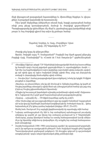 մեզի վերագրուած քաղաքական նպատակները եւ միտումները հերքելու եւ դիւրա -ցնելու եւրոպական կարանտիի մը հաստատումը : Միւս կողմէ ներկաները անհրաժեշտ տեսան հայկ հարցի յաջողութեան համար . տեղի չտալ թիւրք կառավարութեան մամուլի եւ ժողովրդի գրգռումներուն , 87: Պատրիարքարանը իր դիմումներու մէջ մեղմ եւ շրջահայեաց ըլլայ կասկածների տեղի չտալու եւ հայ ժողովրդի գլխուն նոր աղէտ մը չբանալու համար : ––––– Ապահով Խորհրդ եւ Վարչ Ժողովներու Նիստ. . . Նոյեմբ. 25[/Դեկտեմբեր 8], 913 88 Ժողովը լսեց կարգ մը զեկուցումներ : Ֆրանս ծովային սպայ Պ Խանզատեան Բարիզէն նոր եկած ըլլալով զեկուցեց. . 89 Բարիզի Հայկ Մասնախմբի եւ . 90 «Comité de l’Asie française- » ի91գործունէութեան 87 «Թասֆիրը Էֆքեար թերթի » 7/20 Դեկտեմբերի խմբագրականին հետեւեալ հատուածները կը ծառայեն որպէս ճաշակ թրքական գրգռութիւններու եւ սպառնալիքներու մասին : «... Եթէ մեր Հայ հայրենակիցներուն տգէտ վարիչները շարունակեն պնդել տակաւին արդիւն , -քը այն պիտի ըլլայ որ այլեւս հայկական խնդիր չպիտի մնայ բայց այս յեղաշրջումը . սոսկալի եւ փոթորկալից հետեւանքներ պիտի ունենայ : «... Ռուսիա ինչո՞ւ համար քաղաքացիական իրաւունքներով չ՚օժտեր իր երկրին 30 միլիոն թուրքերն ու իսլամները : «Ֆրանսա որ անասուններու տեղ կը դնէ Թունուզի եւ Ալճերիոյ իսլամները կը կարծէ թէ, , Սուրիոյ իսլամները անտարբե՞ր պիտի մնան այն շահագրգռութեան համար զոր ցոյց տալ կ՚երեւայ Սուրիոյ քրիստոնեաներուն նկատմամբ : «Անգլիա կը հաւատայ թէ իսլամական աշխարհը յաւիտենապէս պիտի տանի՞ Հնդկաստա -նի եւ Եգիպտոսի մէջ ի գործ դրած հարստահարութեան քաղաքականութիւնը : «Արդեօք ... աշխարհի մէջ ... 350 միլիոն իսլամները արժէք մը չունի՞ն : «Ահա՛ հետեւանքը այն դաւադրութիւններուն զորս կը սարքեն Օսմանեան Կայսրութեան դէմ որ իր վրայ կը մարմնացնէ իսլամական խալիֆայութիւնը Խոհական մարդ մը : ... կրնայ նախատեսել թէ ի՞նչ կրնայ դառնալ հայկական խնդիրը ՓՆՄ ԶՆՀՀՄ » (, ): Տեսնել նաեւ Յաւելուած 26- ը ազդեցիկ իթթիհատականի մը սպառնալից ոճին համար :88 Նախորդ ատենագրութեան մէջ հին եւ նոր տոմարներով արձանագրուած թուականը աներկբայ կը դարձնէ թէ այս նիստը նոր տոմարով գումարուած էր 8 Դեկտեմբերին: Հետեւաբար յաջորդ նիստերուն համար եւս առանց համապատասխան նշումի անհրա, -ժեշտ կը նկատենք անկիւնաւոր փակագծերու մէջ աւելցնել նոր տոմարի համապատաս -խան ամսաթիւերը :89 Զատիկ Խանզատեան (1886–1980) առաւելաբար յայտնի է իր պատրաստած քարտէզնե -րով եւ իր արժէքաւոր աջակցութիւնն ընծայած է նաեւ հայկական հարցին գծով Ազգային Պատուիրակութեան գործադրած ջանքերուն Ան Թուրքիա ղրկուած էր պաշտօնական : առաքելութեամբ՝ որպէս անդամ ֆրանսական քննիչ յանձնախումբի : ՀԱՅԿԱԿԱՆ ԲԱՐԵՆՈՐՈԳՈՒՄՆԵՐՈՒՆ ԱՌՆՉՈՒՈՂ ՆԻՒԹԵՐ (1912-1914)| 81