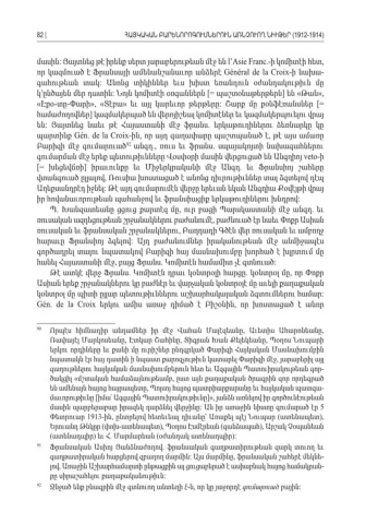 մասին Յայտնեց թէ իրենք սերտ յարաբերութեան մէջ են: l’Asie Franc.- ի կոմիտէի հետ , որ կազմուած է Ֆրանսայի ամենանշանաւոր անձերէ Général de la Croix- ի նախա -գահութեան տակ Անոնց տիկիններ եւս խիստ եռանդուն օժանդակութիւն մը : կ՚ընծայեն մեր դատին Նոյն կոմիտէի օռգաններն : [= պաշտօնաթերթերն են Թան] «», «Էքօ տը Փարի--», «Տէբա եւ այլ կարեւոր թերթերը Շարք մը քօնֆէռանսներ» : [= համաժողովներ կազմակերպած են վերոյիշեալ կոմիտէներ եւ կազմակերպուելու վրայ] են Յայտնեց նաեւ թէ Հայաստանի մէջ ֆրանս երկաթուղիներու ձեռնարկը կը: . պարտինք Gén. de la Croix- , ին որ այդ գաղափարը պաշտպանած է թէ այս ամառը , Բարիզի մէջ գումարուած անգղ ռուս եւ ֆրանս սպայակոյտի նախագահներու 92 ., . գումարման մէջ երեք պետութիւնները Վօսփօրի մասին վերցուցած են Անգղիոյ veto- ի[= խեցեվճռի իրաւունքը եւ Միջերկրականի մէջ Անգղ եւ Ֆրանսիոյ շահերը] . վտանգուած ըլլալով Ռուսիա խոստացած է անոնց դիւրութիւններ տալ ձգտելով դէպ , Աղեքսանդրէդ իջնել Թէ այդ գումարումէն վերջը երեւան եկան Անգղիա Քօվէյթի վրայ : իր հովանաւորութեան պահանջով եւ ֆրանսիացիք երկաթուղիներու խնդրով : Պ Խանզատեանը ցցուց քարտէզ մը ուր բացի Պարսկաստանի մէջ անգղ եւ. , . ռուսական ազդեցութեան շրջանակներու բաժանումէ բաժնուած էր նաեւ Փոքր Ասիան , ռուսական եւ ֆրանսական շրջանակներու Բաղդադի Գծէն վեր ռուսական եւ ամբողջ , հարաւը Ֆրանսիոյ ձգելով Այդ բաժանումներ իրականութեան մէջ անմիջապէս : գործադրել տալու նպատակով Բարիզի հայ մասնախումբը խորհած է խլրտում մը հանել Հայաստանի մէջ բայց Ֆրանս Կոմիտէն համամիտ չէ գտնուած , . : Թէ ատկէ վերջ Ֆրանս Կոմիտէն դրաւ կօնտրօլի հարցը կօնտրօլ մը որ Փոքր . . , Ասիան երեք շրջանակներու կը բաժնէր եւ վարչական կօնտրօլէ մը աւելի քաղաքական կօնտրօլ մը պիտի ըլլար պետութիւններու աշխարհակալական ձգտումներու համար : Gén. de la Croix երկու ամիս առաջ դիմած է Բիշօնին որ խոստացած է անոր , 90 Որպէս հիմնադիր անդամներ իր մէջ Վահան Մալէզեանը Աւետիս Ահարոնեանը , , Ռափայէլ Մարկոսեանը Էտկար Շահինը Տիգրան Խան Քելեկեանը Պօղոս Նուպարի , , , երկու որդիները եւ քանի մը ուրիշներ ընդգրկած Փարիզի Հայկական Մասնախումբին նպատակն էր հայ դատին ի նպաստ քարոզչութիւն կատարել Փարիզի մէջ յարաբերիլ այլ , գաղութներու հայկական մասնախումբերուն հետ եւ Ազգային Պատուիրակութեան գոր -ծակցիլ մշտական համաձայնութեամբ ըստ այն քաղաքական ծրագրին զոր որդեգրած « , են ամենայն հայոց հայրապետը Պոլսոյ հայոց պատրիարքարանը եւ հայկական պատգա , -մաւորութիւնը իմա՛ Ազգային Պատուիրակութիւնը [ ]», յանձն առնելով իր գործունէութեան մասին պարբերաբար իրազեկ դարձնել վերջինը Ան իր առաջին նիստը գումարած էր : 5 Փետրուար 1913- , ին ընտրելով հետեւեալ դիւանը՝ Առաքել պէյ Նուպար ատենապետ (), Երուանդ Թնկըր փոխ ատենապետ Պօղոս Էսմէրեան գանձապահ Արշակ Չօպանեան (-), (), (ատենադպիր եւ Հ Մարմարեան օժանդակ ատենադպիր) . ( ): 91 Ֆրանսական Ասիոյ Յանձնաժողով ֆրանսական գաղթատիրութեան զարկ տուող եւ . գաղթատիրական հարցերով զբաղող մարմին Այս մարմինը ֆրանսական շահերէ մեկնե : , -լով Առաջին Աշխարհամարտի ընթացքին ալ ցուցաբերած է ասիաբնակ հայոց համակրան, -քը սիրաշահելու քաղաքականութիւն :92 Ջնջած ենք բնագրին մէջ գտնուող անտեղի ն որ կը յաջորդէ - , է գումարուած բային:82 |ՀԱՅԿԱԿԱՆ ԲԱՐԵՆՈՐՈԳՈՒՄՆԵՐՈՒՆ ԱՌՆՉՈՒՈՂ ՆԻՒԹԵՐ (1912-1914)