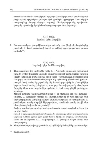 տուողներ եւս եղան Համակերպի՞լ արդեօք Համակերպութեան կողմնակիցներ : : չկային գրեթէ որոշուեցաւ դիմադրութիւն ցցունել եւ սրբագրել Բ Դռան վերջին . . առաջարկները Բաշայի միջոցաւ ուղղակի Պետերսբուրգի մէջ որովհետեւ , դեսպանը տրամադիր չէր երեւնար նոր սրբագրութիւններ ընդունելու : ––––– 4[/17] Յունվ. Ապահով Երկու Ժողովներ. I- Պատրաստուեցաւ դեսպանին տրուելիք notice մը որով մեր դժգոհութիւնը կը, [] յայտնուէր Բ Դռան . proposition- ի մասին եւ քանի մը սրբագրութիւններ կ՚առա -ջարկուէր108: ––––– 7[/20] Յունվ. Ապահով Երկու Յանձնաժողովներ. I- Դեսպանատունը մեզ յանձնած էր իրենց եւ Բ Դռան մէջ երկուստեք ընդունուած . կարգ մը կէտեր Այդ առթիւ դեսպանը պատրիարքարանի պաշտօնական կարծիքը : կ՚ուզէր գրաւոր եւ պաշտօնական թղթի վրայ Կարդացուեցաւ սեւագրութիւնը ( ): մեր կողմէ պատրաստուած notice- ին որու մէջ երկուստեք ընդունուած կէտերու առաջին մասի համար կը յայտնէինք մեր համակերպութիւնը եւ կ՚առարկէինք երկրորդ մասին համար խնդրելով որ ռուս կեդր կառավարութիւնը պէտք եղած , . միջոցներ ձեռք առնէ ապահովելու զանոնք եւ ժամ առաջ լմնցնէ բանակցու -թիւնները: Ժողովը ընդունեց պատրաստուած notice[- ] ը եւ հետեւեալ օրը երբ ներկայա -ցուցինք Ա թարգմանը խնդրեց որ երկրորդ, . notice- ով մը շատ որոշակի մեր կարծիքը յայտնենք դեռ վիճելի մնացած կէտերու մասին ինչ որ կատարուեցաւ եւ , յանձնուեցաւ առանց ժողովին ներկայացնելու որովհետեւ անոնց մասին մեր , տեսակէտները նախապէս որոշուած էին : Փափաք յայտնուեցաւ որ պնդուի անպատճառ գոնէ ապահովութեան ուժերու կէս առ կէսի մասին : Notice[- ] ը պիտի յանձնուէր հետեւեալ օրը եւ բերանացի պիտի պարզաբանուէր ապահով ուժերու կէս առ կէսի բացի Վան եւ Բիթլիզ ու Էրզրում միւս նահանգ. , , -ներու մէջ ժողովներու ⅓ ի Համիտիէներու եւ կրթական խնդրի մասին մեր - , առաջարկները: II- Դեսպանատունը փափաք յայտնած էր որ այժմէն իսկ ձեռնարկենք պատրաստելու , 108 Տես Յաւելուած 35:90 |ՀԱՅԿԱԿԱՆ ԲԱՐԵՆՈՐՈԳՈՒՄՆԵՐՈՒՆ ԱՌՆՉՈՒՈՂ ՆԻՒԹԵՐ (1912-1914)