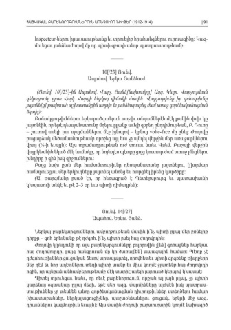Inspecteur-ներու իրաւասութեանց եւ տրուելիք հրահանգներու ուրուագիծը Կազ : -մուեցաւ յանձնաժողով մը որ պիտի զբաղի անոր պատրաստութեամբ : ––––– 10[/23] Յունվ. Ապահով Երկու Յանձնաժ. . (Յունվ. 10[/23]- ին Ապահով Վարչ Յանձ նախումբը Ազգ Կեդր Վարչութեան. . [] . . զեկուցումը ըրաւ Հայկ Հարցի ներկայ վիճակի մասին Վարչութիւնը իր գոհութիւնը . : յայտնե ց թափուած աշխատանքին առթիւ եւ յանձնարարեց ժամ առաջ գործնականացման[ ] ձգտիլ): Բանակցութիւններու երկարաձգուելուն առթիւ անդամներէն մէկ քանին վախ կը յայտնէին որ եթէ դեսպանատունը մղելու ըլլանք աւելի զօրեղ ընդդիմութեան Բ Դուռը, , . – շուտով աւելի լաւ պայմաններու մէջ իյնալով – կրնայ volte-face մը ընել Ժողովը : բացարձակ մեծամասնութեամբ որոշեց այլ եւս չը պնդել վերջին մեր առաջարկներու վրայ ⅓ ի եւայլն Այս տրամադրութեան ուժ տուաւ նաեւ Վսեմ Բաշայի վերջին ( - ): . վայրկեանին եկած մէկ նամակը որ նոյնպէս պէտքը ցոյց կուտար ժամ առաջ լմնցնելու , խնդիրը ի գին իսկ զիջումներու : Բայց նախ քան մեր համամտութիւնը դեսպանատանը յայտնելու , [ ]յ արմար համարուեցաւ մեր երկիւղները յայտնել անոնց եւ հարցնել իրենց կարծիքը : ( . Ա թարգմանը ըսած էր որ հեռագրած է Պետերսբուրգ եւ պատասխանի , կ՚սպասուի անկէ եւ թէ 2–3 օր եւս պիտի դիմադրեն ): ––––– Յունվ. 14[/27] Ապահով Երկու Յանձ. . Ներկայ բարեկարգումներու ամբողջութեան մասին ի՞նչ պիտի ըլլայ մեր բռնելիք դիրքը գոհ երեւնանք թէ դժգոհ ի՞նչ պիտի ըսել հայ ժողովրդին – . : Ժողովը կ՚ընդունի որ այս բարեկարգումները բոլորովին չ են գոհացներ հարկաւ [ ] հայ ժողովուրդը բայց հանգրուան մը կը ծառայ են ապագային համար Պէտք չէ , [ ] : դժգոհութիւններ ցուցական ձեւով արտայայտել որովհետեւ պիտի գրգռենք թիւրքերը , մեր դէմ եւ նոր աղէտներու տեղի պիտի տանք եւ միւս կողմէ ջլատենք հայ ժողովրդի ոգին որ այնքան անհամբերութեամբ մէկ տարիէ աւելի լարուած կերպով կ՚սպասէ, : Դիտել տրուեցաւ նաեւ որ ոեւէ բարենորոգում որքան ալ լայն ըլլայ չը պիտի , , , կարենայ օգտակար ըլլալ մեզի եթէ մեր ազգ մարմինները այժմէն իսկ պատրաս , . -տութիւններ չը տեսնեն անոր գործնականացման դիւրութիւններ ստեղծելու համար (փաստաբաններ ներկայացուցիչներ պաշտօնեաներու ցուցակ երկրի մէջ ազգ, , , . դիւաններու կազմութիւն եւայլն Այս մասին ժողովի քարտուղարին կողմէ նախագիծ ): ՀԱՅԿԱԿԱՆ ԲԱՐԵՆՈՐՈԳՈՒՄՆԵՐՈՒՆ ԱՌՆՉՈՒՈՂ ՆԻՒԹԵՐ (1912-1914)| 91