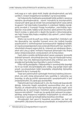 տակ ազգը օր ու արեւ պիտի տեսնէ շնորհիւ դիւանագիտութեան զոր երէկ , պոռնիկ եւ շնական մակդիրներով կ՚որակէինք եւ կը հրատարակէինք : Եթէ հակառակ մեր մարմնացեալ գաղափարին երէկի պոռնիկ եւ այսօրուայ սրբացեալ դիւանագիտութիւնը ... ազատէ Հայութիւնը իր խաչակրութենէն , ապացուցած պիտի ըլլայ իր փառքն եղող քաղաքակրթութեան պարզ դիմակ մը չըլլալուն Եթէ երեք հարիւր հազարներու եւ բովանդակ Կիլիկիոյ ողջակի : -զումը բաւական չէ Եւրոպայի Մողոքը հաշտեցնելու շարունակենք ողջա , -կիզուելու սուրբ գործը երկինք ալ եթէ չհաշտուի պիտի բթանան մեր դահիճ . , -ներուն սուրերը ու պիտի ըսեն ու վկայեն մեր կորովն ու կենսունակութիւնը , , զոր Եղիշէ հազար հինգ հարիւր տարիներէ ի վեր պահած է յանուն մոխրա , -պաշտ Մոգպետին : Թերեւս այս ալ բան մը չարժէ յաչս ոմանց սակայն ինչո՞ւ մոռնանք եւ այն . նոր վկայութիւնը զոր ողջամիտ Եւրոպան տուաւ յետ Համիտի հայակեր , գազանութեան եւ սահմանադրական կառավարութեան Կիլիկիայի եղեռնին , թէ Հայը իր քաղաքակրթական բոլոր յատկութիւններով զոհն եղաւ վայրենի եւ անասնական բնազդով ապրող ցեղի մը Հակառակ այս սփոփարար վկայու : -թեան որեւէ քայլ չը պիտի՞ համարուի ծայրագոյն յիմարութիւն մեր ձեռքով ջնջելու խեղկատակութեան առանց իրական շահ մը ձեռք բերելու , : Ըլլան թերեւս ըսողներ վրէժխնդրութեան արդար զայրոյթով կոտորածի , փոխարէն կոտորած անուրանալի իրաւունք Բայց այն ժողովուրդին համար . : , որ ուտելու հաց ունի ինքնապաշտպանութեան զէնք չունենալէ զատ նաեւ , , ցեղակից կամ կրօնակից հզօր նեցուկներ եւ յոյսեր կ՚ունենայ : Մենք ունի՞նք ցեղակիցներ Ընկերաբաններ եւ պատմագէտներ վարանքի : մէջ են այս մասին իսկ կրօնակիցներ թէեւ ունինք բայց կրօնքի էական ոգին . , թողած դաւանաբանական ճղճիմ խտրանքներ անկործանելի միջնորմներ, կանգնած են մեր եւ Եւրոպայի մէջ : Դարի կամ լայնմտութեան պահանջքին հետեւելով նախնեաց իմաստու -թեան թող ըսեն ոմանք յիմարութեան երես դարձնենք եւ կոխոտենք այս, խտրանքը որ զմեզ կը բաժնեն օրթոտոքսութենէ պապականութենէ եւ կամ, , բողոքականութենէ ի՞նչ պիտի ըլլայ վաստկածնիս. : Ինքնօրէնութիւն կամ անկախութի՞ւն ա՜խ մեր ժողովուրդի վայրավատին , , վիճակը մանաւանդ ներքին լայնափեռեկ պատառումները բնաւ յոյս չեն, ներշնչեր թէ անկախութիւնը աւելի երջանկաբեր պիտի ըլլայ ազգին որուն, , գլուխները քիչ մը պատռուեցան Օսմանեան թղթեայ սահմանադրութենէն նպաստաւորուողներէն84: Խորին ցաւ կը զգամք յիշելէ զանազան կուսակցու -թիւնները որոնք հազարաւոր տարիներու նուիրագործած, Հայ անունէն շատ աւելի փառք եւ պատիւ կը համարին իրենց նորահնար անունները : Թեւարկութիւն կամ գրաւո՞ւմ հայաբնակ գաւառներու այս կամ այն պետութենէն չեմք կարող հաշտուիլ այդ գաղափարին որ ստրկութեան լուծի. , 84 Ակնարկութիւնը դաշնակցականներուն ուղղուած է :ՆԻՒԹԵՐ ՀԱՅԿԱԿԱՆ ԲԱՐԵՆՈՐՈԳՈՒՄՆԵՐՈՒ ՎԵՐԱԲԵՐԵԱԼ (1912-1913)| 113