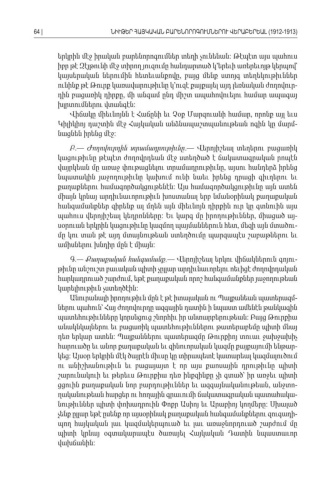 երկրին մէջ իրական բարենորոգումներ տեղի չունենան Թէպէտ այս պահուս : իբր թէ Զէյթունի մէջ տիրող յուզումը հանդարտած կ՚երեւի առերեւոյթ կերպով՝ կայսերական ներումին հետեւանքովը բայց մենք ստոյգ տեղեկութիւններ , ունինք թէ Թուրք կառավարութիւնը կ՚ուզէ քայքայել այդ լեռնական ժողովուր -դին բացառիկ դիրքը մի անգամ ընդ միշտ ապահովուելու համար ապագայ , խլրտումներու վտանգէն : Վիճակը միեւնոյնն է Հաճընի եւ Չօք Մարզուանի համար որոնք այլ եւս , Կիլիկիոյ դաշտին մէջ Հայկական անձնապաշտպանութեան ոգին կը մարմ -նացնեն իրենց մէջ : Բ.— Ժողովուրդին տրամադրութիւնը .— Վերոյիշեալ տեղերու բացառիկ կացութիւնը թէպէտ ժողովրդեան մէջ ստեղծած է ճակատագրական րոպէն վայրկեան մը առաջ փութացնելու տրամադրութիւնը այսու հանդերձ իրենց , նպատակին յաջողութիւնը կախում ունի նաեւ իրենց դրացի գիւղերու եւ քաղաքներու համագործակցութենէն Այս համագործակցութիւնը այն ատեն : միայն կրնայ արդիւնաւորութիւն խոստանալ երբ նմանօրինակ քաղաքական հանգամանքներ զիրենք ալ մղեն այն միեւնոյն դիրքին ուր կը գտնուին այս պահուս վերոյիշեալ կեդրոնները Եւ կարգ մը իրողութիւններ միացած այ : , -սօրուան երկրին կացութիւնը կազմող պայմաններուն հետ մեզի այն մտածու , -մը կու տան թէ այդ մտայնութեան ստեղծումը պարզապէս շաբաթներու եւ ամիսներու խնդիր մըն է միայն : Գ.— Քաղաքական հանգամանք .— Վերոյիշեալ երկու վիճակներուն գոյու -թիւնը անշուշտ բաւական պիտի չըլլար արդիւնաւորելու ոեւիցէ ժողովրդական հարկադրուած շարժում եթէ քաղաքական որոշ հանգամանքներ յաջողութեան , կարելիութիւն չստեղծէին : Անուրանալի իրողութիւն մըն է թէ իտալական ու Պալքանեան պատերազմ -ներու պահուն՝ Հայ ժողովուրդը ազգային դատին ի նպաստ ամենէն թանկագին պատեհութիւնները կորսնցուց շնորհիւ իր անտարբերութեան Բայց Թուրքիա : անակնկալներու եւ բացառիկ պատեհութիւններու թատերաբեմը պիտի մնայ դեռ երկար ատեն Պալքաններու պատերազմը Թուրքիոյ տուաւ ջախջախիչ : հարուածը եւ անոր քաղաքական եւ զինուորական կազմը քայքայումի ենթար -կեց Այսօր երկրին մէկ ծայրէն միւսը կը տիրապետէ կատարեալ կազմալուծում: ու անիշխանութիւն եւ բացայայտ է որ այս քաոսային դրութիւնը պիտի շարունակուի եւ թերեւս Թուրքիա դեռ ինքզինքը չի գտած՝ իր առջեւ պիտի ցցուին քաղաքական նոր բարդութիւններ եւ ազգայնականութեան անջտո , -ղականութեան հարցեր ու հողային գրաւումի ճակատագրական պատահակա -նութիւններ պիտի փոխադրուին Փոքր Ասիոյ եւ Արաբիոյ կողմերը Սխալած : չենք ըլլար եթէ ըսենք որ այսօրինակ քաղաքական հանգամանքներու զուգադի -պող հայկական լաւ կազմակերպուած եւ լաւ առաջնորդուած շարժում մը պիտի կրնայ օգտակարապէս ծառայել Հայկական Դատին նպաստաւոր վախճանին: 64 |ՆԻՒԹԵՐ ՀԱՅԿԱԿԱՆ ԲԱՐԵՆՈՐՈԳՈՒՄՆԵՐՈՒ ՎԵՐԱԲԵՐԵԱԼ (1912-1913)