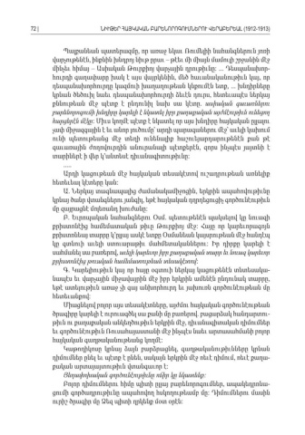 Պալքանեան պատերազմը որ առաջ եկաւ Ռումելիի նահանգներուն յոռի , վարչութենէն ինքնին խնդրոյ նիւթ ըրաւ թէեւ մի միայն մամուլի շրջանին մէջ, – մինչեւ հիմայ – Ասիական Թուրքիոյ վարչային դրութիւնը : ... Դեսպանախոր -հուրդի գաղափարը խակ է այս վայրկենին մեծ հաւանականութիւն կայ որ , , դեսպանախորհուրդը կազմուի խաղաղութեան կնքումէն ետք , ... խնդիրները կրնան ծեծուիլ նաեւ դեսպանախորհուրդի ձեւէն դուրս հետեւապէս ներկայ , քննութեան մէջ պէտք է ընդունիլ նախ սա կէտը . ասիական գաւառներու բարենորոգումի խնդիրը կարելի է նկատել իբր քաղաքական այժմէութիւն ունեցող հարցերէն մէկը : Միւս կողմէ պէտք է նկատել որ այս խնդիրը հայկական ըլլալու չափ միջազգային է եւ անոր լուծումը՝ արդի պարագաներու մէջ՝ աւելի կախում ունի պետութեանց մէջ տեղի ունենալիք հաշուեյարդարութենէն քան թէ գաւառային ժողովուրդին անուրանալի պէտքերէն զորս ինչպէս յայտնի է , տարիներէ ի վեր կ՚անտեսէ դիւանագիտութիւնը : ..... Արդի կացութեան մէջ հայկական տեսակէտով ուշադրութեան առնելիք հետեւեալ կէտերը կան : Ա Ներկայ տագնապալից ժամանակամիջոցին երկրին ապահովութիւնը. , կրնայ ծանր վտանգներու յանգիլ եթէ հայկական դղրդեցուցիչ գործունէութիւն , մը զայրացնէ մոլեռանդ խուժանը : Բ Եւրոպական նահանգներու Օսմ պետութենէն պակսելով կը նուազի. . քրիստոնէից համեմատական թիւը Թուրքիոյ մէջ Հայը որ կարեւորագոյն : քրիստոնեայ տարրը կ՚ըլլայ ասկէ ետքը Օսմանեան կայսրութեան մէջ հանդէպ կը գտնուի աւելի ստուարաթիւ մահմետականներու Իր դիրքը կարելի է : սահմանել սա բառերով , աւելի կարեւոր իբր քաղաքական տարր եւ նուազ կարեւոր քրիստոնէից թուական համեմատութեան տեսակէտով : Գ Կարելիութիւն կայ որ հայը օգտուի ներկայ կացութենէն տնտեսակա. -նապէս եւ վարչային միջավայրին մէջ իբր երկրին ամենէն ընդունակ տարրը , եթէ ատելութիւն առաջ չի գայ անխորհուրդ եւ յախուռն գործունէութեան մը հետեւանքով: Միացնելով բոլոր այս տեսակէտները այժմու հայկական գործունէութեան , ծրագիրը կարելի է ուրուագծել սա քանի մը բառերով բացարձակ հանդարտու . -թիւն ու քաղաքական անկեղծութիւն երկրին մէջ դիւանագիտական դիմումներ , եւ գործունէութիւն Ռուսահայաստանի մէջ ինչպէս նաեւ արտասահմանի բոլոր հայկական գաղթականութեանց կողմէ : Կաթողիկոսը կրնայ ձայն բարձրացնել գաղթականութիւնները կրնան , դիմումներ ընել եւ պէտք է ընեն սակայն երկրին մէջ ոեւէ դիմում ոեւէ քաղա , , -քական արտայայտութիւն վտանգաւոր է : Յեղափոխական գործունէութիւնը ոճիր կը նկատենք : Բոլոր դիմումներու հիմը պիտի ըլլայ բարենորոգումներ ապակեդրոնա , -ցումի գործադրութիւնը ապահովող հսկողութեամբ մը Դիմումներու մասին : ուրիշ ծրագիր մը Ձեզ պիտի ղրկենք մօտ օրէն : 72 |ՆԻՒԹԵՐ ՀԱՅԿԱԿԱՆ ԲԱՐԵՆՈՐՈԳՈՒՄՆԵՐՈՒ ՎԵՐԱԲԵՐԵԱԼ (1912-1913)