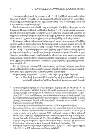 Վերոշարադրեալներով կը պարզուի թէ 1913- ի կիլիկեան ապստամբութեան ծրագիրը մշակած Կոմիտէն որ ահազանգային վիճակի մատնած էր կաթողիկոս , , պատրիարք պատուիրակութիւն եւ այլք կազմուած էր, , 1912- ի Հոկտեմբեր ամսուն եւ ունէր արտակուսակցական բնոյթ 31: Մեր համոզումով այս Կոմիտէն էր որ հեղինակած էր Կիլիկիոյ անգլիացի ռուս եւ , , ֆրանսացի հիւպատոսներուն յանձնուելու համար 1913- ի Մարտ ամսուն պատրաս -տուած ֆրանսերէն տպագիր յուշագիրը 32, զոր Գերմանիա պատրուակի վերածած էր հայկական նահանգներու բարենորոգման ծրագրին դէմ կենալու համար հարկադրելով , որ Նուպար եւ Արշարունի պատրիարք լուսաբանութիւններ տան անոր մասին 33: Ինքնավարութեան նախագիծին հիմնաւորման համար ներկայացնելով Կիլիկիոյ հայոց ընդհանուր վիճակը եւ տալով ժողովրդագրական ու այլ տուեալներ կ՚ըսուէր թէ , երկրէն դուրս մասնաճիւղեր ունեցող Ազգային Պաշտպանութեան Կոմիտէն հիմ -նուելով 1913- ի Մարտին Կիլիկիոյ զանազան կարեւոր կեդրոններու պատուիրակներով գումարուած ընդհանուր ժողովին որոշման վրայ՝ նպատակադրած է հետամուտ ըլլալ Կիլիկիոյ ինքնավարութեան իրականացման վերոնշեալ երեք պետութիւններուն , ներկայացնելով ժողովին կողմէ միաձայնութեամբ վաւերացուած յուշագիրը եւ բողո -քելով թրքական կառավարութեան՝ Թրակիայէն գաղթականներ Կիլիկիոյ մէջ բնակեց -նելու որոշման դէմ : Ինչ կը վերաբերի նախագիծին հեղինակները կ՚ըսէին թէ Կիլիկիոյ բովանդակ , հայոց ցանկութիւններն ընդգրկող ինքնավարութեան նախագիծին տրամադրութիւն -ներուն մէջ ոչինչ կայ արտառոց եւ անիրագործելի նկատուելիք : Նախագիծը կը բաղկանար 23 կէտերէ Ահաւասիկ այդ կէտերէն մի քանին: . Յօդ. 1.- Ատանայի վիլայէթին մէկ մասը եւ Հալէպի վիլայէթին մէկ մասը որոնք , անցեալին կը կազմէին Կիլիկիոյ Հայկական Թագաւորութեան ժառան -31 Արտակուսակցական բնոյթ ունենալով հանդերձ մարմինը գէթ , 26 Յունուար 1913- էնսկսեալ պիտի վայելէր ՀՍՌԿ ի Գահիրէի Ակումբին ամբողջական նեցուկը ինչպէս կը - , պարզէ ակումբին նոյն ամսաթիւով ԺԹ ընդհանուր ժողովին ատենագրութիւնը Նախա . « -գահը [= . . Մ Յ Աժտէրեան կարդաց դիւանին եռամսեայ տեղեկատուութիւնը որմէ յետոյ] բացատրելով ինքնապաշտպանութեան համար թափուած ջանքերը առաջարկեց որ այլեւս ակումբը իբր օժանդակ մարմին ամէն կերպով օգնէ նիւթապէս թէ բարոյապէս Ազգային Ինքնապաշտպանութեան Գօմիթէին : Այս առաջարկը միաձայնութեամբ ըննդունուեցաւ ՌԱԿ Կեդրոնական Արխիւ » ( ):32 La question arménienne et les solutions qu'elle comporte : un projet d'autonomie arménienne de la Cilicie : mémoire confidentiel présenté au consuls des grandes puissances en Cilicie / par le comité arménien de la défense nationale 1913 (Հայկական Հարցը Եւ Անոր Առնչուած Լուծումները Նախագիծ Կիլիկիոյ Հայկական Ինքնավարութեան Համար Խորհրդապա. . -հական Յուշագիր Ներկայացուած Մեծ Տէրութիւններու Կիլիկիոյ Հիւպատոսներուն Ազգային Պաշտպանութեան Հայկական Կոմիտէին Կողմէ Դիտելի է թէ Տամատեան ): Մարտի սկիզբէն կը գտնուէր Չորք Մարզպան Տեփոյեան (, Տամատեան, 136):33 Տեսնել մեր Հայկական Բարենորոգումներուն Առնչուող Նիւթեր (1912–1914) աշխատութիւնը (էջեր 122–123 165, եւծանօթագրութիւններով հանդերձ ):74 |ՆԻՒԹԵՐ ՀԱՅԿԱԿԱՆ ԲԱՐԵՆՈՐՈԳՈՒՄՆԵՐՈՒ ՎԵՐԱԲԵՐԵԱԼ (1912-1913)