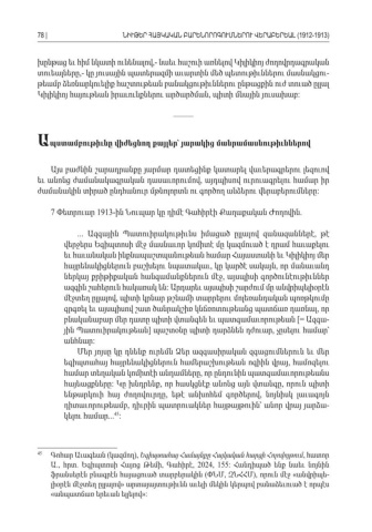 խընթաց եւ հիմ նկատի ունենալով նաեւ հաշուի առնելով Կիլիկիոյ ժողովրդագրական ,- տուեալները կը յուսային պատերազմի աւարտին մեծ պետութիւններու մասնակցու,- -թեամբ ձեռնարկուելիք հաշտութեան բանակցութիւններու ընթացքին ուժ տուած ըլլալ Կիլիկիոյ հայութեան իրաւունքներու արծարծման պիտի մնային յուսախաբ , : ––––– Ապստամբութիւնը վիժեցնող քայլեր՝ յարակից մանրամասնութիւններով Այս բաժնին շարադրանքը յարմար դատեցինք կատարել վաւերագրերու լեզուով եւ անոնց ժամանակագրական դասաւորումով այդպիսով ուրուագրելու համար իր , ժամանակին տիրած ընդհանուր մթնոլորտն ու գործող անձերու վերաբերումները : 7 Փետրուար 1913- ին Նուպար կը դիմէ Գահիրէի Քաղաքական Ժողովին . ... Ազգային Պատուիրակութիւնս իմացած ըլլալով զանազաններէ թէ , վերջերս Եգիպտոսի մէջ մասնաւոր կոմիտէ մը կազմուած է դրամ հաւաքելու եւ հաւանական ինքնապաշտպանութեան համար Հայաստանի եւ Կիլիկիոյ մեր հայրենակիցներուն բաշխելու նպատակաւ կը կարծէ սակայն որ մանաւանդ , , ներկայ քրիթիքական հանգամանքներուն մէջ այսպիսի գործունէութիւններ , ազգին շահերուն հակառակ են Արդարեւ այսպիսի շարժում մը անվրիպելիօրէն : մէջտեղ ըլլալով պիտի կրնար թշնամի տարրերու մոլեռանդական պոռթկումը , գրգռել եւ այսպիսով շատ ծանրակշիռ կնճռոտութեանց պատճառ դառնալ որ , բնականաբար մեր դատը պիտի վտանգեն եւ պատգամաւորութեան [= Ազգա -յին Պատուիրակութեան պաշտօնը պիտի դարձնեն դժուար չըսելու համար՝ ] , անհնար: Մեր յոյսը կը դնենք ուրեմն Ձեր ազգասիրական զգացումներուն եւ մեր եգիպտահայ հայրենակիցներուն համերաշխութեան ոգիին վրայ համոզելու , համար տեղական կոմիտէի անդամները որ ընդունին պատգամաւորութեանս , հայեացքները Կը խնդրենք որ հասկցնէք անոնց այն վտանգը որուն պիտի: , , ենթարկուի հայ ժողովուրդը եթէ անխոհեմ գործերով նոյնիսկ լաւագոյն , , դիտաւորութեամբ դիւրին պատրուակներ հայթայթուին՝ անոր վրայ յարձա, -կելու համար ... : 45 45 Գոհար Աւագեան կազմող (), Եգիպտահայ Համայնքը Հայկական հարցի Հոլովոյթում , հատոր Ա հրտ Եգիպտոսի Հայոց Թեմի Գահիրէ., . , , 2024, 155: Հանդիպած ենք նաեւ նոյնին ֆրանսերէն բնագրէն հայացուած տարբերակին ՓՆՄ ԶՆՀՀՄ որուն մէջ անվրիպե (, ), « -լիօրէն մէջտեղ ըլլալով արտայայտութիւնն աւելի մեկին կերպով բանաձեւուած է որպէս » «անպատճառ երեւան ելլելով »:78 |ՆԻՒԹԵՐ ՀԱՅԿԱԿԱՆ ԲԱՐԵՆՈՐՈԳՈՒՄՆԵՐՈՒ ՎԵՐԱԲԵՐԵԱԼ (1912-1913)