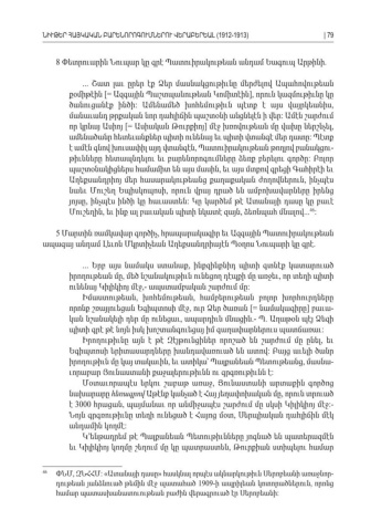 8 Փետրուարին Նուպար կը գրէ Պատուիրակութեան անդամ Եագուպ Արթինի . ... Շատ լաւ ըրեր էք Ձեր մասնակցութիւնը մերժելով Ապահովութեան քօմիթէին [= Ազգային Պաշտպանութեան Կոմիտէին որուն կազմութիւնը կը ], ծանուցանէք ինծի Ամենամեծ խոհեմութիւն պէտք է այս վայրկեանիս : , մանաւանդ թրքական նոր դահլիճին պաշտօնի անցնելէն ի վեր Ամէն շարժում : որ կրնայ Ասիոյ [= Ասիական Թուրքիոյ մէջ խռովութեան մը վախը ներշնչել ] , ամենածանր հետեւանքներ պիտի ունենայ եւ պիտի վտանգէ մեր դատը Պէտք : է ամէն գնով խուսափիլ այդ վտանգէն Պատուիրակութեան թողլով բանակցու , -թիւնները հետապնդելու եւ բարենորոգումները ձեռք բերելու գործը Բոլոր : պաշտօնակիցներս համամիտ են այս մասին եւ այս մտքով գրեցի Գահիրէի եւ , Աղեքսանդրիոյ մեր հասարակութեանց քաղաքական ժողովներուն ինչպէս , նաեւ Մուշեղ Եպիսկոպոսի որուն վրայ դրած են ամբոխավարները իրենց , յոյսը ինչպէս ինծի կը հաւաստեն Կը կարծեմ թէ Ատանայի դասը կը բաւէ, : Մուշեղին եւ ինք ալ բաւական պիտի նկատէ զայն ձեռնպահ մնալով, , ... : 46 5 Մարտին ռամկավար գործիչ հրապարակագիր եւ Ազգային Պատուիրակութեան , ապագայ անդամ Լեւոն Մկրտիչեան Աղեքսանդրիայէն Պօղոս Նուպարի կը գրէ . ... Երբ այս նամակս ստանաք ինքզինքնիդ պիտի գտնէք կատարուած , իրողութեան մը մեծ նշանակութիւն ունեցող դէպքի մը առջեւ որ տեղի պիտի , , ունենայ Կիլիկիոյ մէջ ապստամբական շարժում մը ,- : Իմաստութեան խոհեմութեան համբերութեան բոլոր խորհուրդները, , որոնք շռայլուեցան Եգիպտոսի մէջ ուր Ձեր ծառան , [= նամակագիրը բաւա] -կան նշանակելի դեր մը ունեցաւ ապարդիւն մնացին Պ Աղաթօն պէյ Ձեզի , .- . պիտի գրէ թէ նոյն իսկ խոշտանգուեցայ իմ գաղափարներուս պատճառաւ : Իրողութիւնը այն է թէ Զէյթունցիներ որոշած են շարժում մը ընել եւ , Եգիպտոսի երիտասարդները խանդավառուած են ատով Բայց աւելի ծանր : իրողութիւն մը կայ տակաւին եւ ատիկա՝ Պալքանեան Պետութեանց մասնա , , -ւորաբար Յունաստանի քաջալերութիւնն ու գրգռութիւնն է : Մօտաւորապէս երկու շաբաթ առաջ Յունաստանի արտաքին գործոց , նախարարը հեռագրով Աթէնք կանչած է Հայ յեղափոխական մը որուն տրուած , է 3000 հրացան պայմանաւ որ անմիջապէս շարժում մը սկսի Կիլիկիոյ մէջ, :- Նոյն գրգռութիւնը տեղի ունեցած է Հայոց մօտ Սերպիական դահլիճին մէկ , անդամին կողմէ : Կ՚ենթադրեմ թէ Պալքանեան Պետութիւնները յոգնած են պատերազմէն եւ Կիլիկիոյ կողմը շեղում մը կը պատրաստեն Թուրքիան ստիպելու համար , 46 ՓՆՄ ԶՆՀՀՄ Ատանայի դասը հասկնալ որպէս ակնարկութիւն Սերոբեանի առաջնոր, : « » -դութեան յանձնուած թեմին մէջ պատահած 1909- ի ապրիլեան կոտորածներուն որոնց , համար պատասխանատուութեան բաժին վերագրուած էր Սերոբեանի : ՆԻՒԹԵՐ ՀԱՅԿԱԿԱՆ ԲԱՐԵՆՈՐՈԳՈՒՄՆԵՐՈՒ ՎԵՐԱԲԵՐԵԱԼ (1912-1913)| 79
